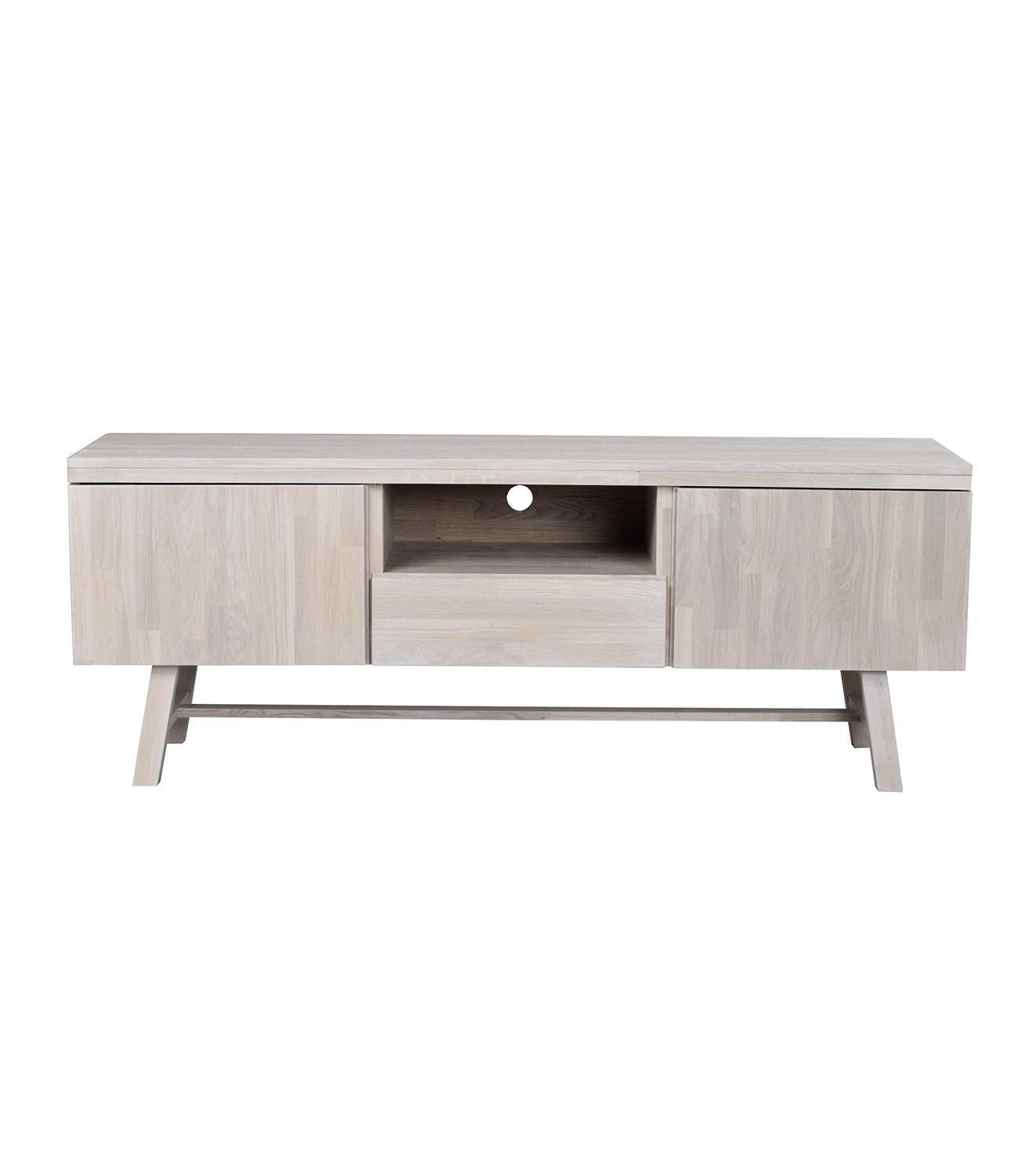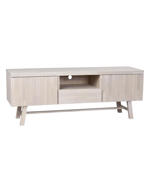 Das TV-Lowboard BROOKLYN besteht aus massivem Eichenholz in Weiß und verfügt über eine geölte Oberflächenbehandlung. Es ist mit zwei Türen, einer Schublade sowie einem offenen Ablagefach mit integriertem Kabeldurchlass ausgestattet. Das Möbelstück hat eine Breite von 160 cm, eine Höhe von 60 cm und eine Tiefe von 45 cm.