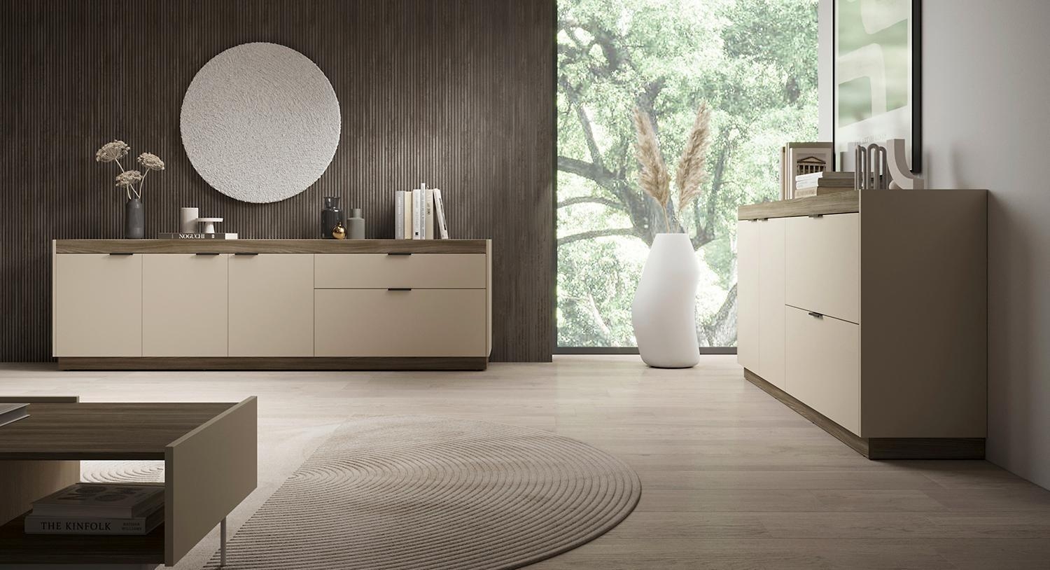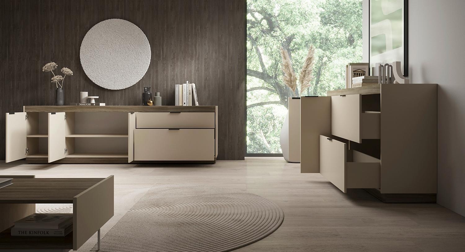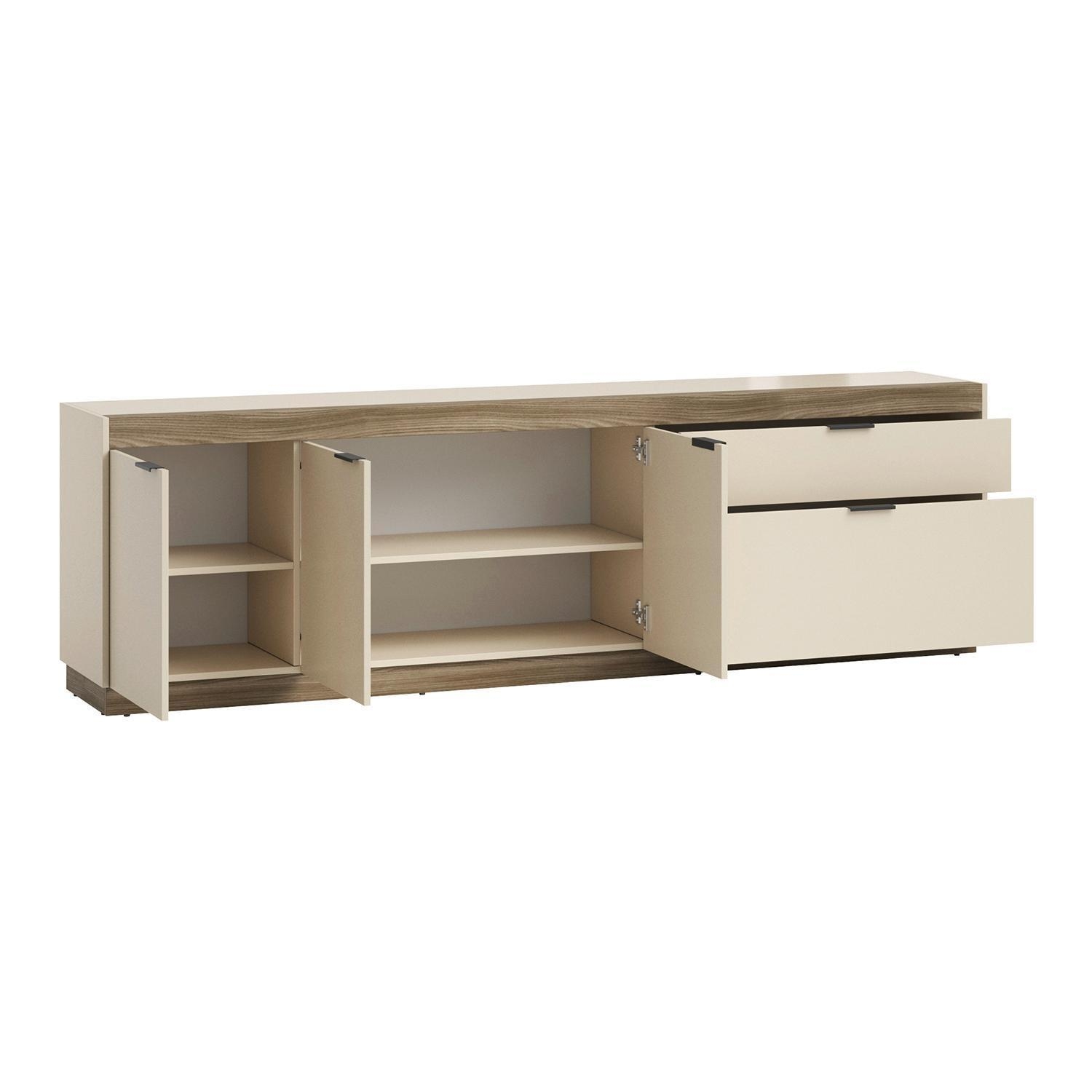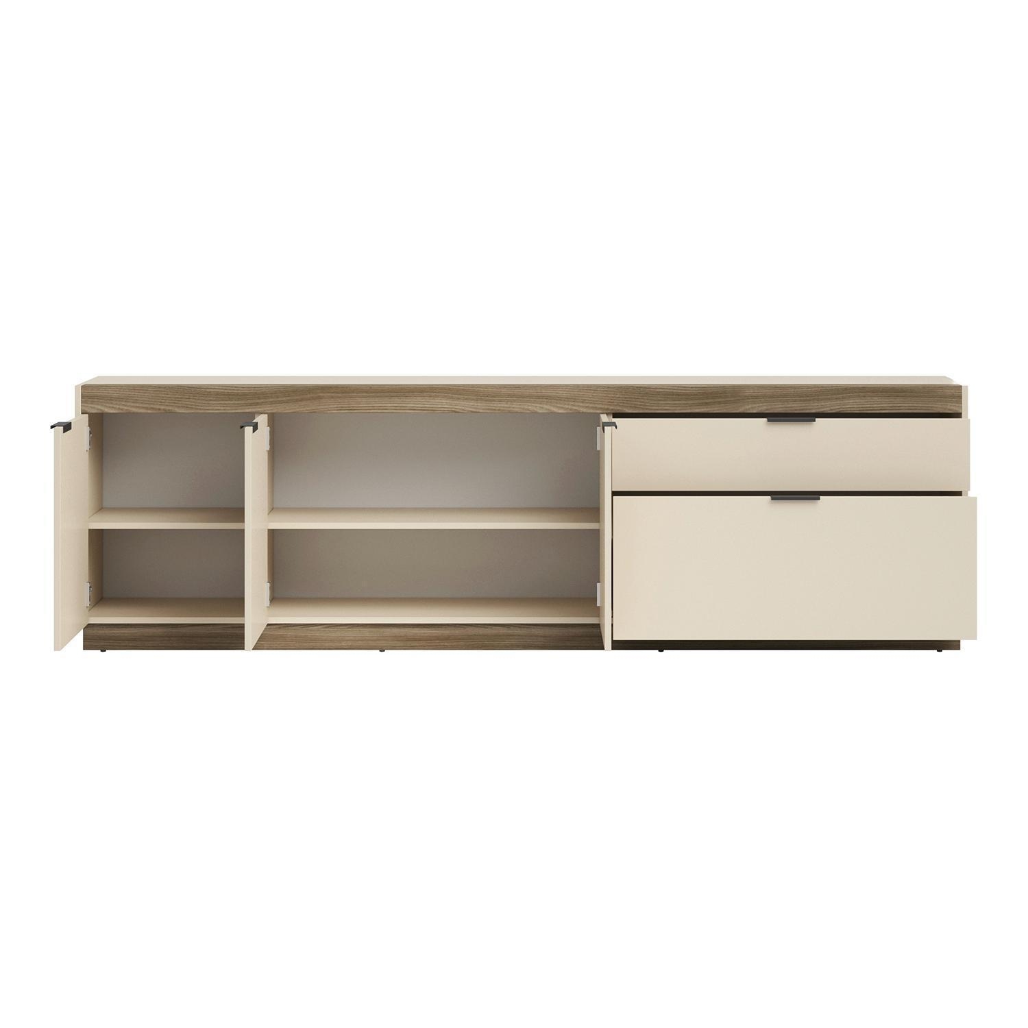 Das TV Lowboard JANA ist in Sandgrau gehalten und verfügt über Absetzungen im Praline Elm Dekor. Es ist mit zwei Türen, einer Klappe und einer Schublade ausgestattet und enthält zwei Einlegeböden. Die Breite beträgt 228 cm, die Höhe 69 cm und die Tiefe 40 cm.