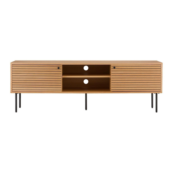 Das TV Lowboard KOBE verfügt über einen Korpus aus MDF in Braun und Fronten aus Eichenholzfurnier, ebenfalls in Braun. Das Gestell besteht aus schwarzem Metall und sorgt für Stabilität. Das Sideboard verfügt über zwei Türen und zwei offenen Ablagefächern mit je einem Kabeldurchlass. Die Maße des Fernsehschranks betragen 150 cm in der Breite, 50 cm in der Höhe und 40 cm in der Tiefe.