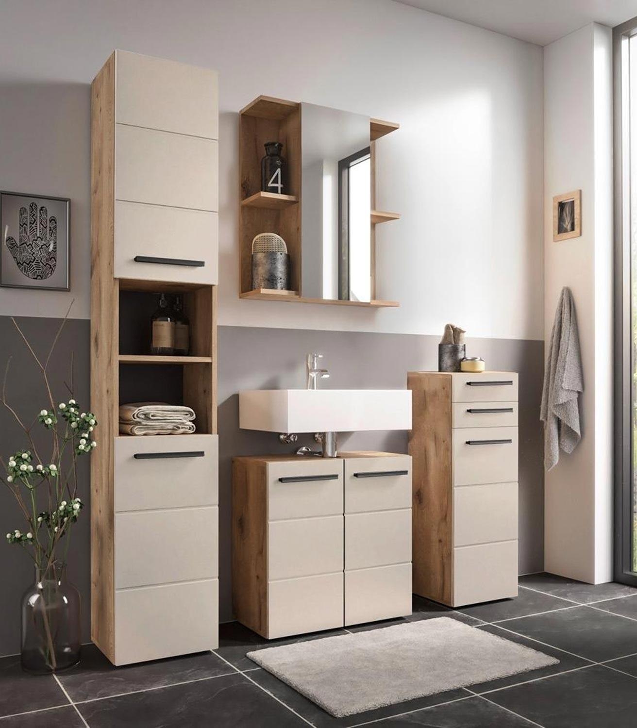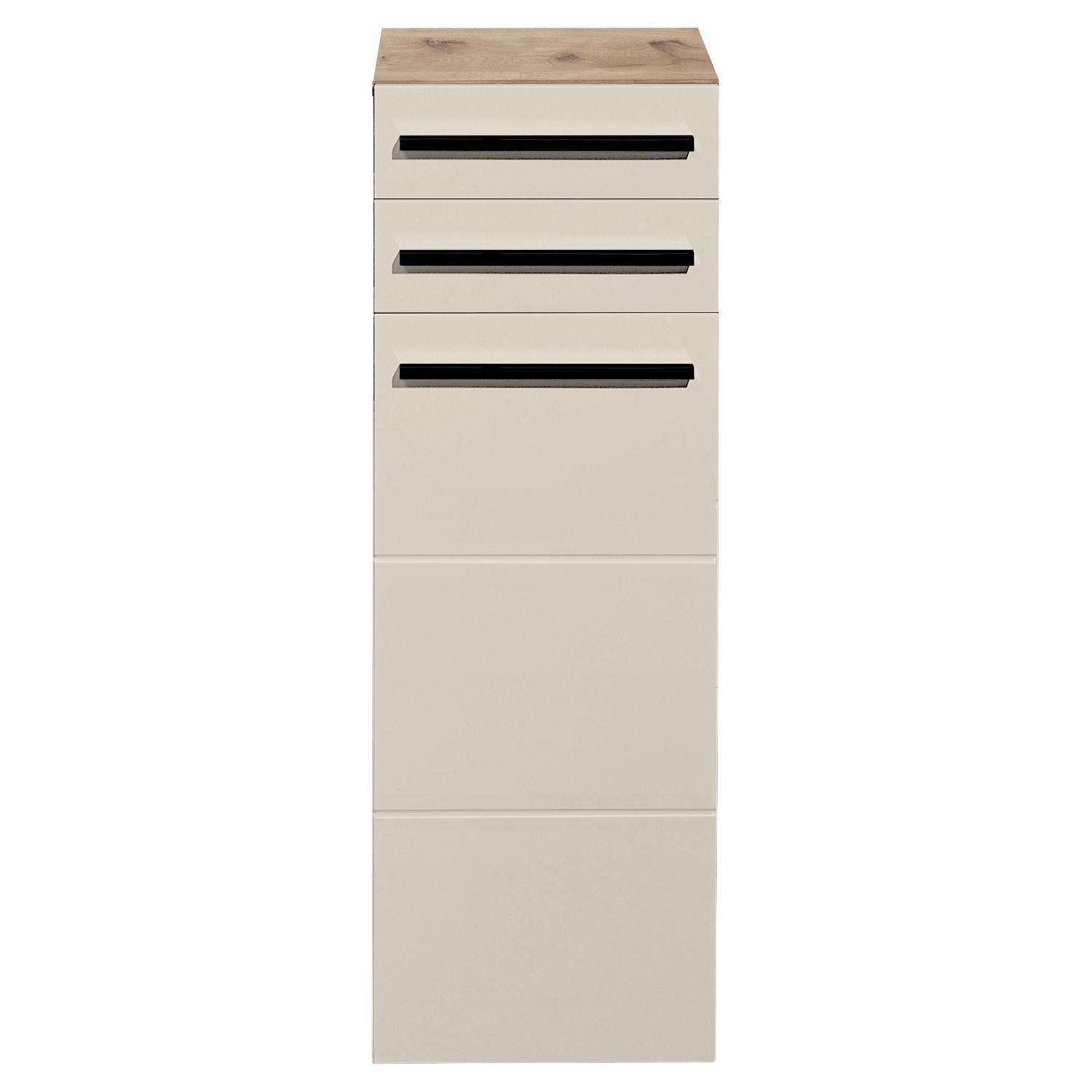 Der Unterschrank SPLIT aus Holzwerkstoff in Viking Eiche Dekor bietet eine elegante und praktische Aufbewahrungslösung. Die sandfarbenen Fronten aus foliertem MDF harmonieren perfekt mit den mattschwarzen Kunststoffgriffen. Hinter einer Tür befinden sich zwei Einlegeböden, die viel Platz für verschiedene Gegenstände bieten. Zusätzlich verfügt der Schrank über zwei Schubladen, die weiteren Stauraum schaffen. Mit einer Breite von 34 cm, einer Höhe von 104 cm und einer Tiefe von 31 cm eignet sich der Schrank ideal für kleinere Räume.