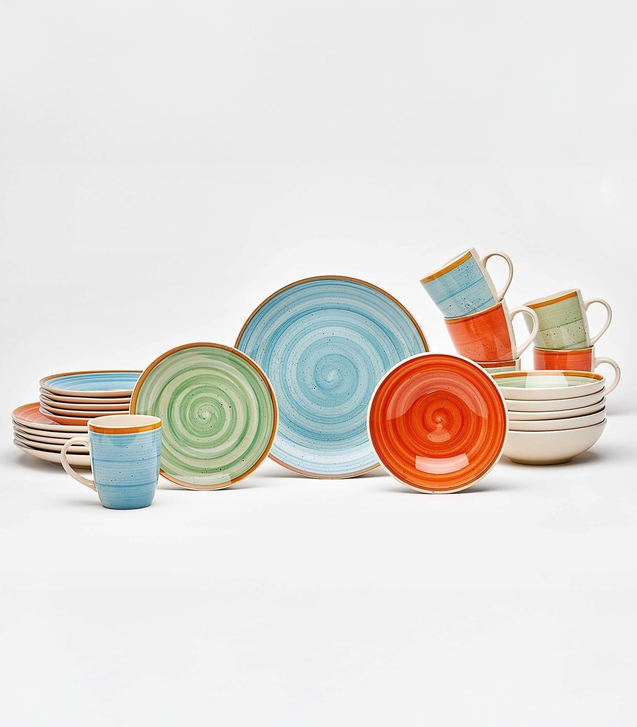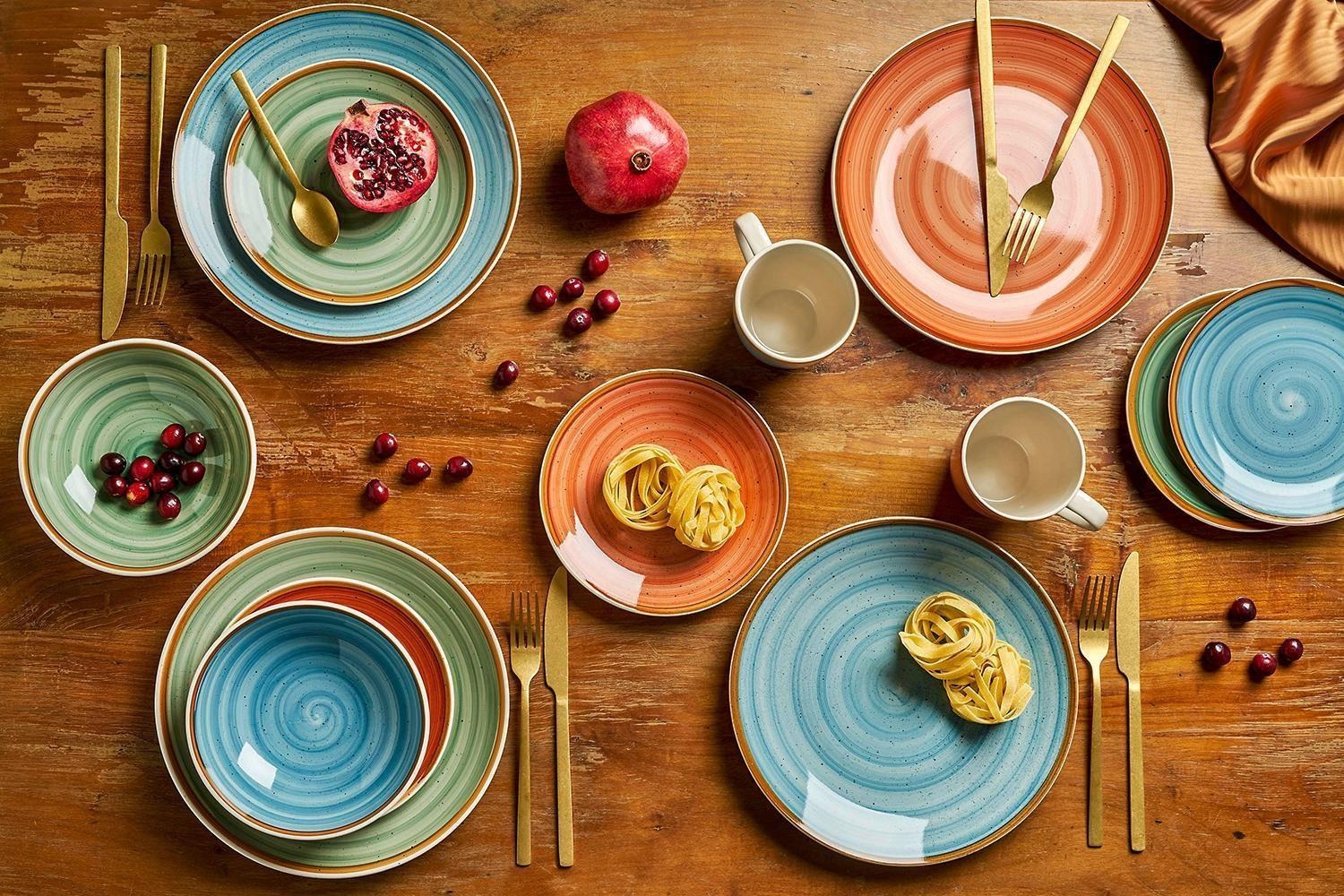 Das Kombiservice MAGNIFICA von der Marke Van Well ist ein 24-teiliges Set aus Steingut, das für bis zu sechs Personen konzipiert ist. Die verschiedenfarbigen Komponenten weisen ein gestreiftes Muster auf. Das Set umfasst jeweils sechs Speiseteller, Frühstücksteller, Kaffeetassen und Müslischalen. Ein praktischer Vorteil ist die Eignung des gesamten Services für die Nutzung in der Mikrowelle sowie für die Reinigung in der Spülmaschine.