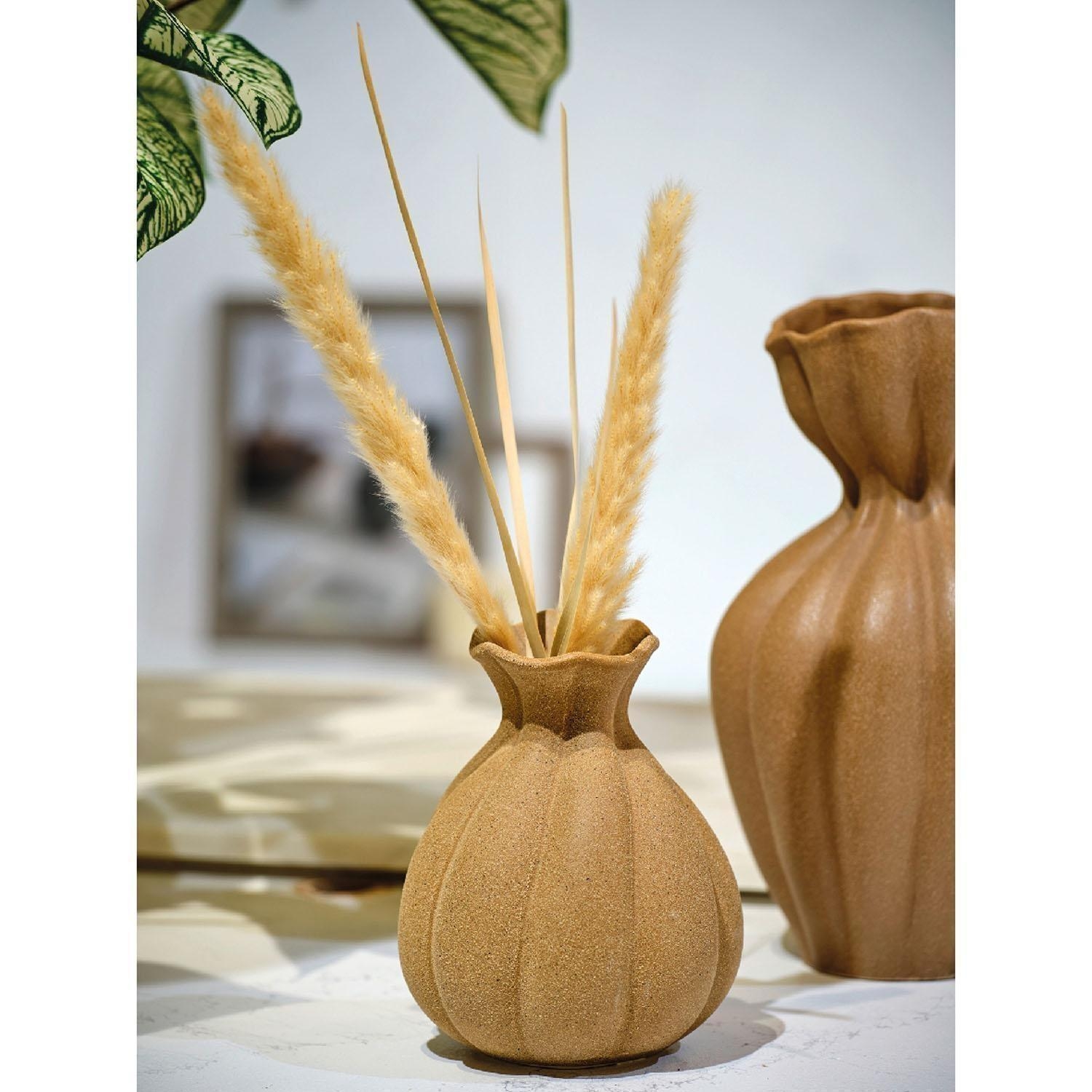 Die Vase KORILA besticht durch ihre attraktive Form in Braun, gefertigt aus Steingut Mit einer Höhe von 18,3 cm ist sie vielseitig einsetzbar und für Trockenpflanzen geeignet. Bitte beachten Sie, dass die Vase von Hand abgewischt werden sollte.