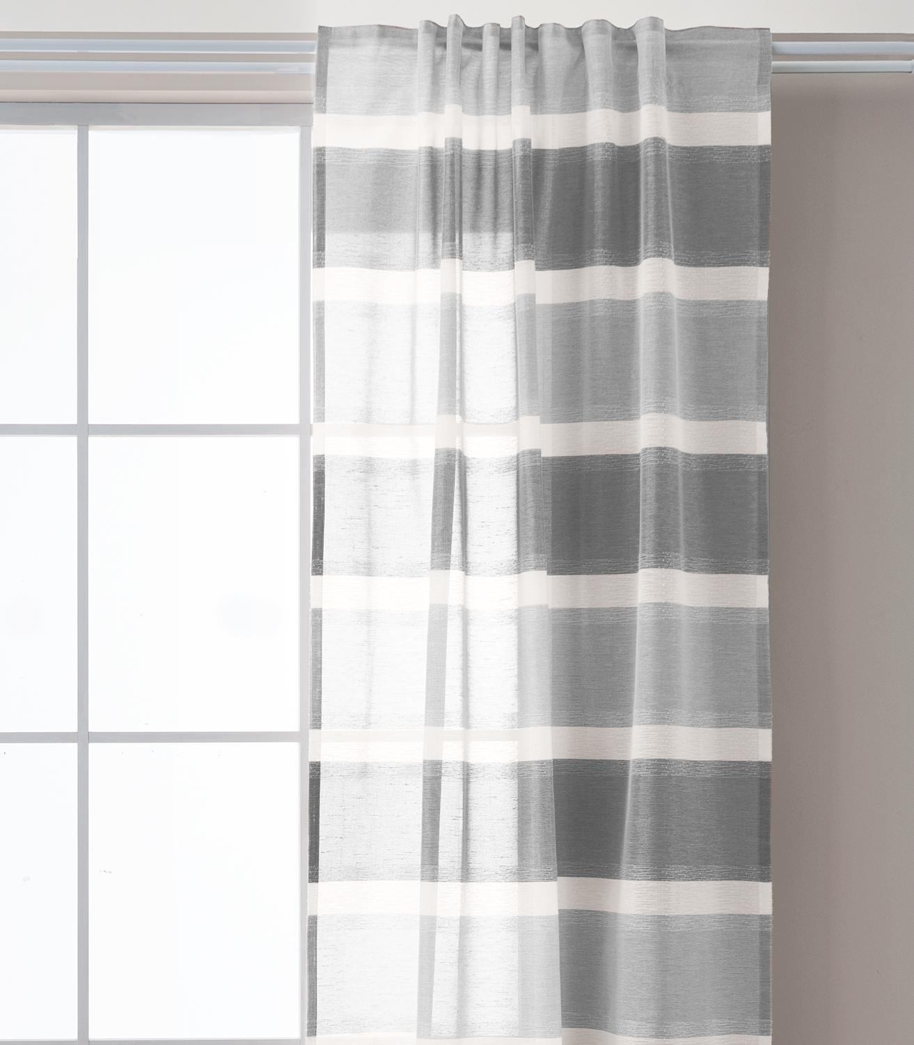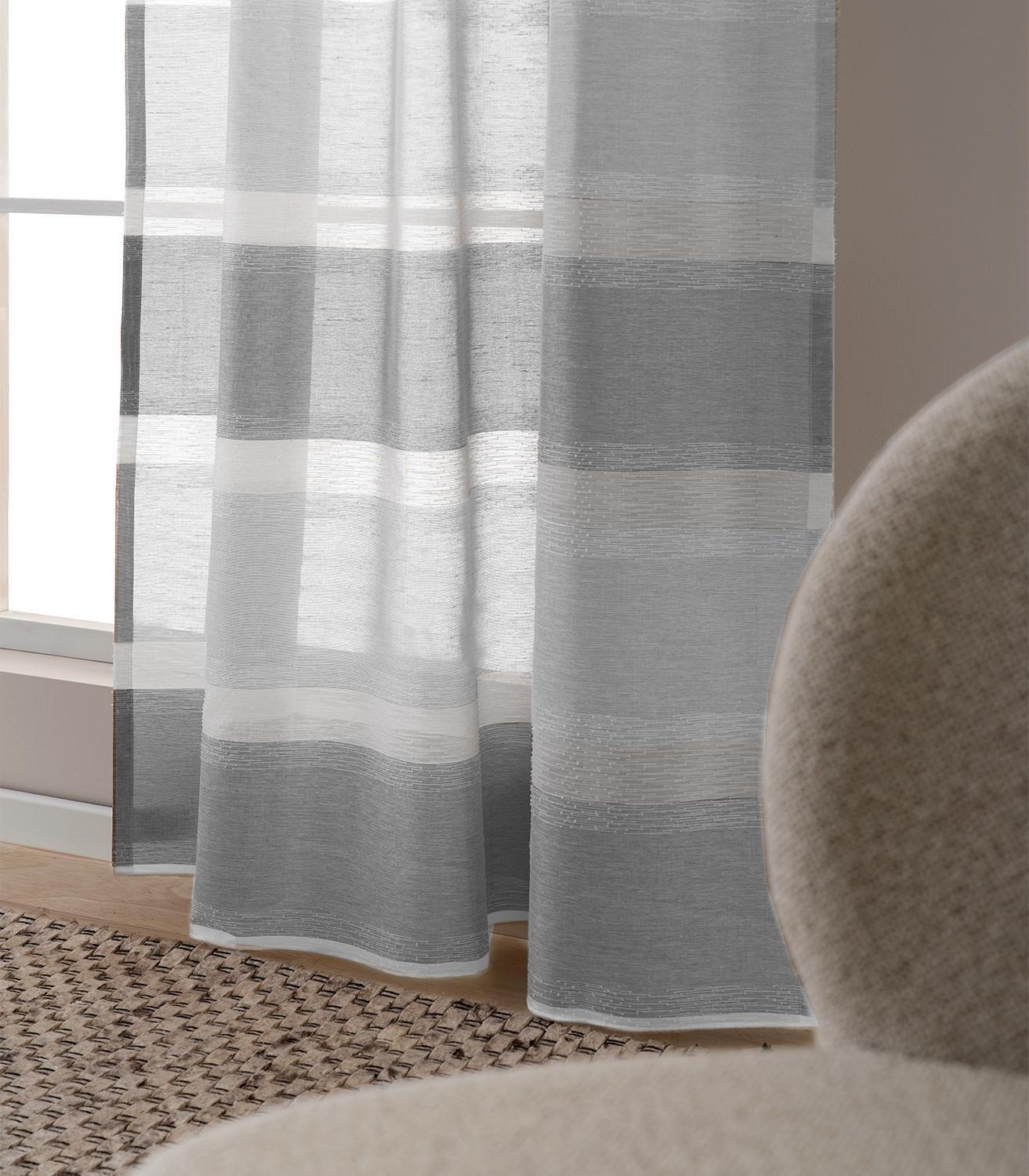 Der Schlaufenschal NIKOLA in Silbergrau und Weiß setzt mit seinem modernen Querstreifenmuster stilvolle Akzente und sorgt für eine freundliche Raumwirkung. Gefertigt aus 100 % Polyester überzeugt der transparente Stoff durch seine leichte, luftige Optik und lässt viel Tageslicht in den Raum. Mit den Maßen 135 x 245 cm bietet er großzügige Abdeckung für Fenster und Türen. Dank verdeckter Schlaufen lässt sich der Schal einfach anbringen. Zudem ist er bei 40 °C waschbar und pflegeleicht – ideal für zeitgemäße Wohnkonzepte.