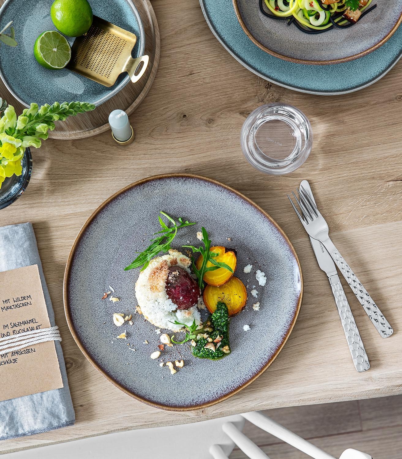 Durch Effektglasuren entstehen bei diesem Geschirr einzigartige Dekore, die jedes Teil zu einem Unikat machen. Diese gewollten Unregelmäßigkeiten und Unebenheiten, die während des Herstellungsprozesses entstehen, machen den besonderen Charme dieses Geschirrs aus. So gleicht kein Teil dem anderen.