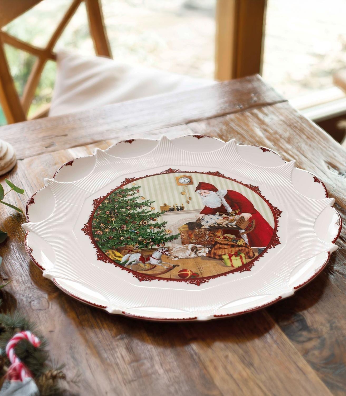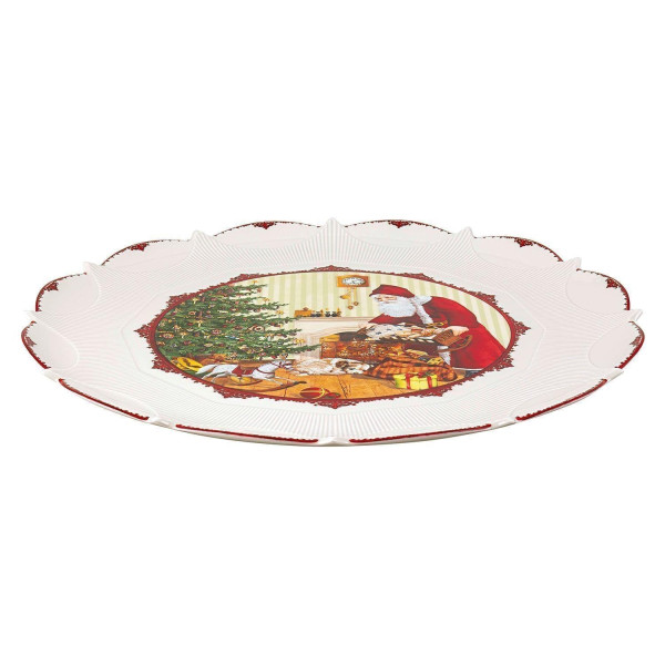 Der Gebäckteller TOYS FANTASY der Marke Villeroy & Boch besteht aus Porzellan in den Farben Rot und Weiß. Er zeigt ein Motiv mit Weihnachtsmann und Geschenken. Mit einem Durchmesser von 42 cm und einer Höhe von 2,5 cm bietet der Teller Platz zum Anrichten von Gebäck oder anderen Speisen. Der Teller ist mikrowellengeeignet und kann zum Erwärmen von Lebensmitteln verwendet werden. Es wird empfohlen, ihn von Hand zu reinigen.
