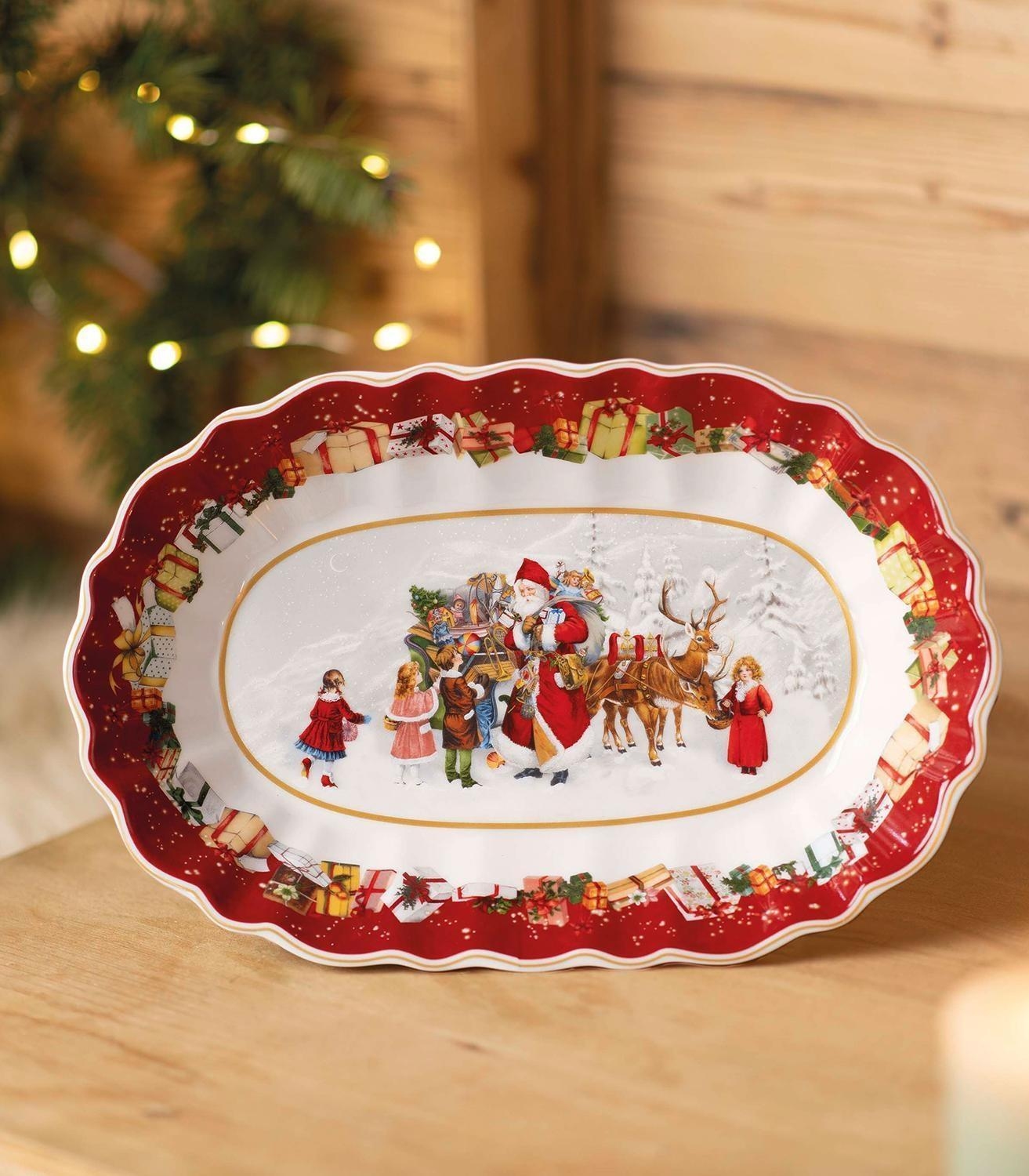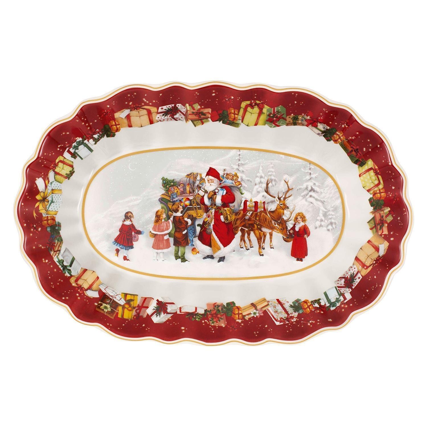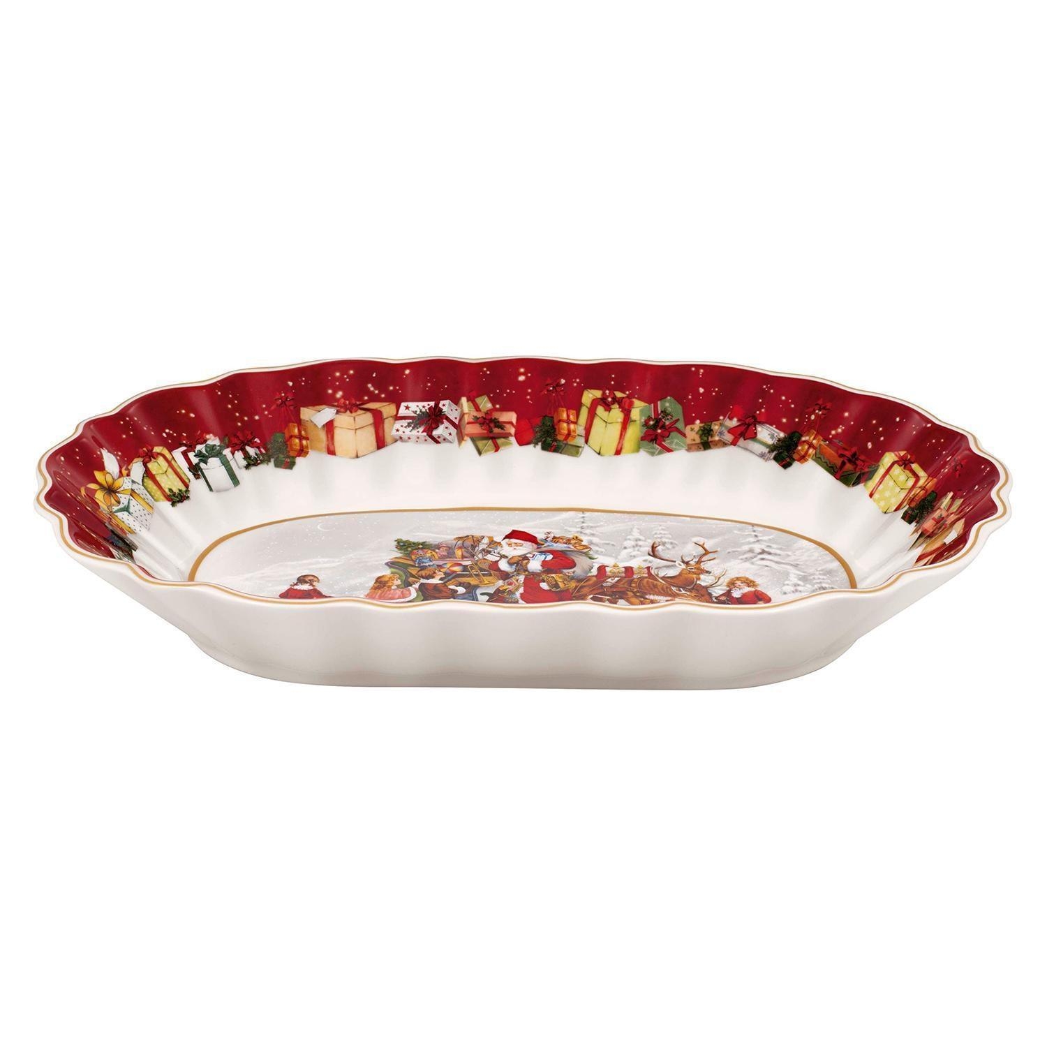 Die Servierschale TOYS FANTASY der Marke Villeroy & Boch besteht aus Porzellan in den Farben Rot und Weiß. Sie zeigt ein Motiv mit Weihnachtsmann und Kindern. Mit einer Breite von 29 cm, einer Höhe von 4,9 cm und einer Tiefe von 19 cm bietet die Schale ausreichend Platz zum Servieren von Speisen. Die Schale ist mikrowellengeeignet und für die Reinigung wird Handwäsche empfohlen.