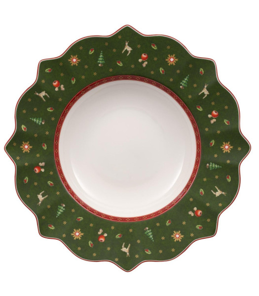 Der Suppenteller TOY’S DELIGHT der Marke Villeroy & Boch besteht aus Porzellan in den Farben Grün, Rot und Weiß. Er ist mit weihnachtlichen Motiven verziert und eignet sich für den Einsatz in der Mikrowelle. Für die Reinigung wird Handwäsche empfohlen. Der Teller hat einen Durchmesser von 26 cm und eine Höhe von 4,8 cm.