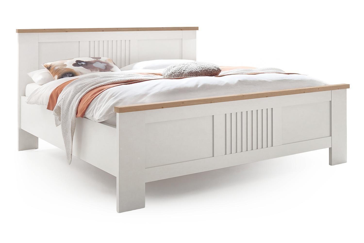Das Bettgestell LINATE der Marke vito ist in Weiß gestaltet und verfügt über Absetzungen in Bianco Eiche Dekor. Der Bettrahmen weist eine Breite von 192 cm, eine Tiefe von 210 cm sowie eine Gesamthöhe von 104 cm auf. Die Liegefläche dieses Doppelbettes bemisst 180 x 200 cm bei einer Bettkantenhöhe sowie Bettrahmenhöhe von 48 cm. Die Lieferung erfolgt ohne Lattenrost und Matratze. Die Fertigung erfolgt in Deutschland.