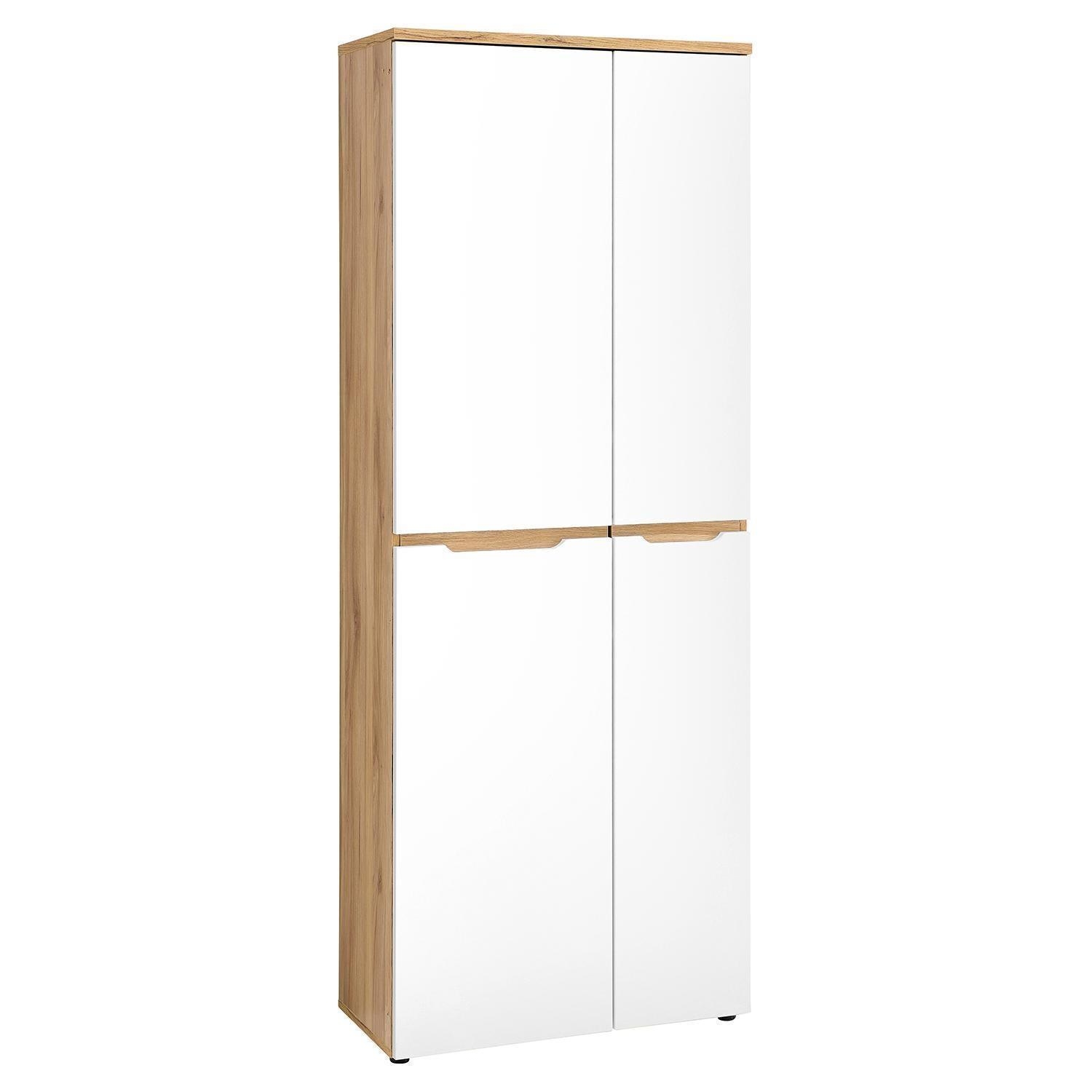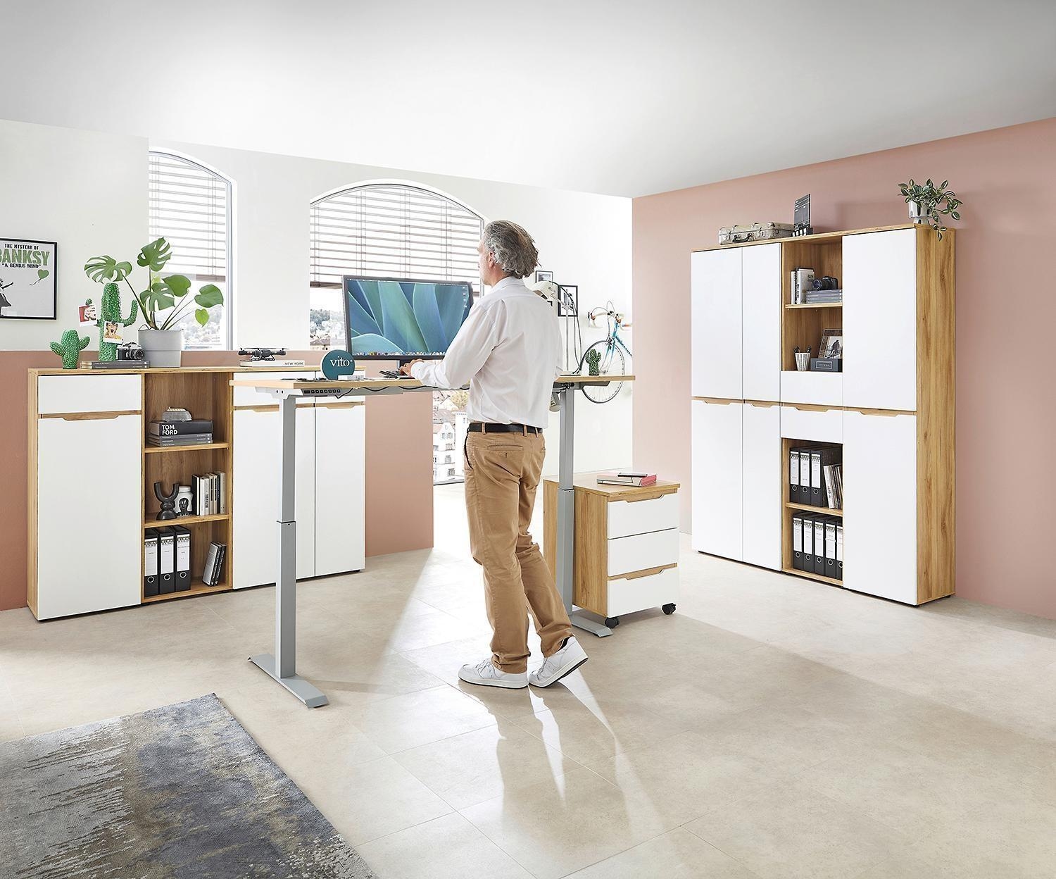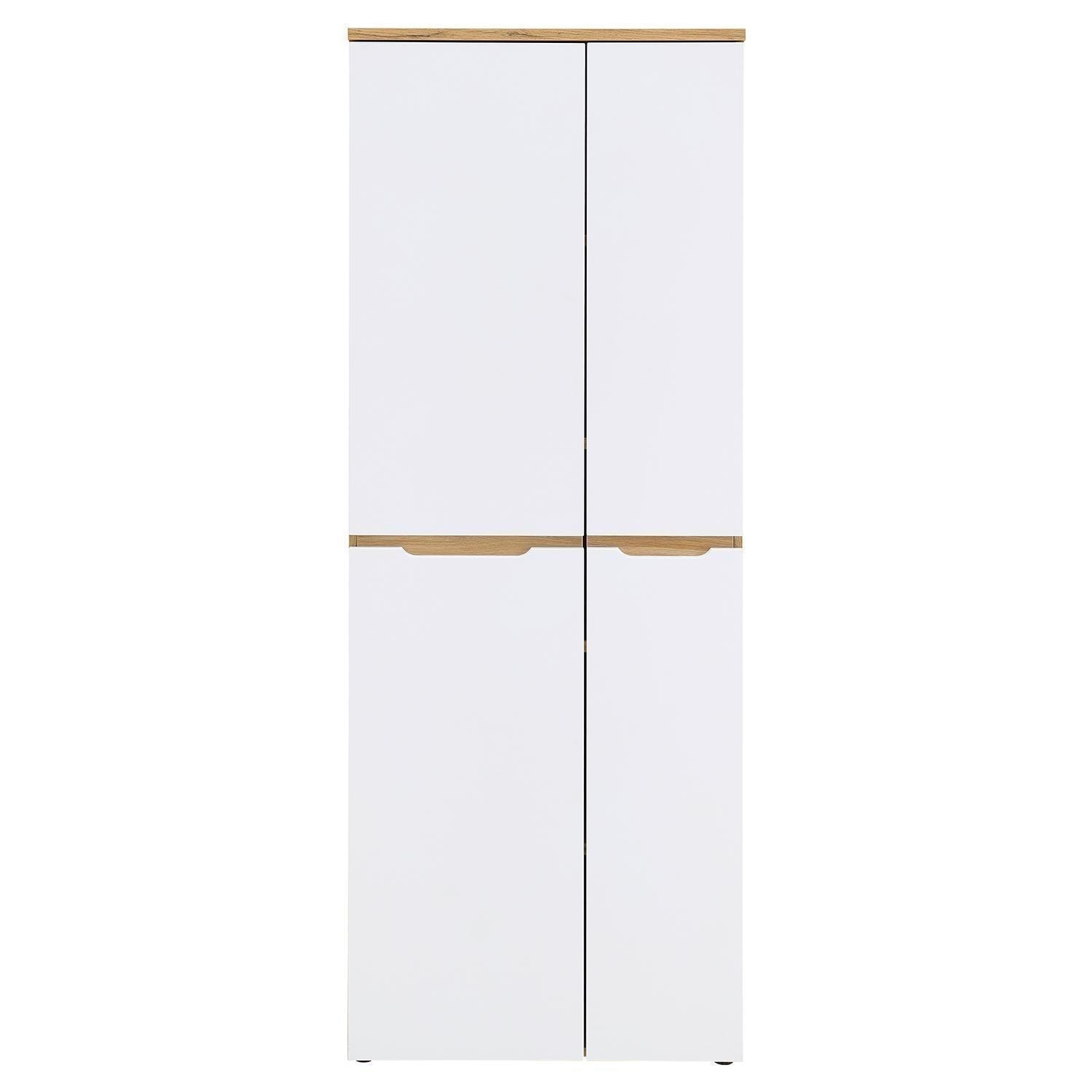 Der Büroschrank CLYDE der Marke vito besteht aus Mauvella Eiche Dekor und verfügt über Fronten in Weiß supermatt. Er ist mit vier Türen ausgestattet, die eine Soft-Close-Funktion haben. Im Inneren befinden sich ein fester sowie drei höhenverstellbare Einlegeböden. Die Maße betragen 75 cm in der Breite, 197 cm in der Höhe und 38 cm in der Tiefe.