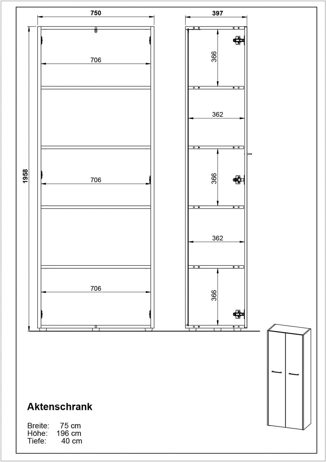 | Lieferumfang: | 1 Büroschrank mit 2 Türen und 4 Einlegeböden |