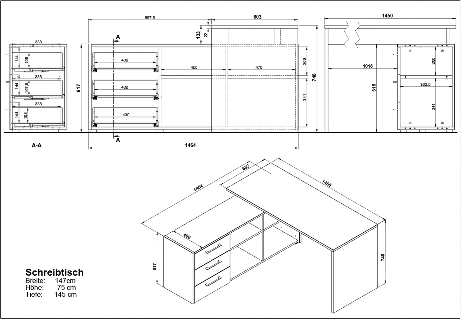 | Lieferumfang: | 1 Eckschreibtisch mit 4 offenen Ablageflächen und 3 Schubladen |
