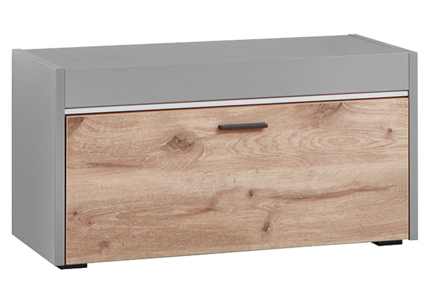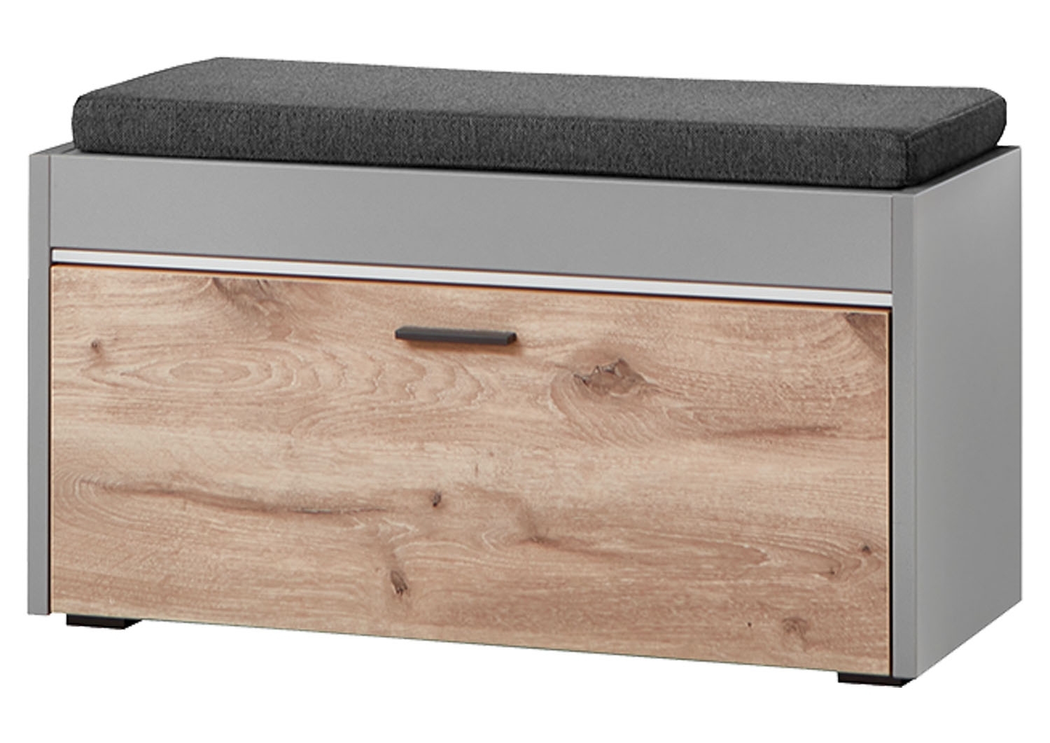 Die Garderobenbank SERATA der Marke vito präsentiert sich als elegante Ergänzung für jeden Eingangsbereich. Mit einer hellgrauen Farbgebung und einer Teilfront in Nox Eiche Dekor verleiht sie dem Raum eine moderne Note. Die Bank verfügt über eine Klappe für zusätzlichen Stauraum und ist mit einer LED-Frontbeleuchtung ausgestattet, die für eine angenehme Atmosphäre sorgt. Mit einer Breite von 85 cm, einer Höhe von 45 cm und einer Tiefe von 37 cm bietet sie ausreichend Platz zum Sitzen und Aufbewahren von Schuhen oder anderen Accessoires.