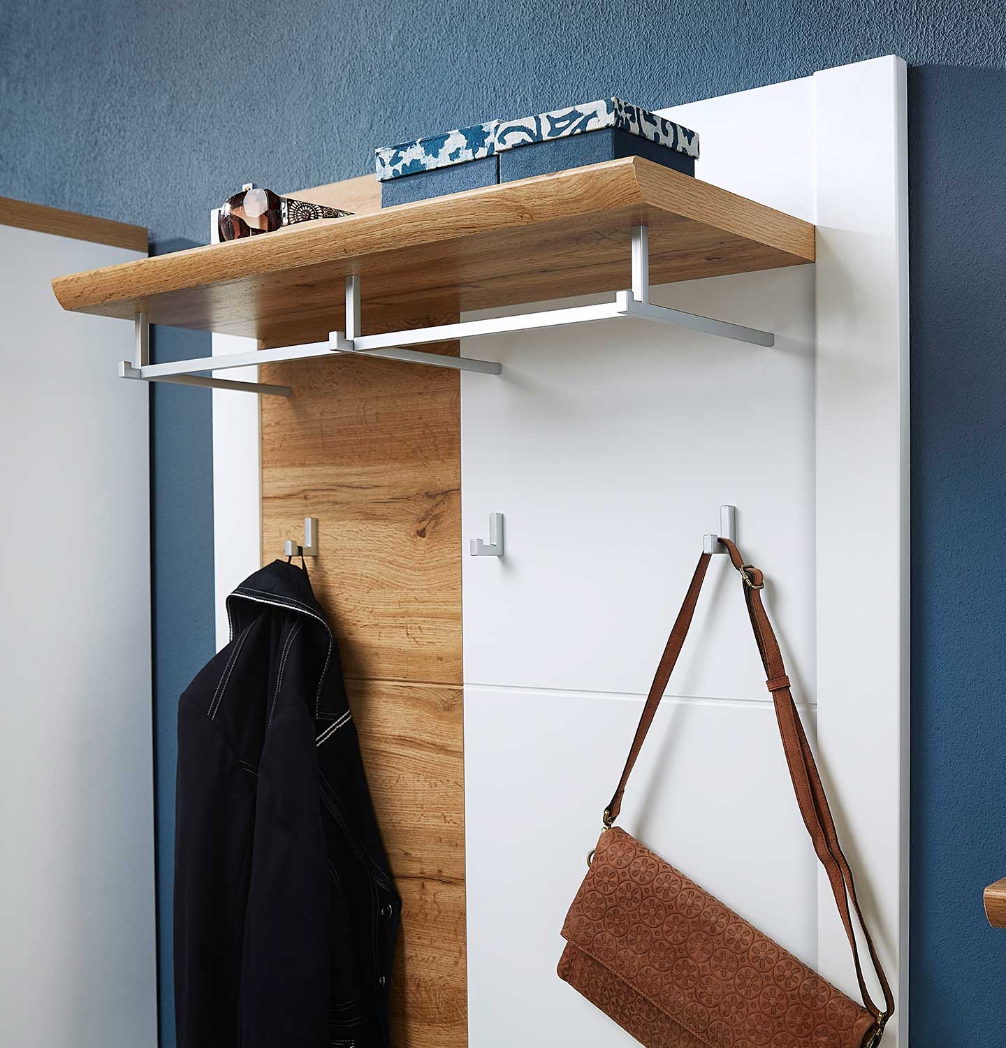 | Lieferumfang: | 1 Garderobenpaneel mit 1 Kleiderstange, 3 Kleiderhaken und 1 Hutablage |