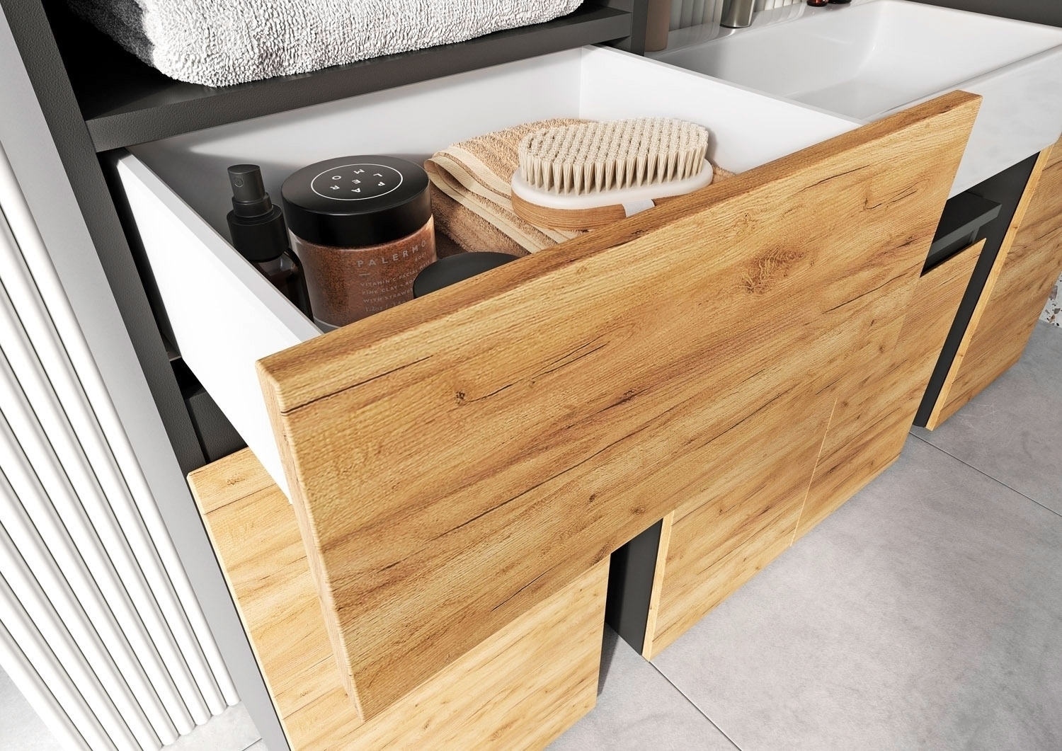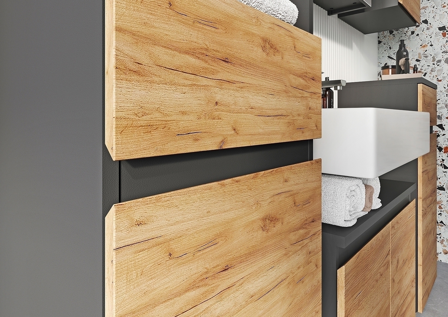 Soft-Close-Funktion: Die Soft-Close-Funktion schließt die Türen und die Schublade ab einem gewissen Punkt sanft von alleine. Ein lautes oder unkontrolliertes Zufallen wird vermieden.