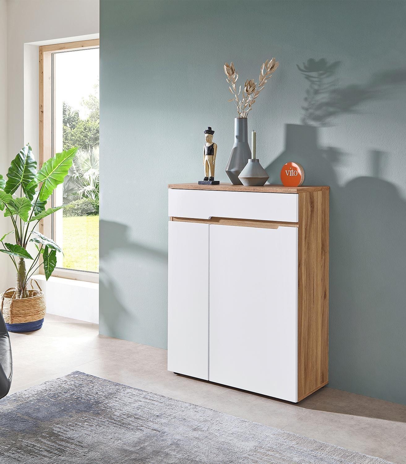 Die Kommode CLYDE der Marke vito ist im Mauvella Eiche Dekor gestaltet und mit Fronten in Weiß supermatt versehen. Sie ist mit zwei Türen sowie einer Schublade ausgestattet, die alle über eine Soft-Close-Funktion verfügen. Im Inneren befinden sich drei dreifach höhenverstellbare Einlegeböden, die jeweils bis zu 5 kg tragen können. Die Maße der Kommode betragen 80 cm in der Breite, 107 cm in der Höhe und 38 cm in der Tiefe.