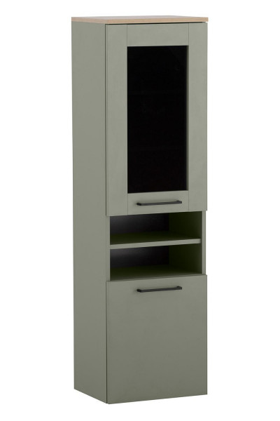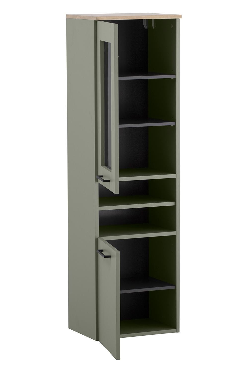 Der Midischrank MALO der Marke vito ist in Pistaziengrün gehalten und verfügt über eine Oberplatte in hellem Eiche-Dekor. Die Oberfläche ist mit einer Melaminharzbeschichtung versehen, die Griffe sind aus schwarzem Metall. Der Schrank ist mit einer Glastür und einer Tür mit Soft-Close-Funktion ausgestattet. Im Inneren befinden sich vier Einlegeböden. Die Maße betragen 40 cm in der Breite, 140 cm in der Höhe und 32 cm in der Tiefe.