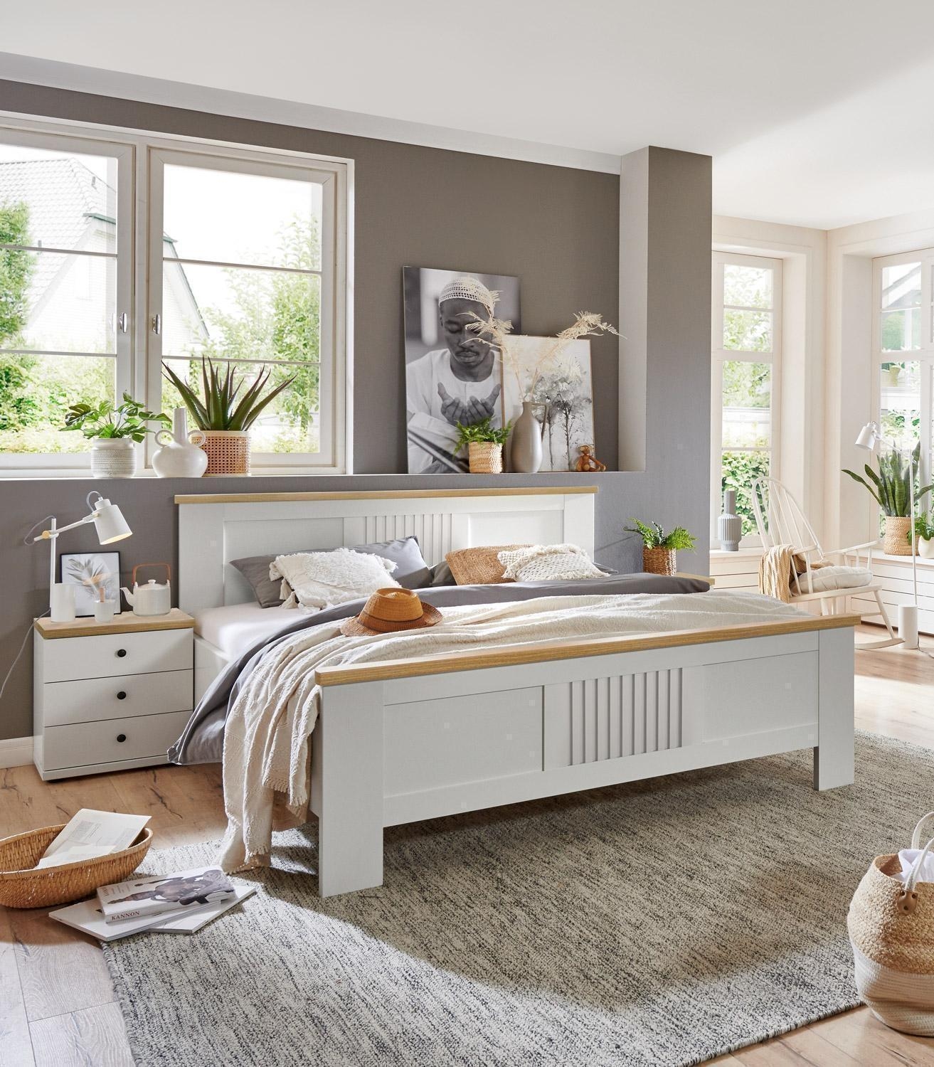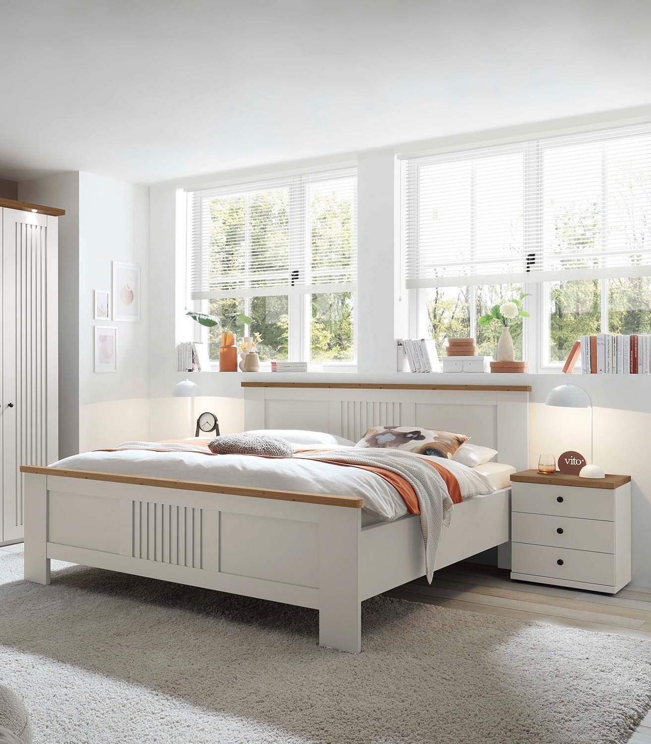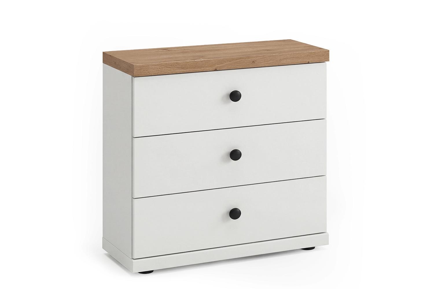 Der Nachttisch LINATE der Marke vito ist in Weiß gehalten und verfügt über eine Oberplatte in Bianco Eiche Dekor. Diese Nachtkonsole bietet auf einer Breite von 50 cm, einer Höhe von 57 cm und einer Tiefe von 36 cm insgesamt drei Schubladen. Die Fertigung dieser Kommode erfolgt in Deutschland.