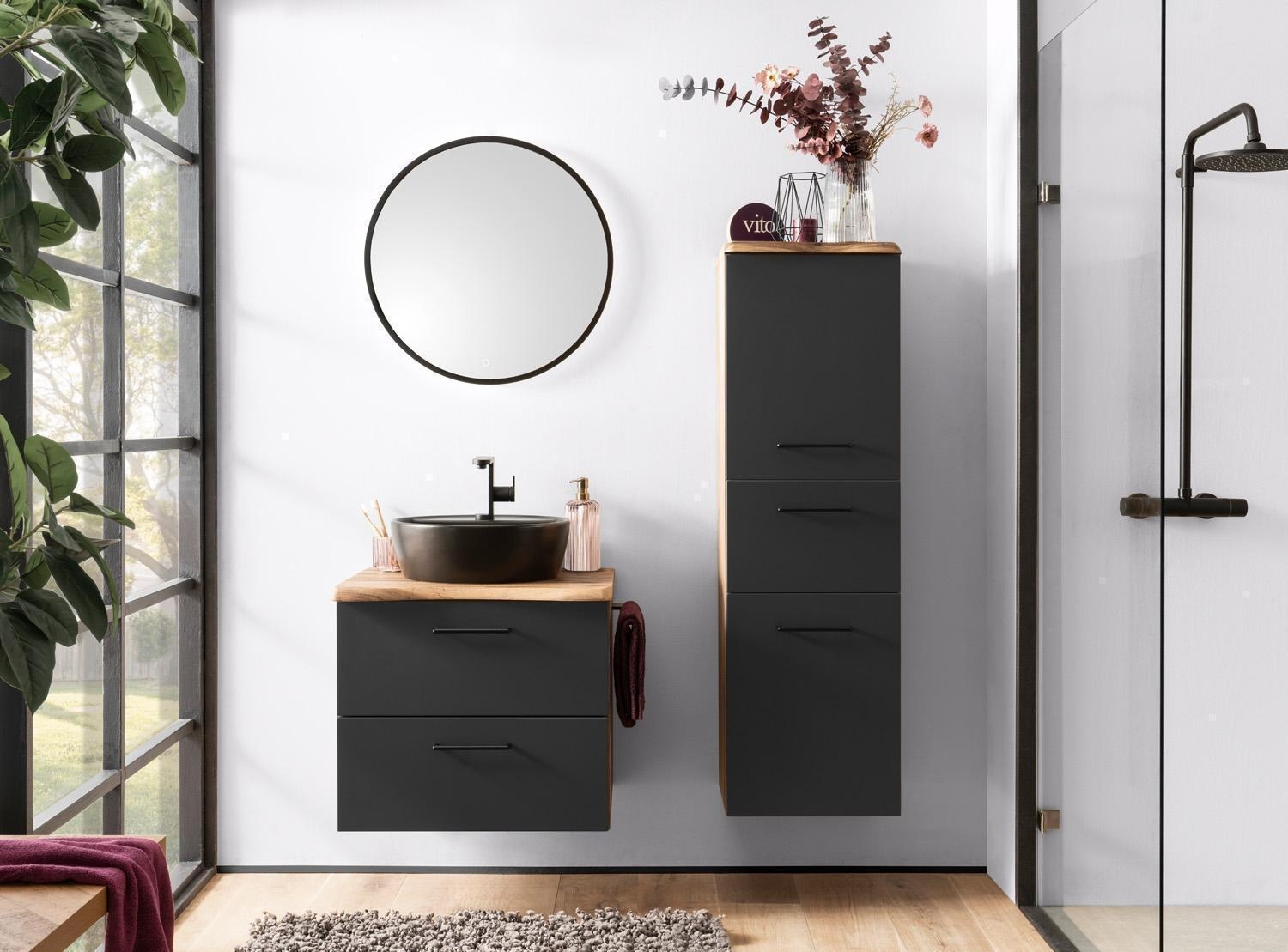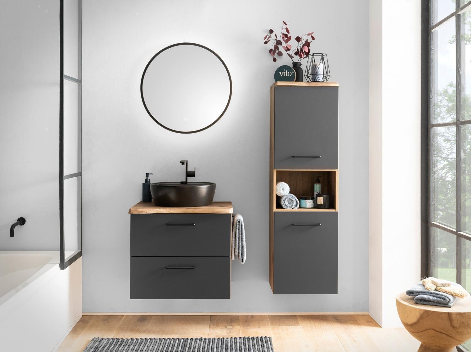 Der Spiegel KEYTO von vito ist aus Glas und hat einen Durchmesser von 60 cm. Der Rahmen aus Metall ist in Schwarz gehalten. Der Spiegel ist mit einer LED-Beleuchtung ausgestattet, die über einen Touchsensor gesteuert wird. Der Spiegel wird in Deutschland produziert.