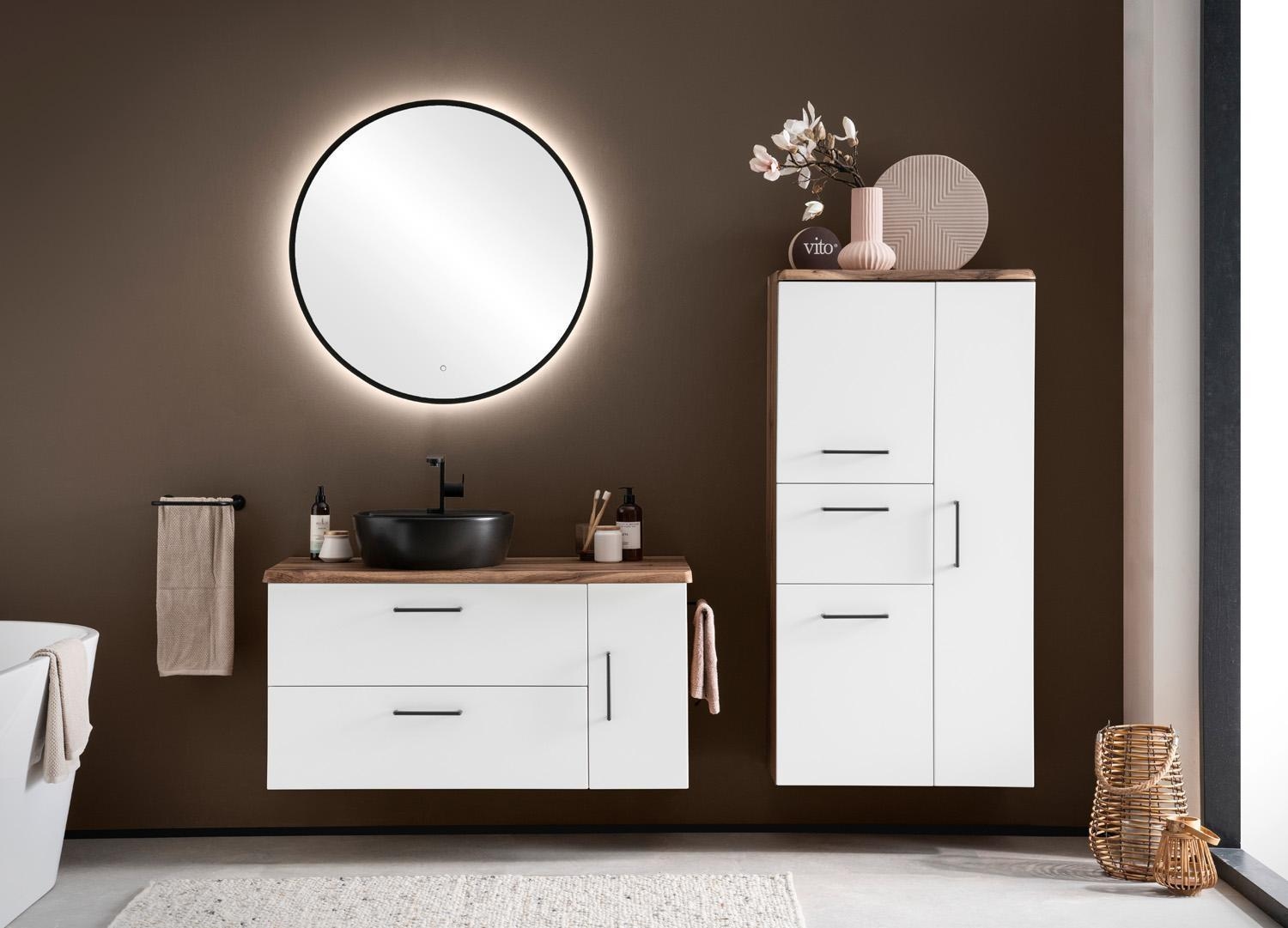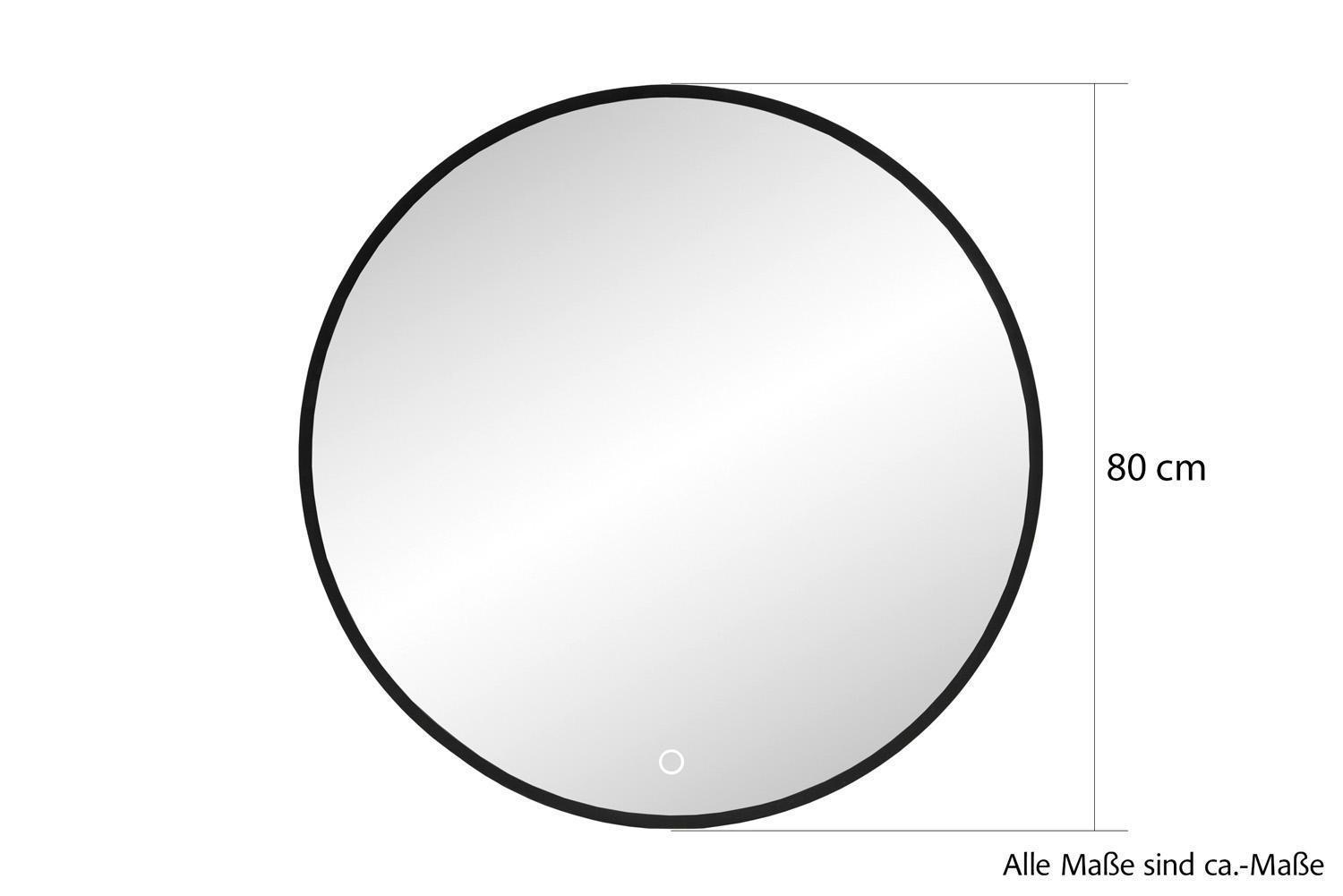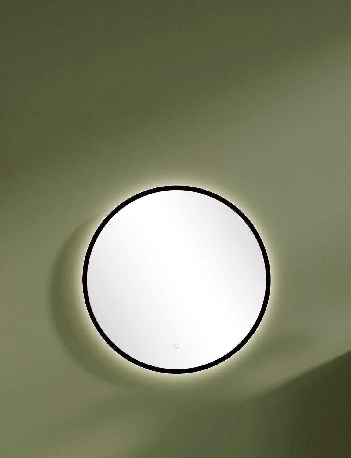 Der Spiegel KEYTO von vito ist aus Glas und hat einen Durchmesser von 80 cm. Der Rahmen aus Metall ist in Schwarz gehalten. Der Spiegel ist mit einer LED-Beleuchtung ausgestattet, die über einen Touchsensor gesteuert wird. Der Spiegel wird in Deutschland produziert.