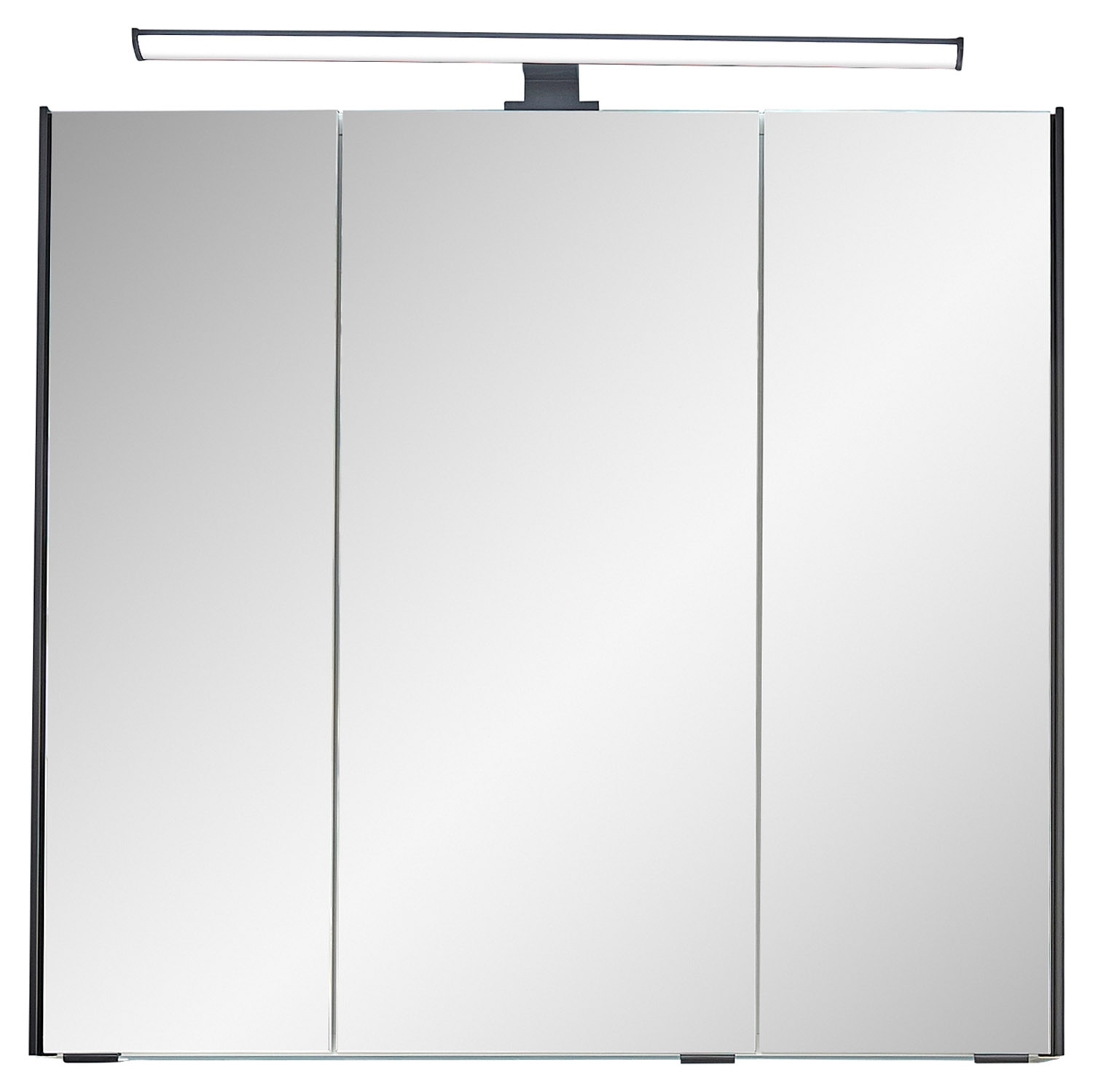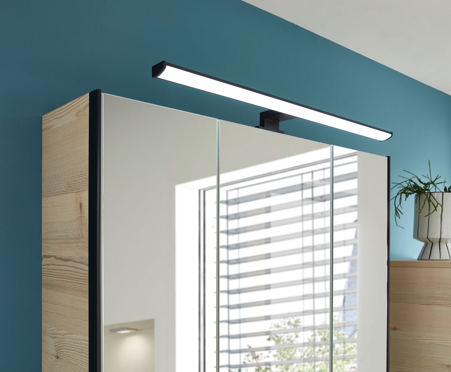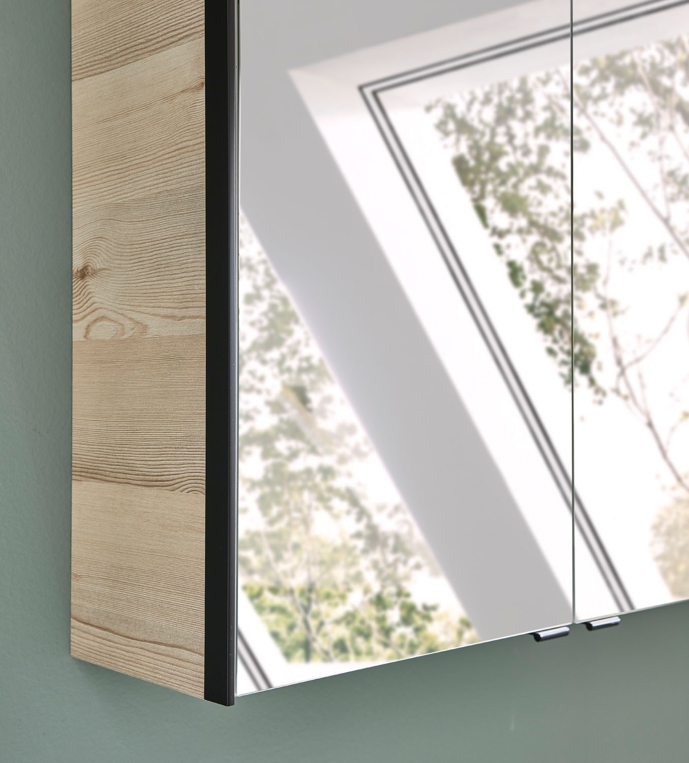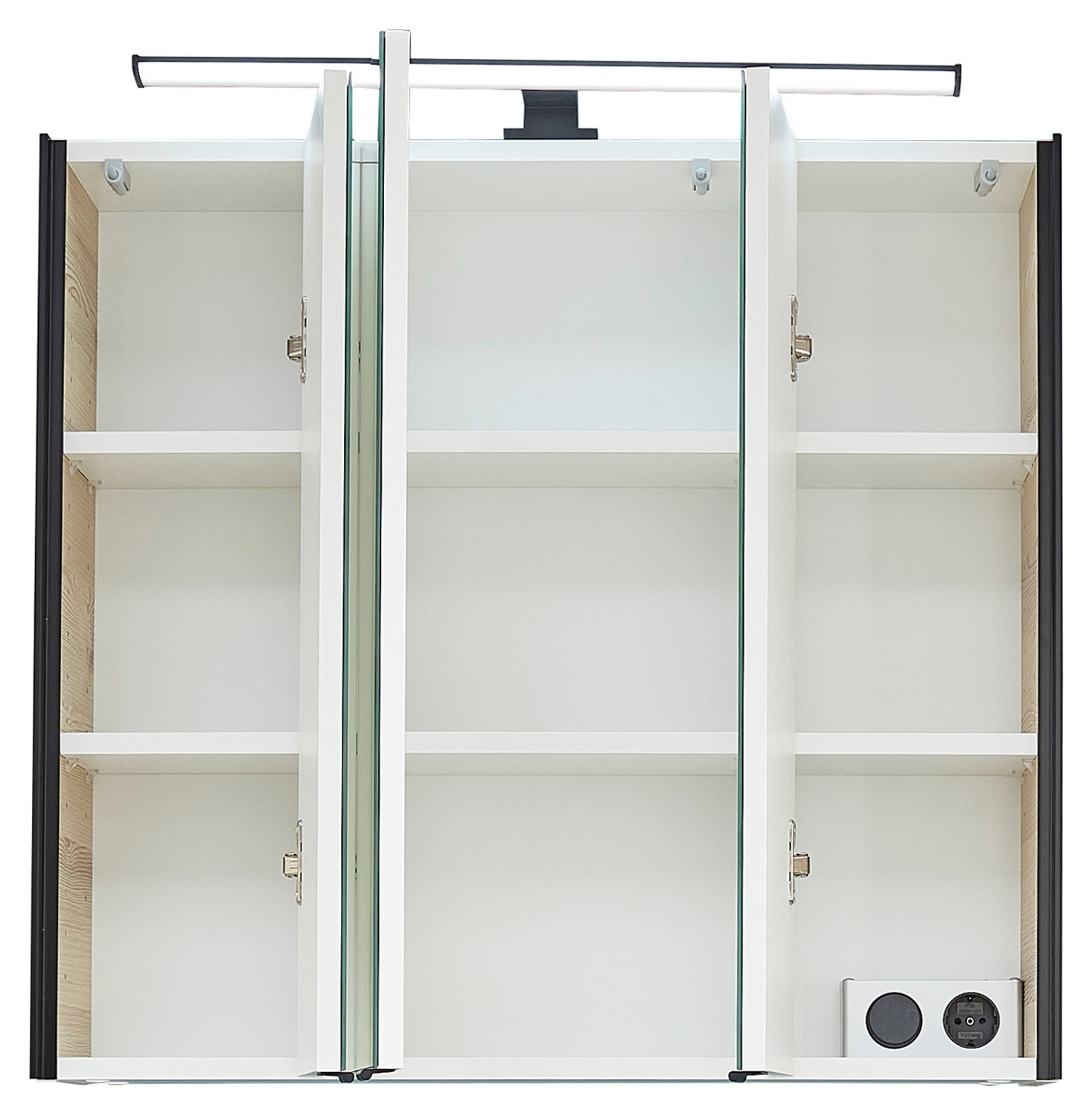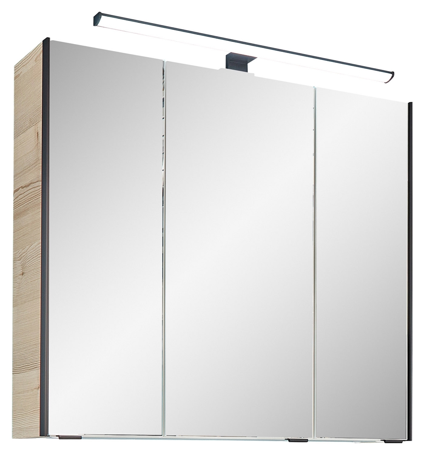 | Lieferumfang: | 1 Spiegelschrank mit LED-Aufsatzleuchte, 3 Türen und 6 Einlegeböden |