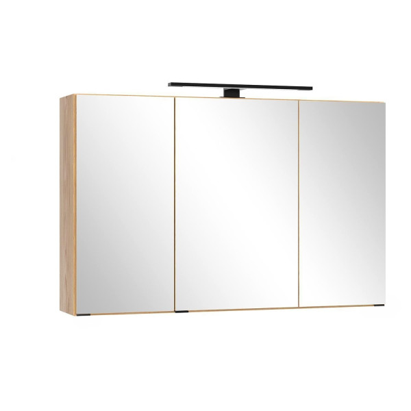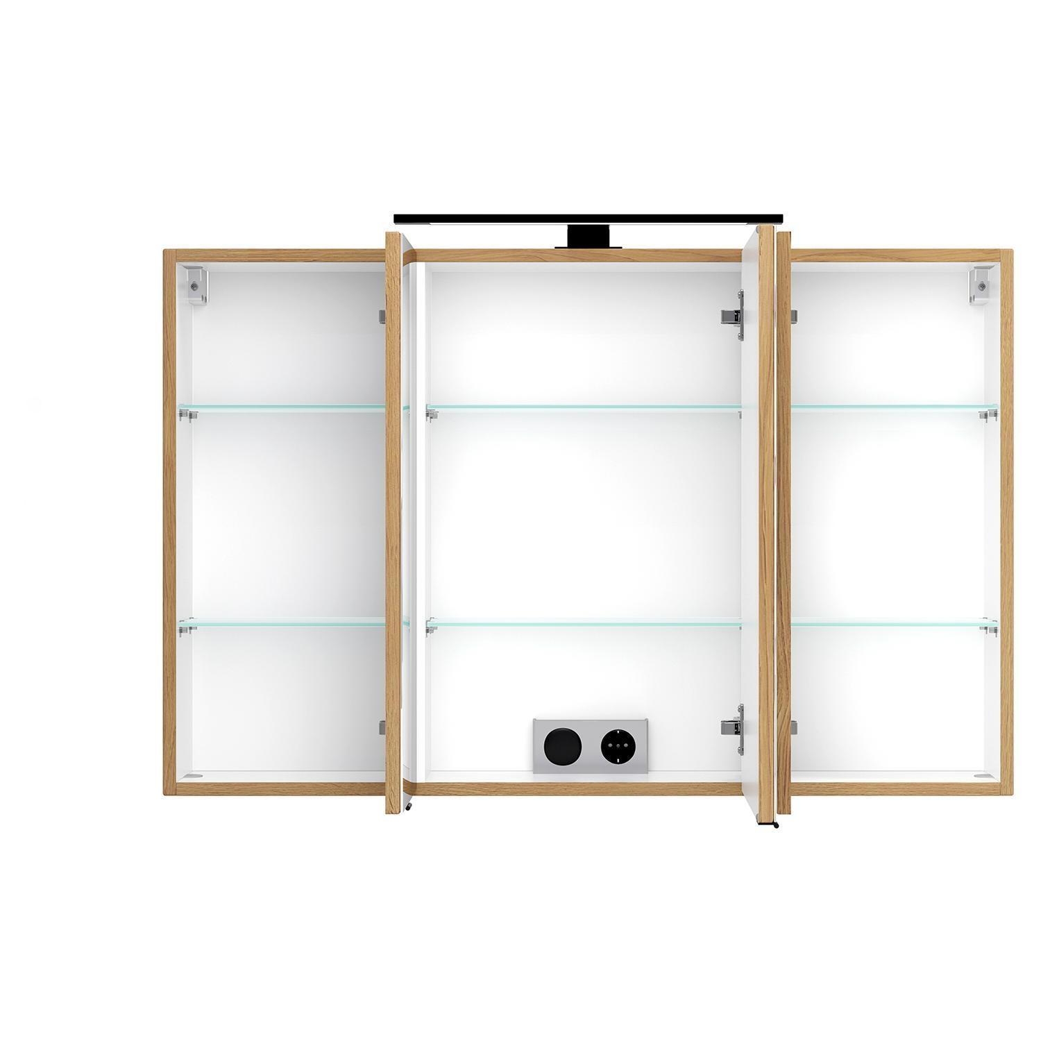 | Lieferumfang: | 1 Spiegelschrank mit LED-Aufsatzleuchte, 3 Türen, 6 mehrfach höhenverstellbare Glasböden und Schalter-Steckdosen-Element |
