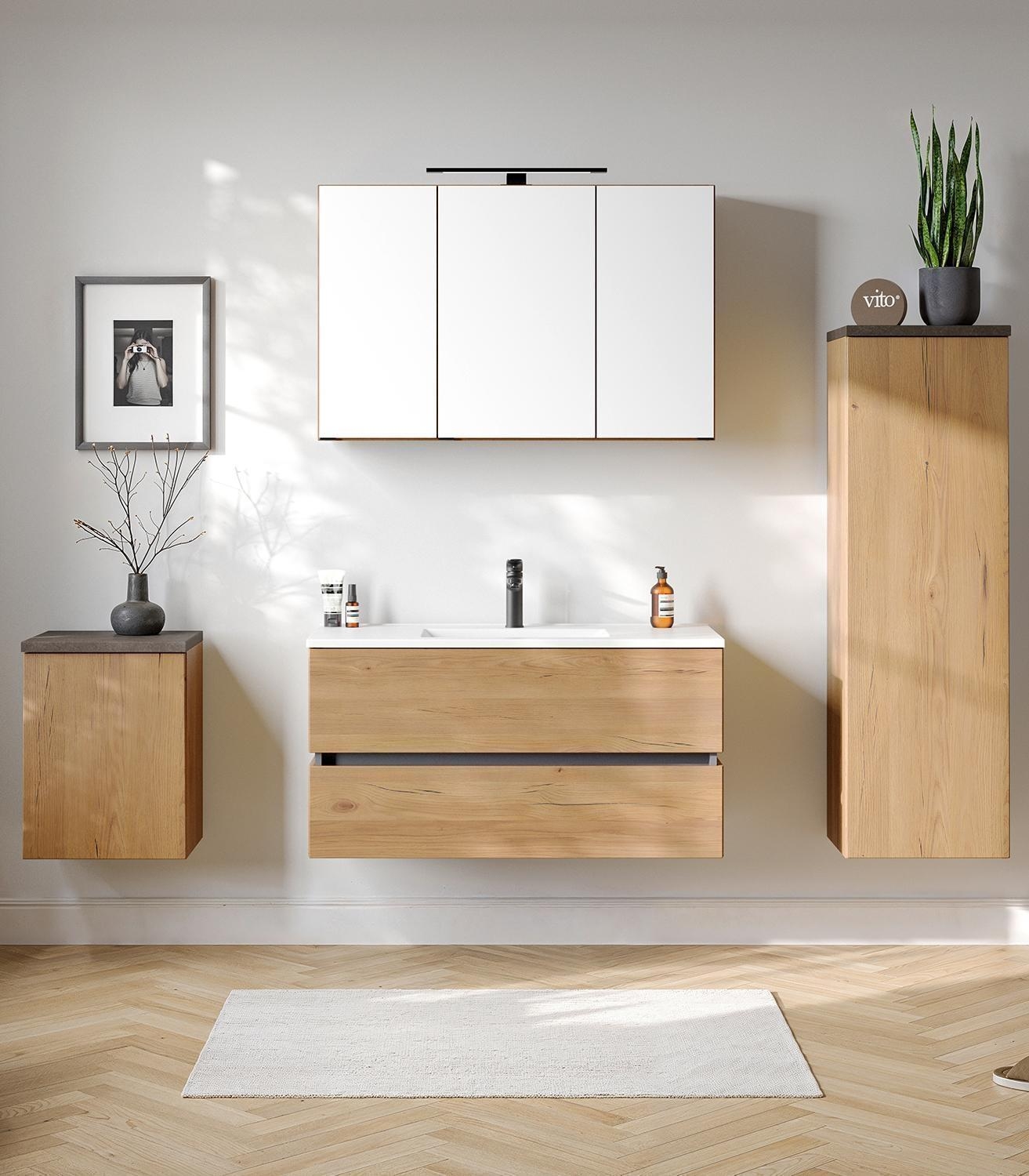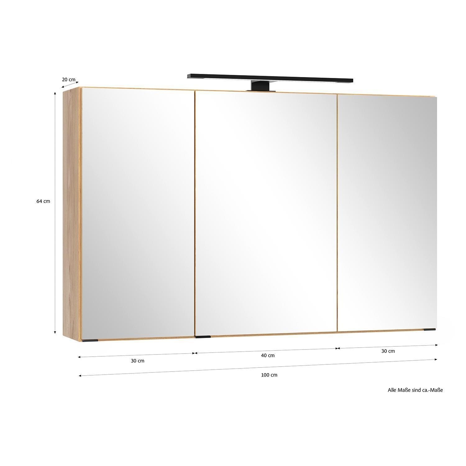 Der Spiegelschrank CARIBU der Marke vito ist in Wildeiche Dekor gestaltet und verfügt über drei Spiegeltüren mit Soft-Close-Funktion. Im Innenraum befinden sich sechs mehrfach höhenverstellbare Glasböden, die eine flexible Aufteilung ermöglichen. Der Schrank ist mit Kabeldurchlässen, einer LED-Aufsatzleuchte sowie einem Schalter-Steckdosen-Element ausgestattet. Die Maße betragen 100 cm in der Breite, 64 cm in der Höhe und 20 cm in der Tiefe.