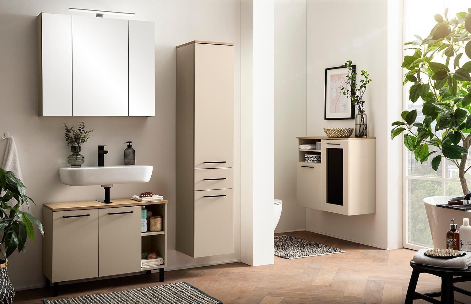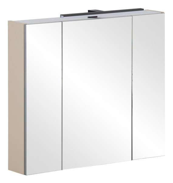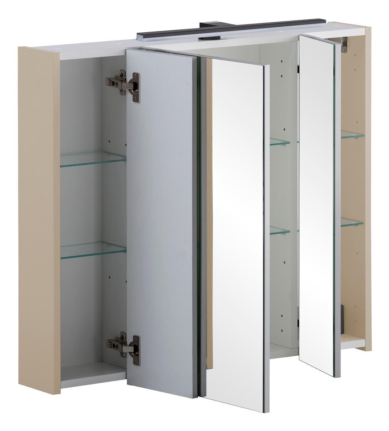 Der Spiegelschrank MALO der Marke vito ist in Cremebeige gehalten und mit einer Oberfläche aus Melaminharzbeschichtung versehen. Er verfügt über eine LED-Aufsatzleuchte, drei Spiegeltüren mit Soft-Close-Funktion sowie ein Schalter-Steckdosen-Element. Im Inneren sind sechs verstellbare Glasböden integriert. Die Maße des Schranks betragen 80 cm in der Breite, 74 cm in der Höhe und 16 cm in der Tiefe.