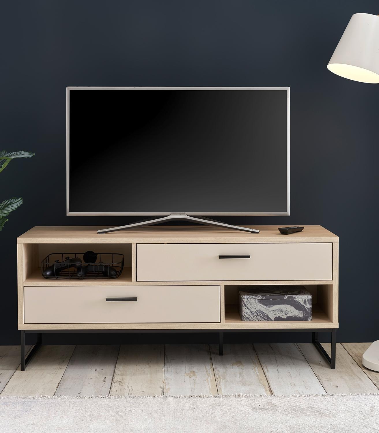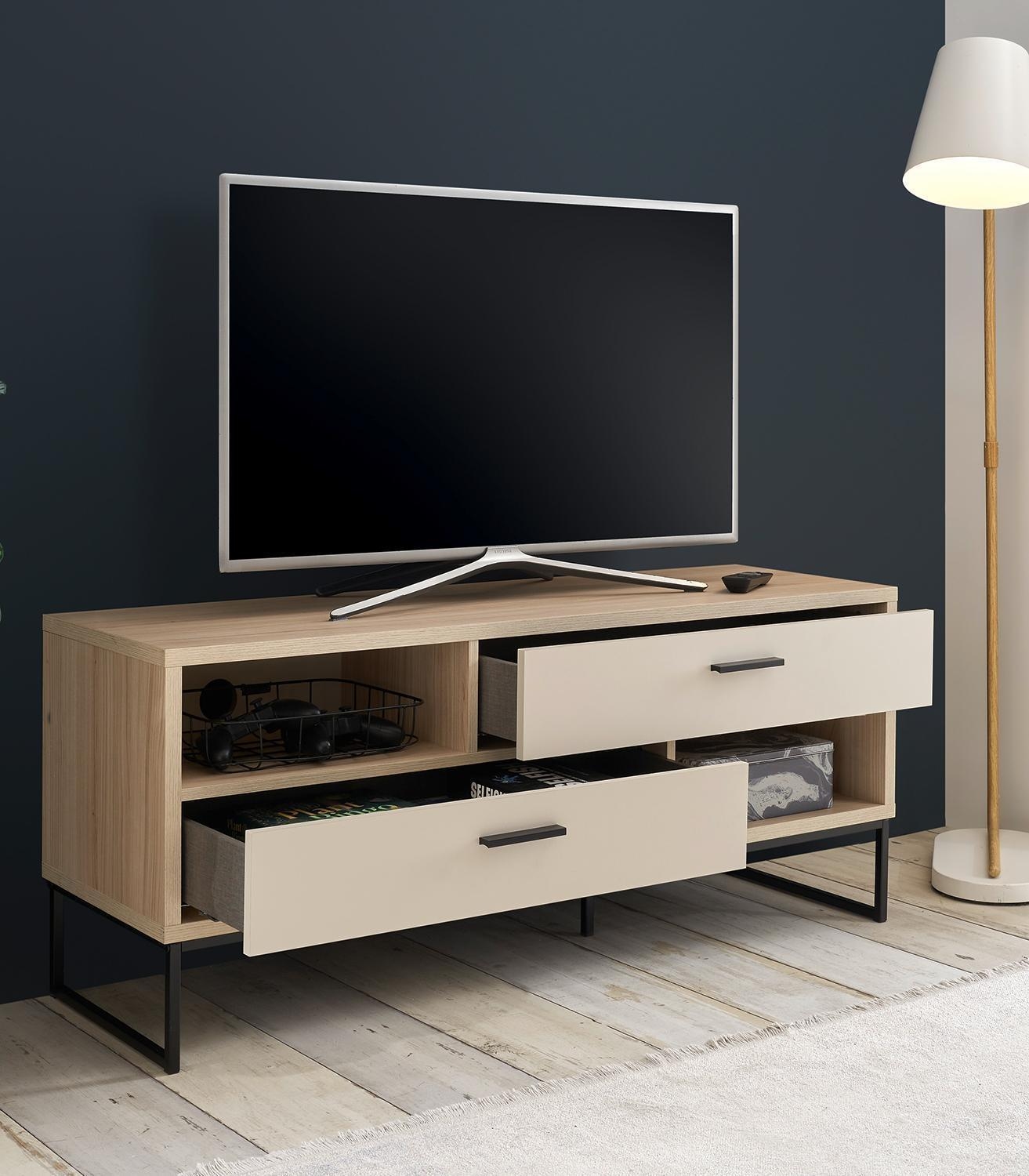 Das TV Lowboard ASSUME der Marke vito ist im Dekor Riva Eiche gestaltet und mit Absetzungen in Cashmerebraun versehen. Diese Medienkonsole verfügt über zwei Schubladen sowie zwei Ablagefächer, die mit jeweils einem Kabeldurchlass ausgestattet sind. Die Abmessungen dieses Fernsehschranks belaufen sich auf eine Breite von 125 cm, eine Höhe von 52 cm und eine Tiefe von 38 cm.
