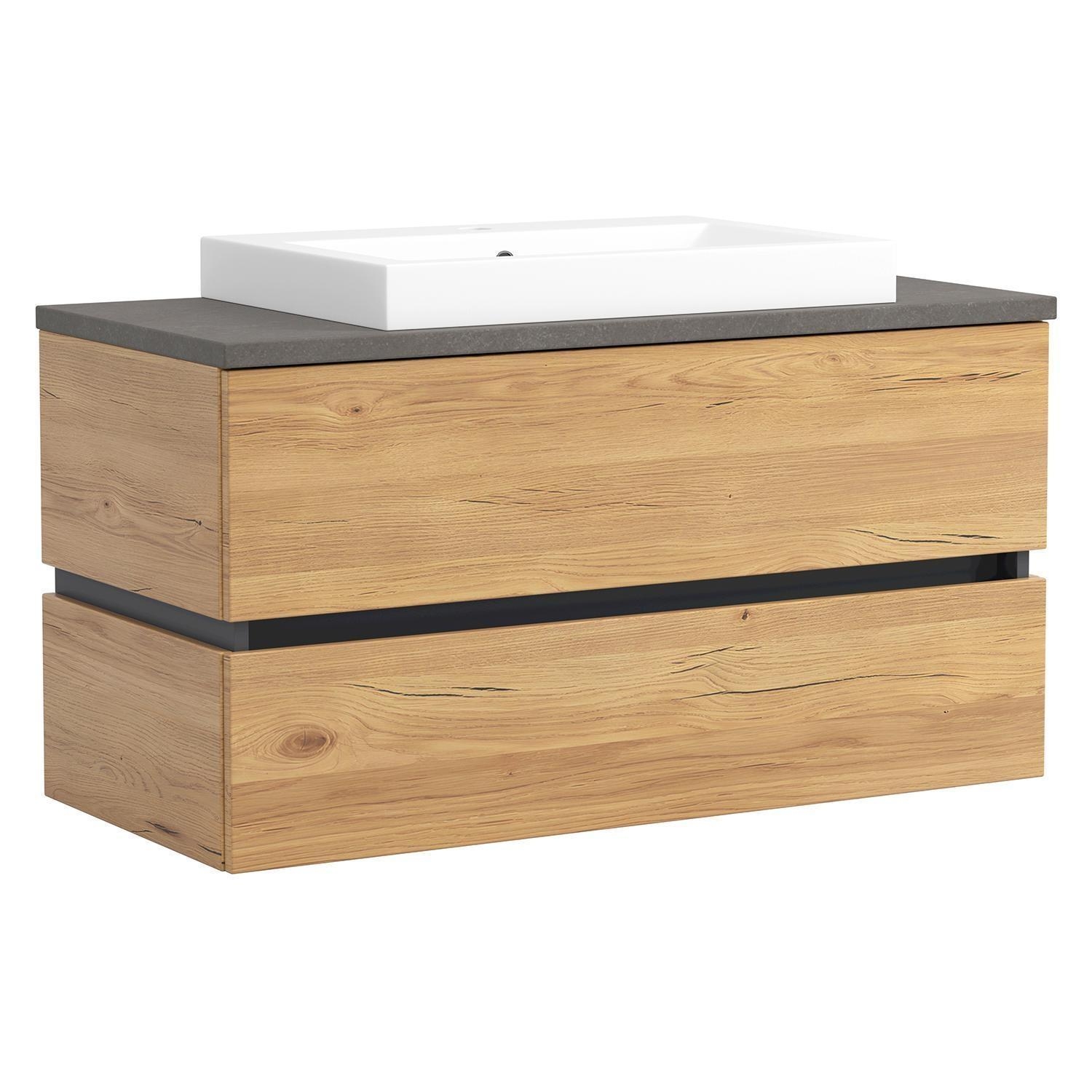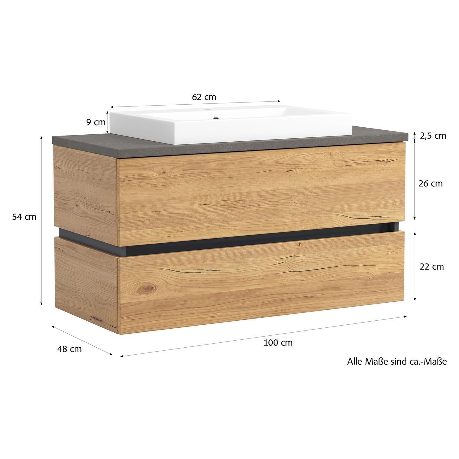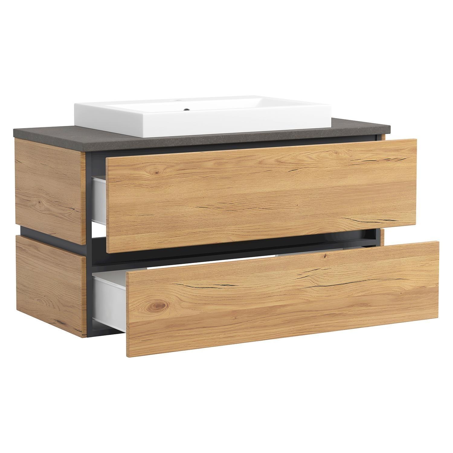 B 100 cm - 2 Schubladen - Graphitgrau - Wildeiche Dekor - inkl. Keramikwaschbecken