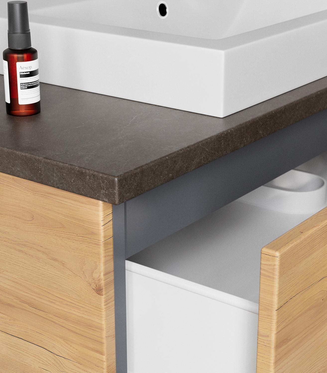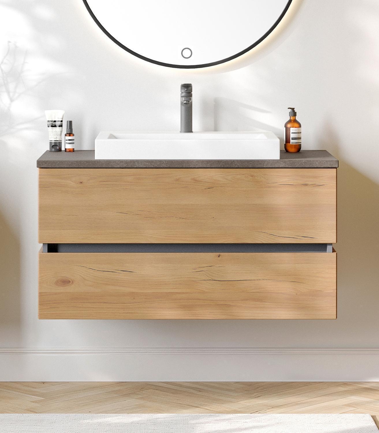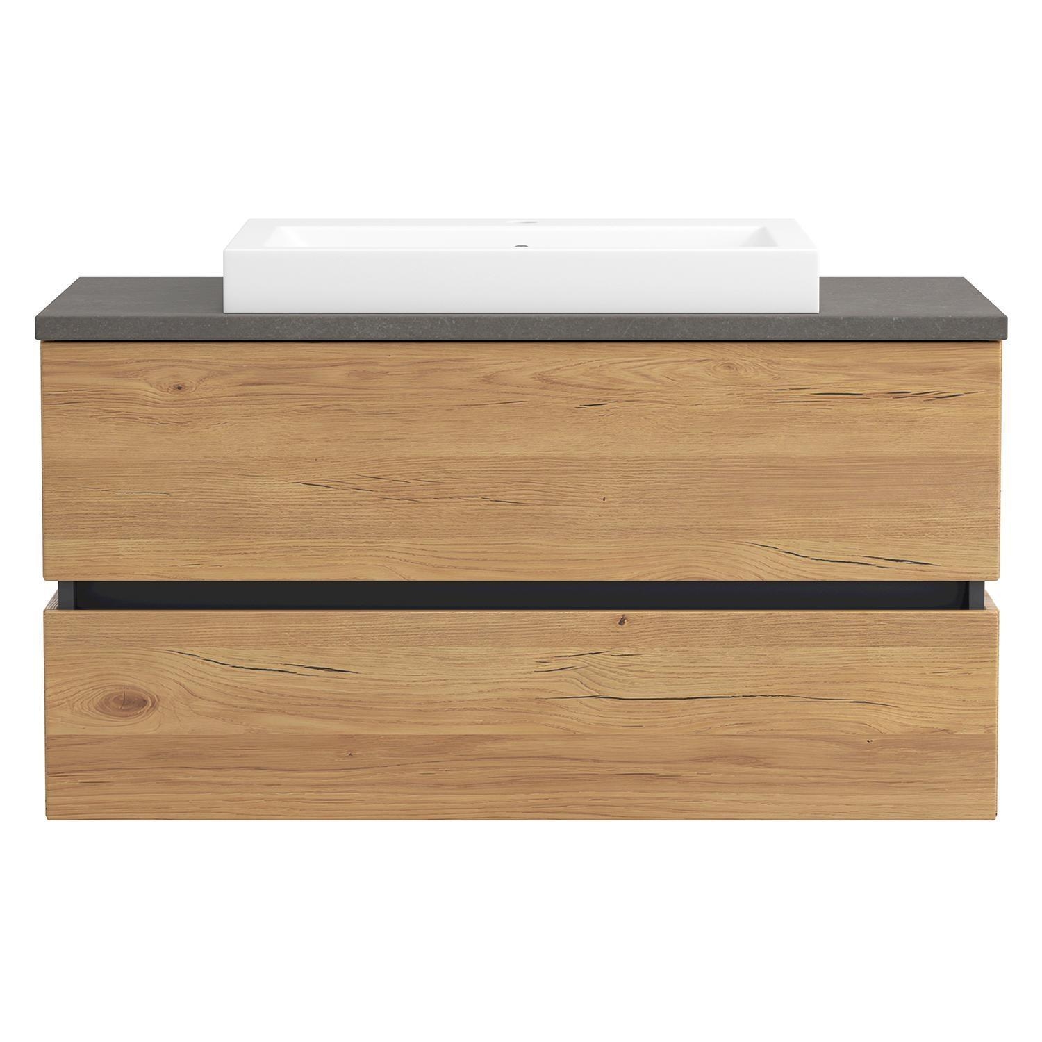 B 100 cm - 2 Schubladen - Graphitgrau - Wildeiche Dekor - inkl. Keramikwaschbecken