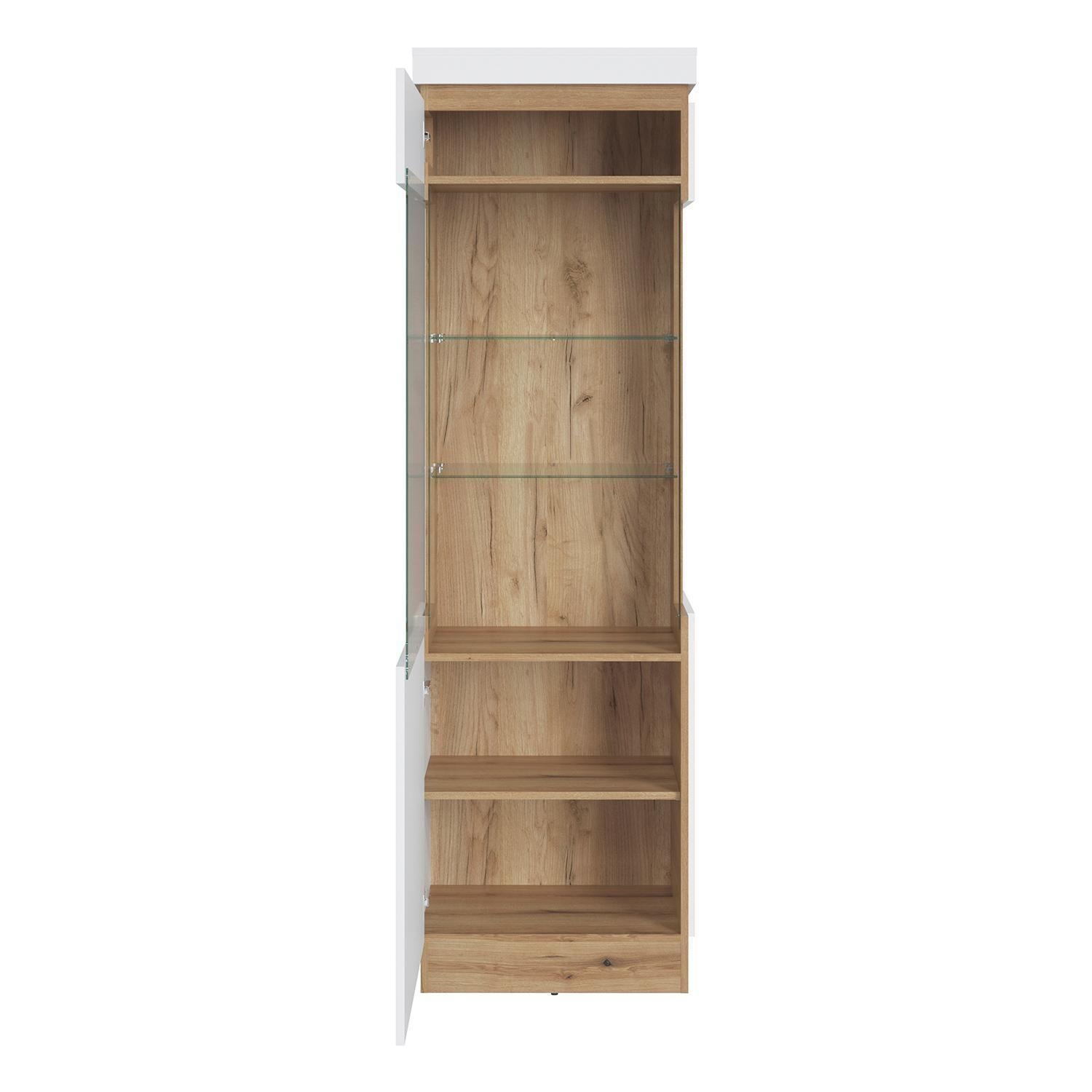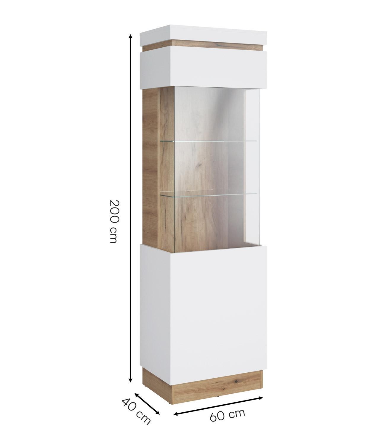 Die Vitrine CLARA ist in Alpinweiß gehalten und verfügt über Absetzungen in Evoke Eiche Dekor. Sie ist mit einer Tür mit Glasteilfront ausgestattet. Im Innenraum befinden sich drei Einlegeböden sowie zwei Glasböden. Der Türanschlag ist nur links montierbar. Die Vitrine wird ohne Beleuchtung geliefert. Die Breite beträgt 60 cm, die Höhe 200 cm und die Tiefe 40 cm.