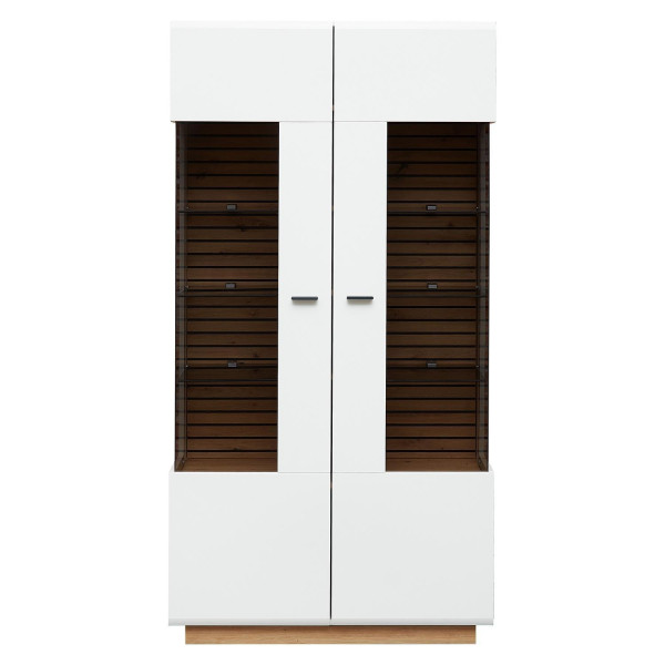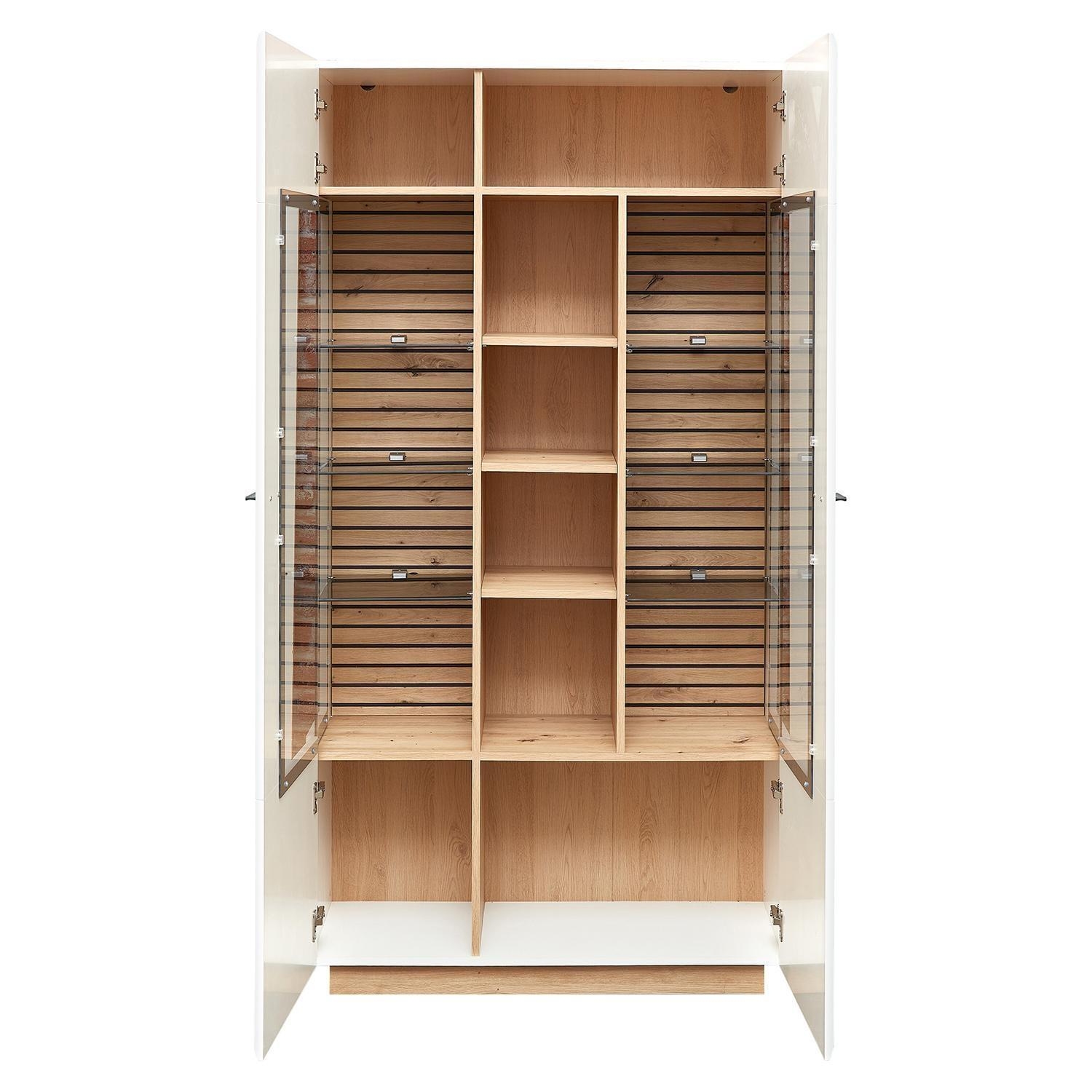 Die Vitrine FANCY ist in mattem Weiß gestaltet und verfügt über Absetzungen sowie ein Innendekor in Artisan Eiche Dekor. Zwei Türen mit Glasteilfronten und integrierter Soft-Close-Funktion bieten Zugang zum Innenraum, der durch sieben Einlegeböden und sechs Glasböden unterteilt wird. Eine LED-Beleuchtung ist nicht mit enthalten. Die Maße betragen 98 cm in der Breite, 190 cm in der Höhe und 40 cm in der Tiefe.