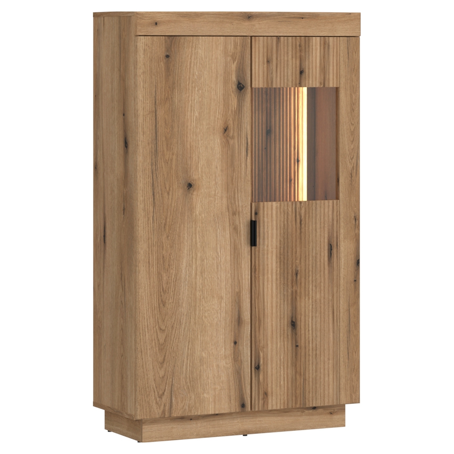 Die Vitrine DANELA überzeugt mit ihrem eleganten Design und ihrer funktionalen Ausstattung. Hergestellt aus Holzwerkstoff und mit einem ansprechenden Coast Evoke Eiche Dekor versehen, ist sie eine Bereicherung für jeden Raum. Mit einer Tür und einer Tür mit Glasteilfront bietet sie nicht nur ausreichend Stauraum, sondern präsentiert deine Sammlerstücke auch stilvoll. Im Inneren befinden sich sechs Einlegeböden, um deine Gegenstände optimal zu organisieren. Die integrierte LED-Beleuchtung setzt deine Lieblingsstücke gekonnt in Szene und schafft eine angenehme Atmosphäre. Mit Maßen von 81 cm Breite, 141 cm Höhe und 40 cm Tiefe passt die Vitrine in verschiedene Wohnbereiche und bietet genügend Platz für deine persönlichen Schätze.