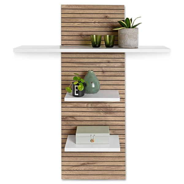 Dieses Wandregal kombiniert Nox Eiche Dekor mit drei Ablageflächen in mattem Weiß. Mit einer Größe von 100 x 125 cm bietet es praktischen Stauraum und eine elegante Optik. Die unterschiedlichen Längen der Ablageflächen verleihen dem Regal ein modernes Flair. Hergestellt aus hochwertigem Holzwerkstoff passt es perfekt in verschiedenste Einrichtungsstile und verleiht Ihrem Raum eine zeitlose Eleganz.
