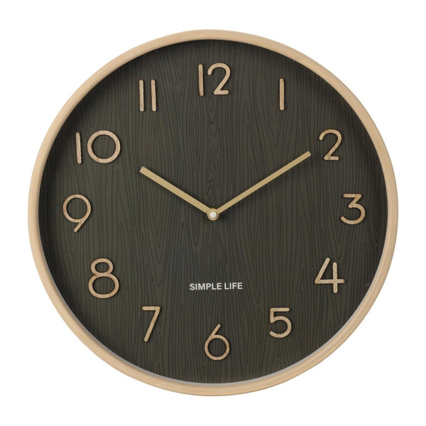 Die Wanduhr BAYLOR ist in brauner Holzoptik gehalten und besteht aus MDF. Sie hat einen Durchmesser von 38 cm sowie eine Tiefe von 5 cm. Die Ziffern und Zeiger sowie der Rand sind in Braun gehalten. Die Rückplatte ist Grau. Die Anzeige erfolgt analog mit einer 12-Stunden-Skala. Unterhalb der Zeiger befindet sich mittig in Weiß die Aufschrift „SIMPLE LIFE“. Für den Betrieb wird eine AA-Batterie benötigt.