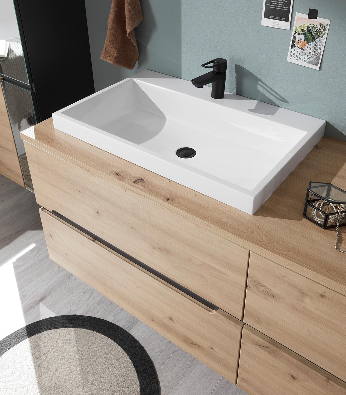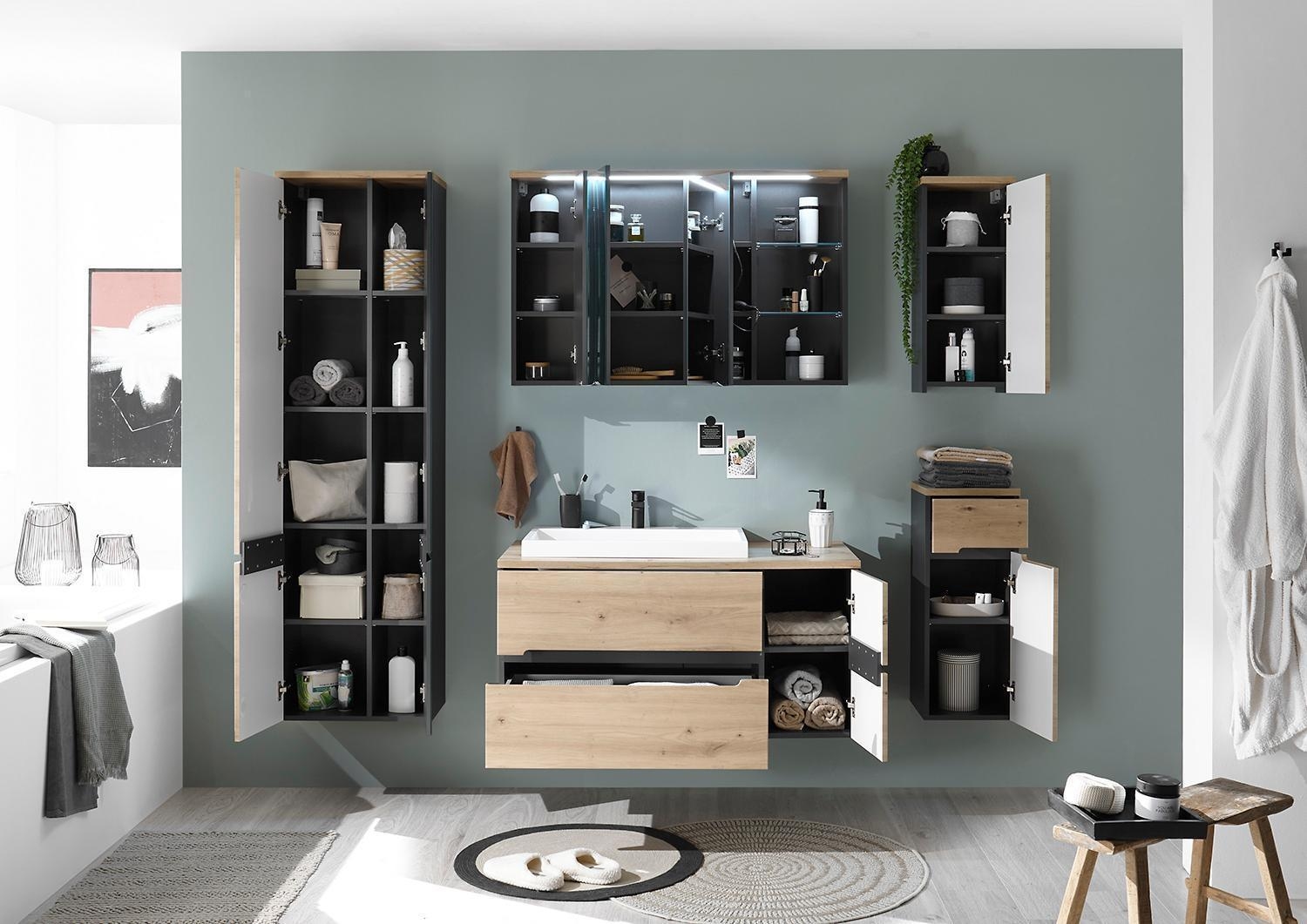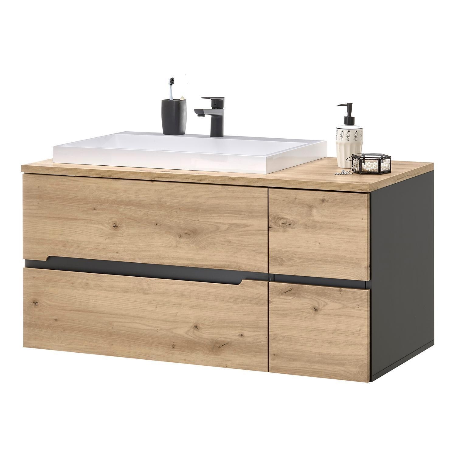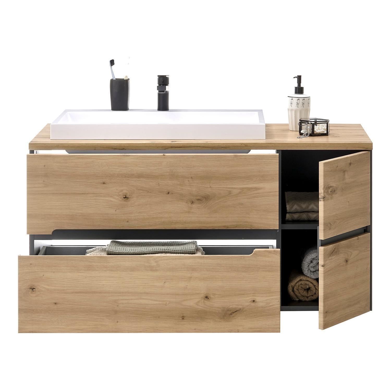 Die zweiteilige Waschtischkombination MARTINO besteht aus einem Unterschrank in Grau matt sowie einem weißen Waschbecken. Die Fronten und der Oberboden des Schranks sind in Artisan Eiche Dekor ausgeführt. Der Unterschrank ist mit zwei Schubladen ausgestattet, die Stauraum für Badutensilien bieten. Die Montage der Waschtischkombination erfolgt hängend an der Wand. Die Gesamtmaße betragen 110 cm in der Breite, 54 cm in der Höhe und 53 cm in der Tiefe.