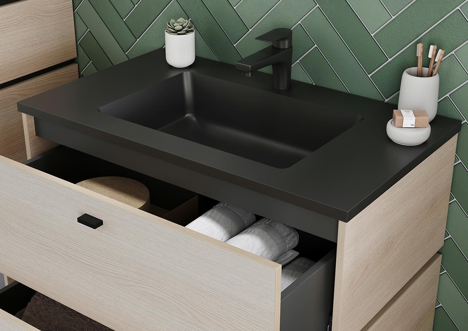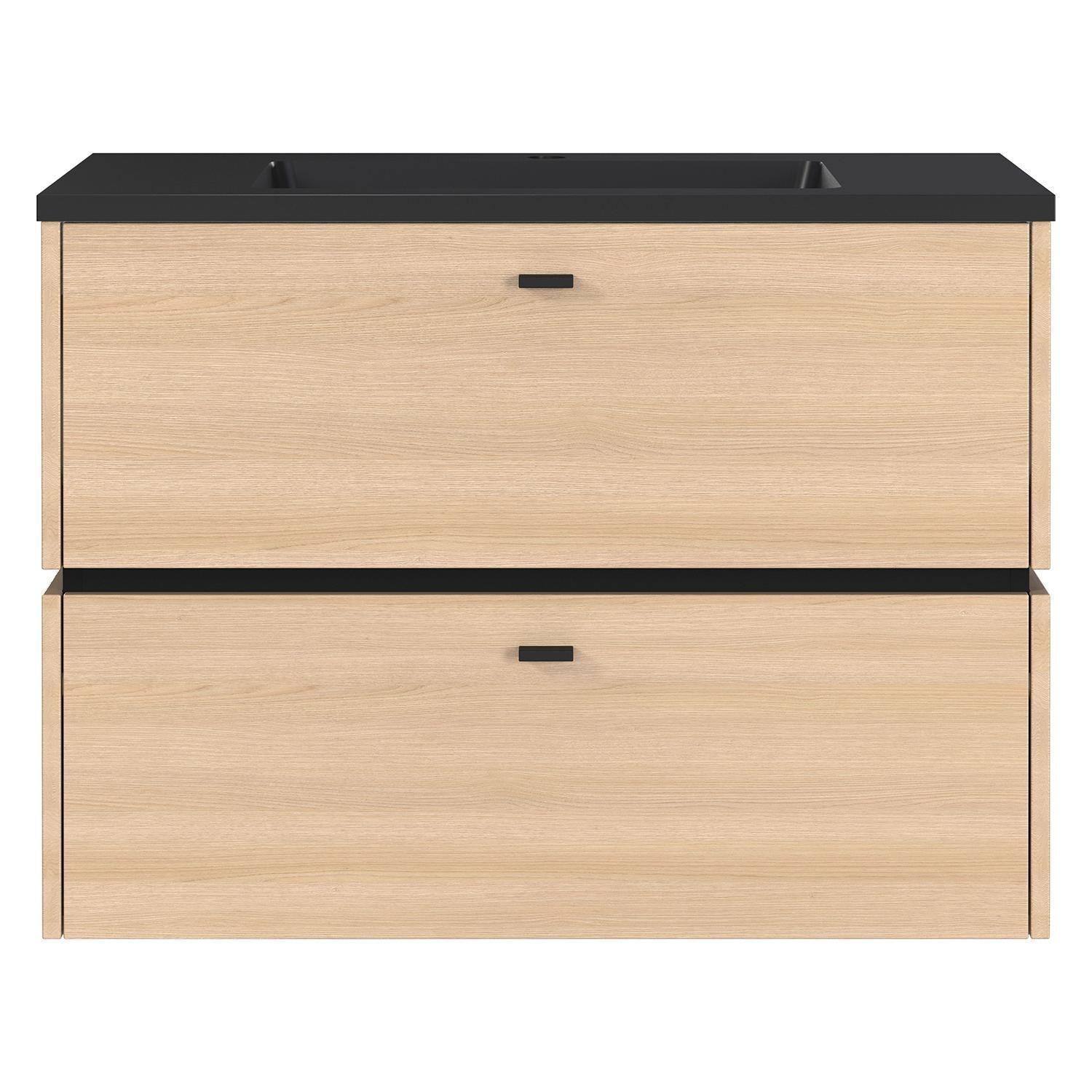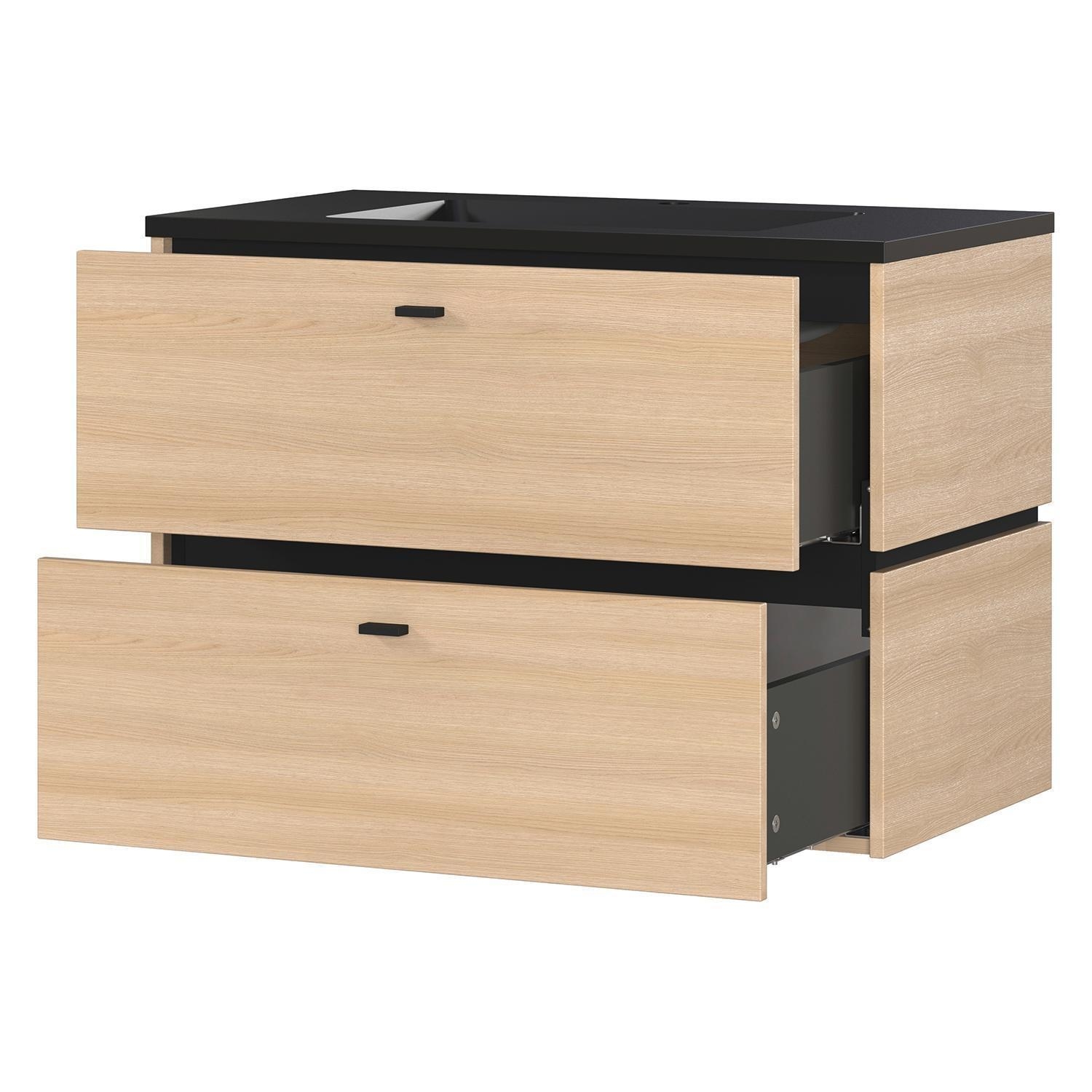 B 81 cm - 2 Schubladen - Lindberg-Eiche Dekor - Schwarz - inkl. Mineralgusswaschbecken