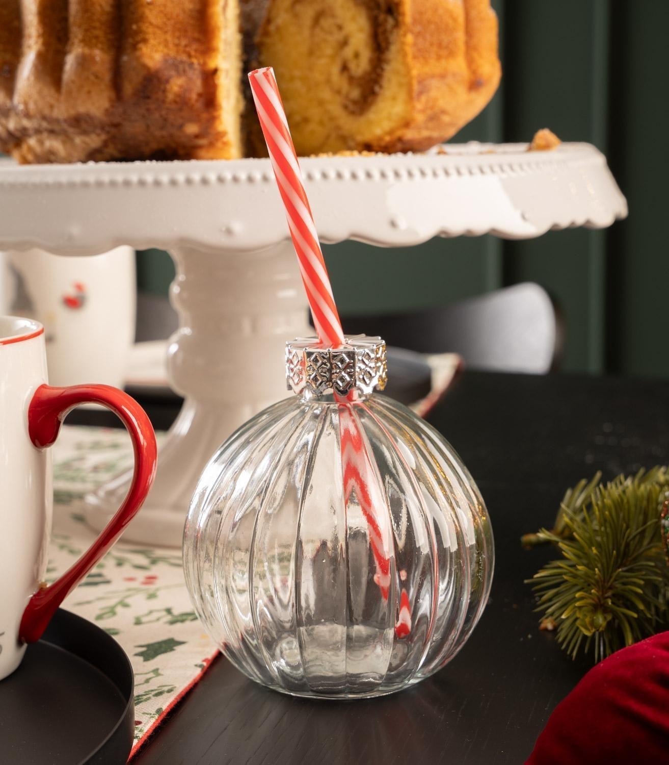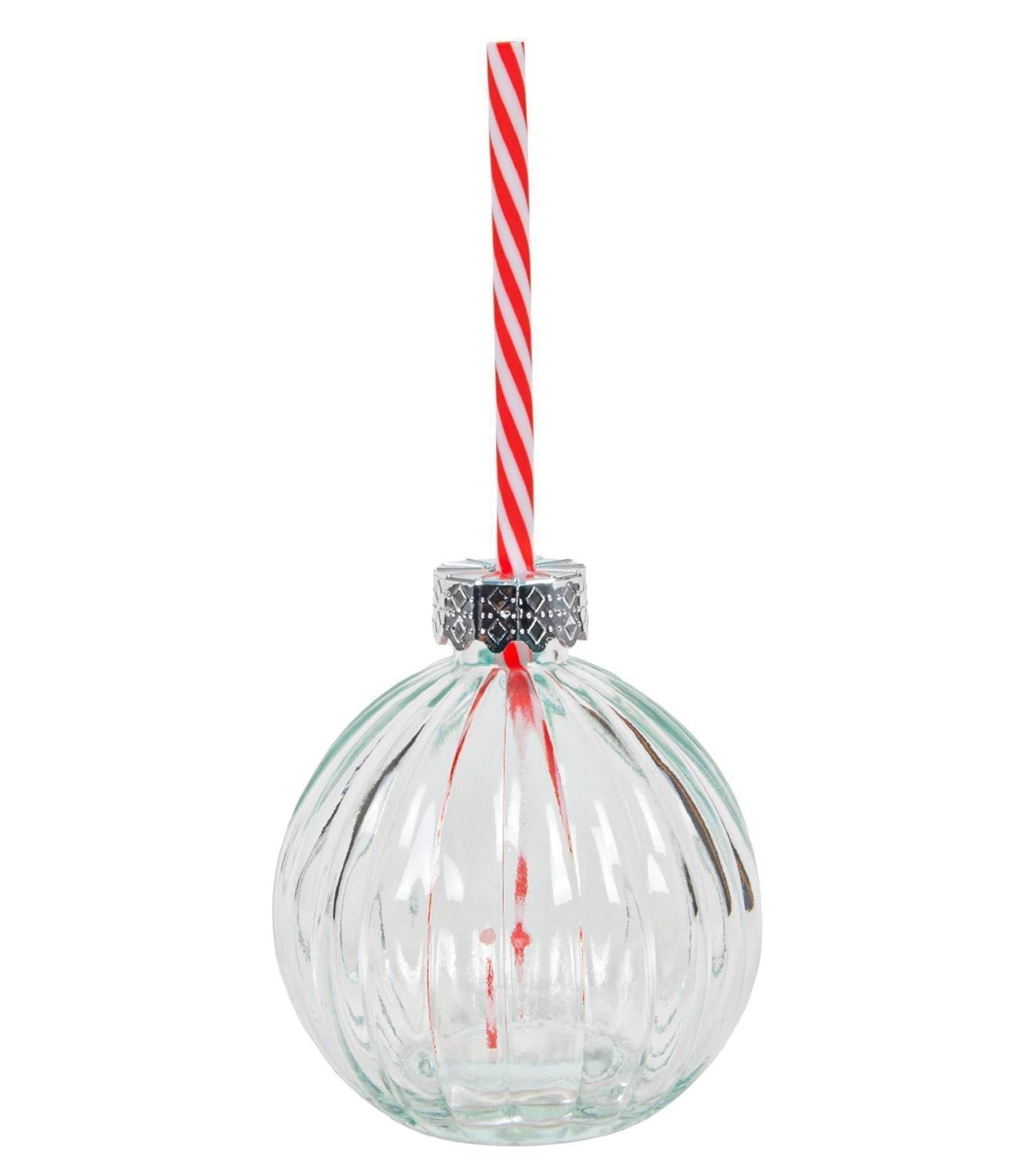 Die Weihnachtskugel BALITON besteht aus transparentem Glas und hat einen Durchmesser von 9,5 cm. Sie ist in Trinkglasoptik gestaltet und verfügt über ein Rillenmuster. Ein Strohhalm in Rot und Weiß ergänzt die Gestaltung und macht die Kugel zu einer witzigen Dekoration für den Weihnachtsbaum.