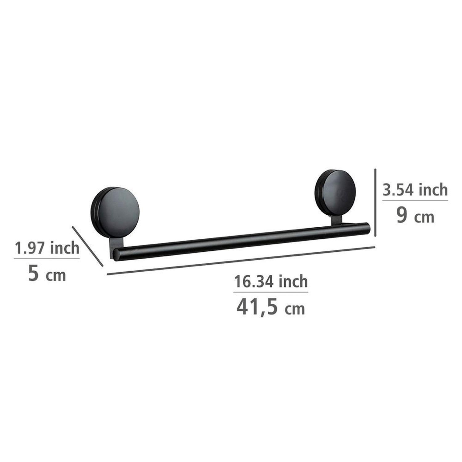 Die Handtuchstange PAVIA von Wenko überzeugt mit schlichtem, modernem Design in Schwarz aus Metall. Sie lässt sich einfach an der Wand montieren, da sie selbsthaftend durch statische Aufladung fixiert wird – ganz ohne Bohren. Mit einer Belastbarkeit von bis zu 10 kg ist sie stabil und praktisch. Die Maße der Handtuchstange sind 41,5 cm Breite, 9 cm Höhe und 5 cm Tiefe.