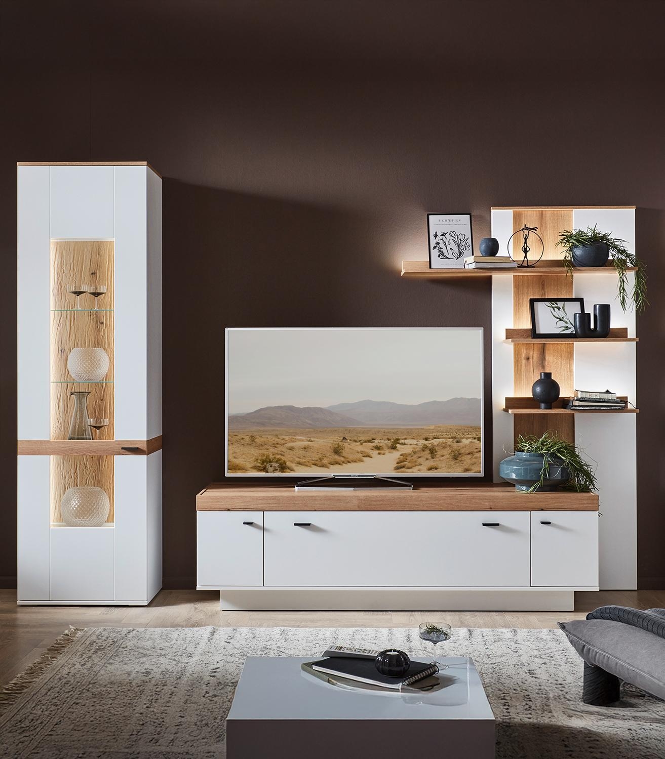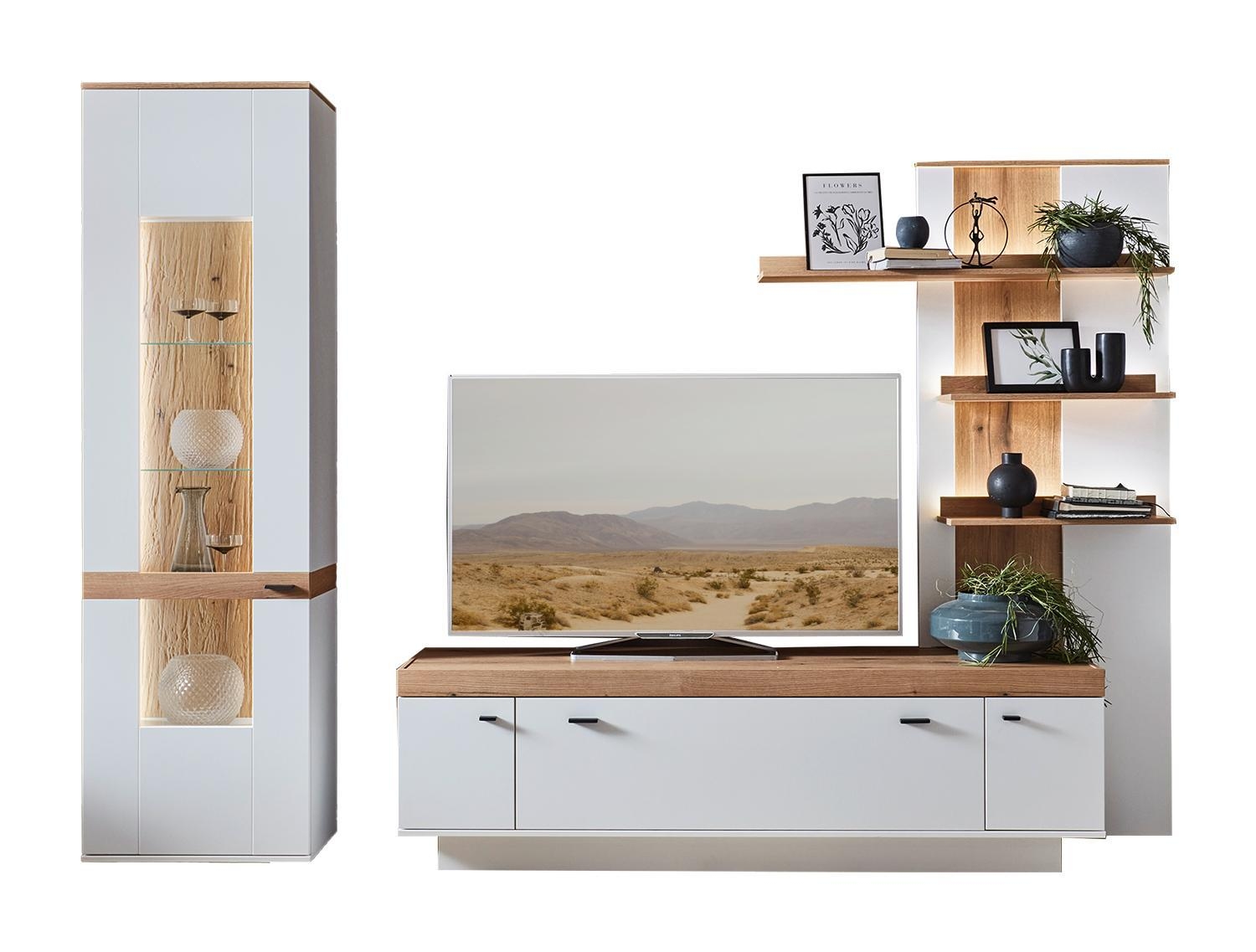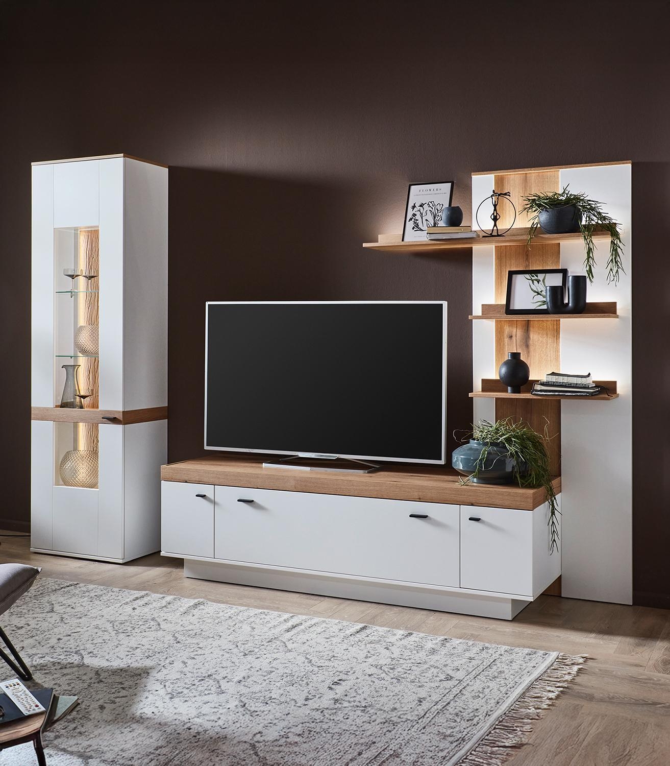 | Lieferumfang: | 3-teilige Wohnwand bestehend aus: 1 TV Lowboard, 1 Vitrine und 1 Wandpaneel. Die LED-Beleuchtung ist mit enthalten. |
