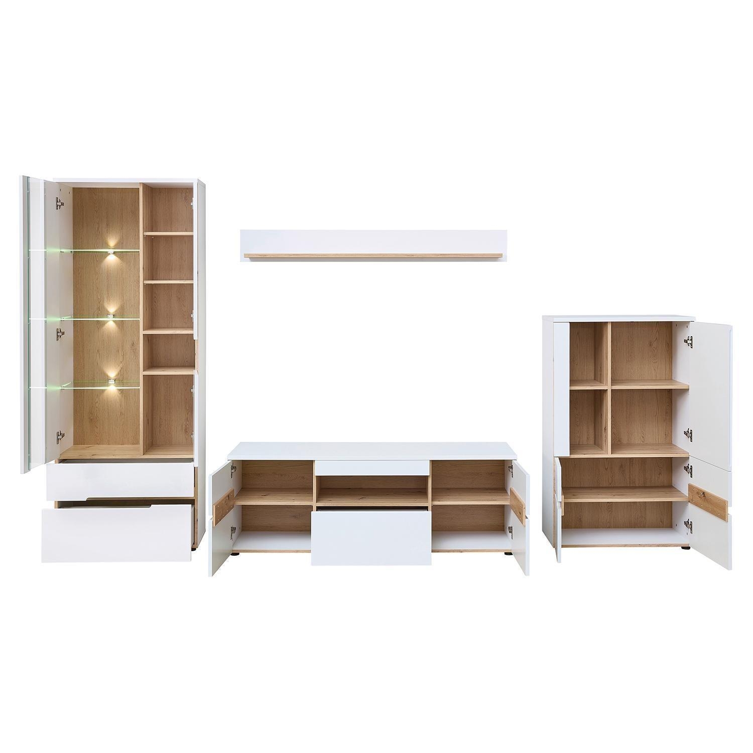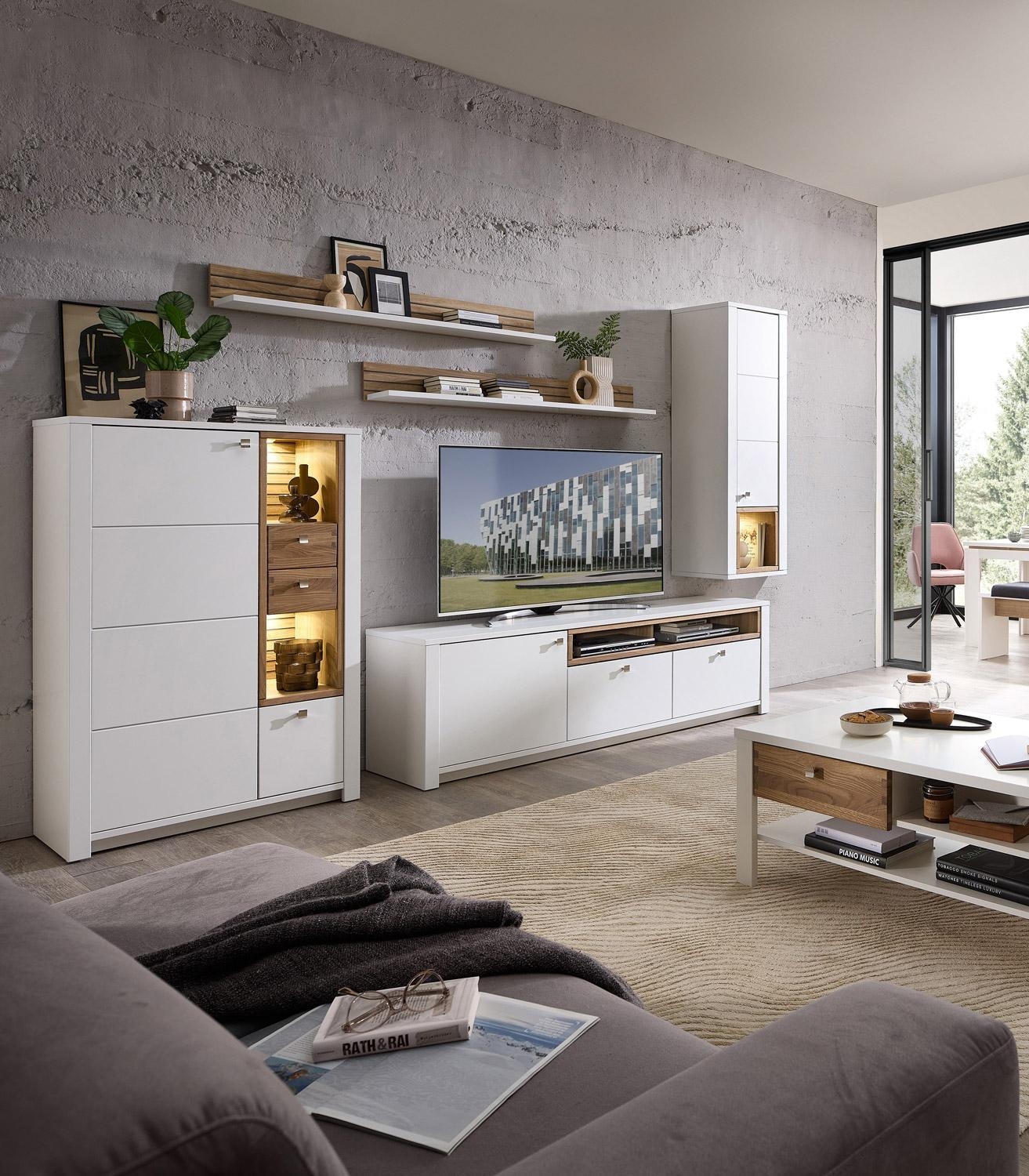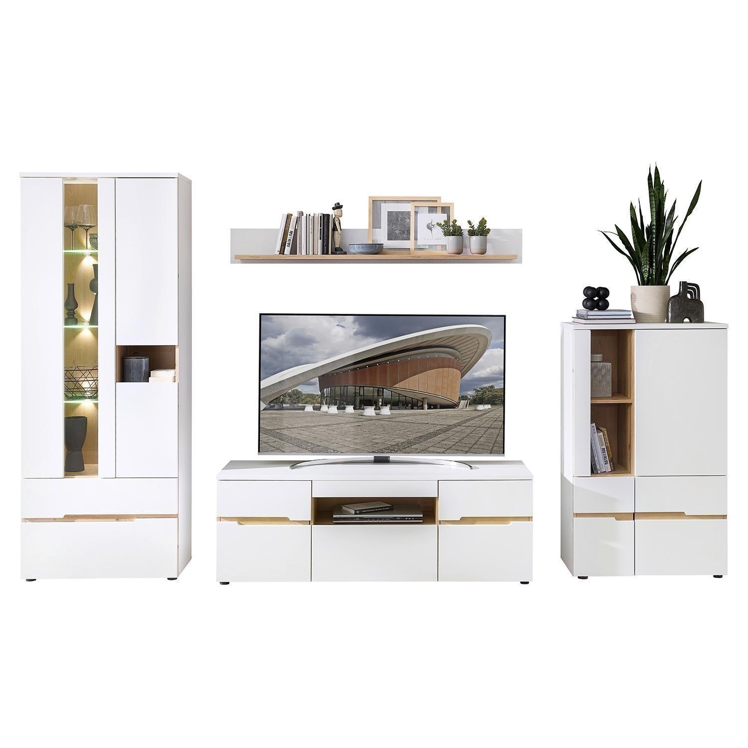 | Lieferumfang: | 4-teilige Wohnwand: 1 TV Lowboard, 1 Vitrine, 1 Highboard und 1 Wandboard. Die LED-Beleuchtung ist enthalten |