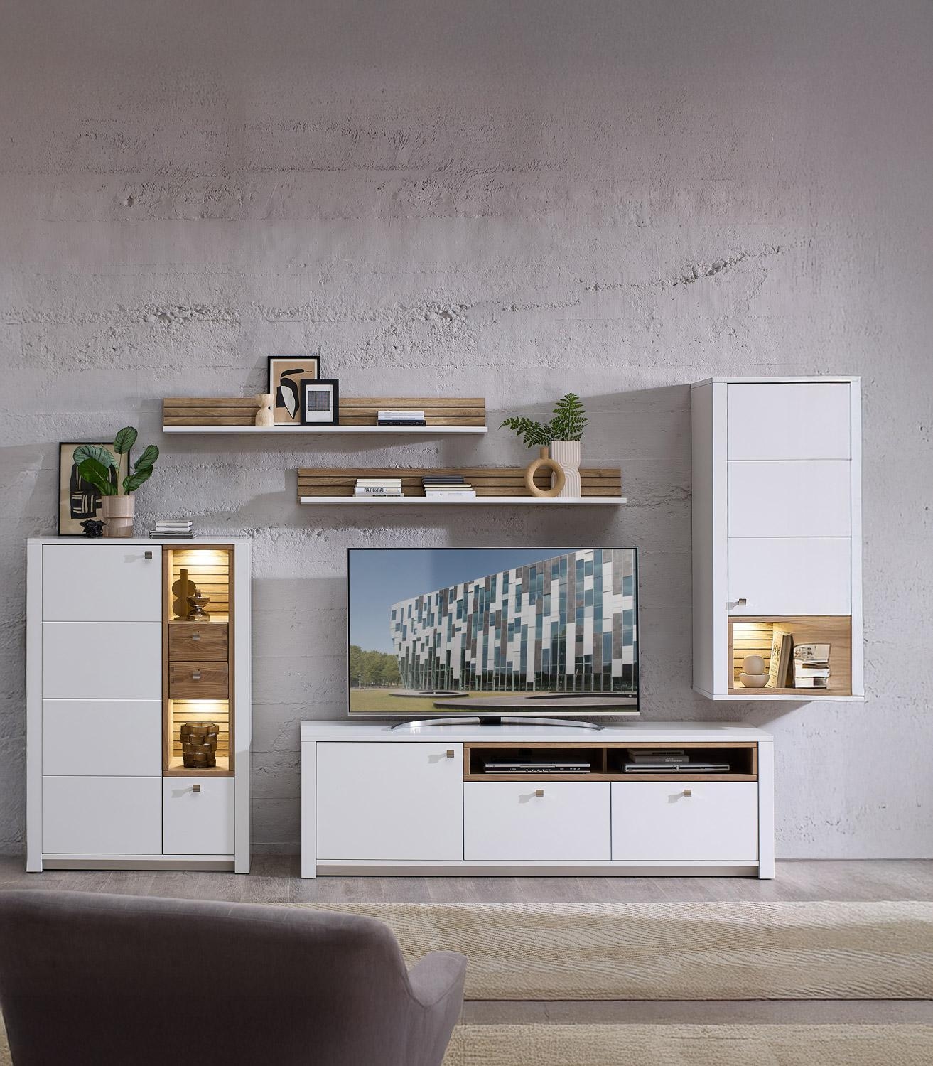 Die 4-teilige Wohnwand ANKE präsentiert sich in einem Design aus Weiß supermatt, ergänzt durch Absetzungen in Eiche Dekor. Das Möbelensemble bietet umfassenden Stauraum durch die Integration von acht Türen, drei Schubladen und fünf offenen Ablageflächen. Im Inneren sind sieben Einlegeböden sowie drei Glasböden vorhanden. Die Wohnwand verfügt zudem über eine integrierte LED-Beleuchtung. Ihre Gesamtmaße betragen 330 cm in der Breite, 202 cm in der Höhe und 47 cm in der Tiefe.