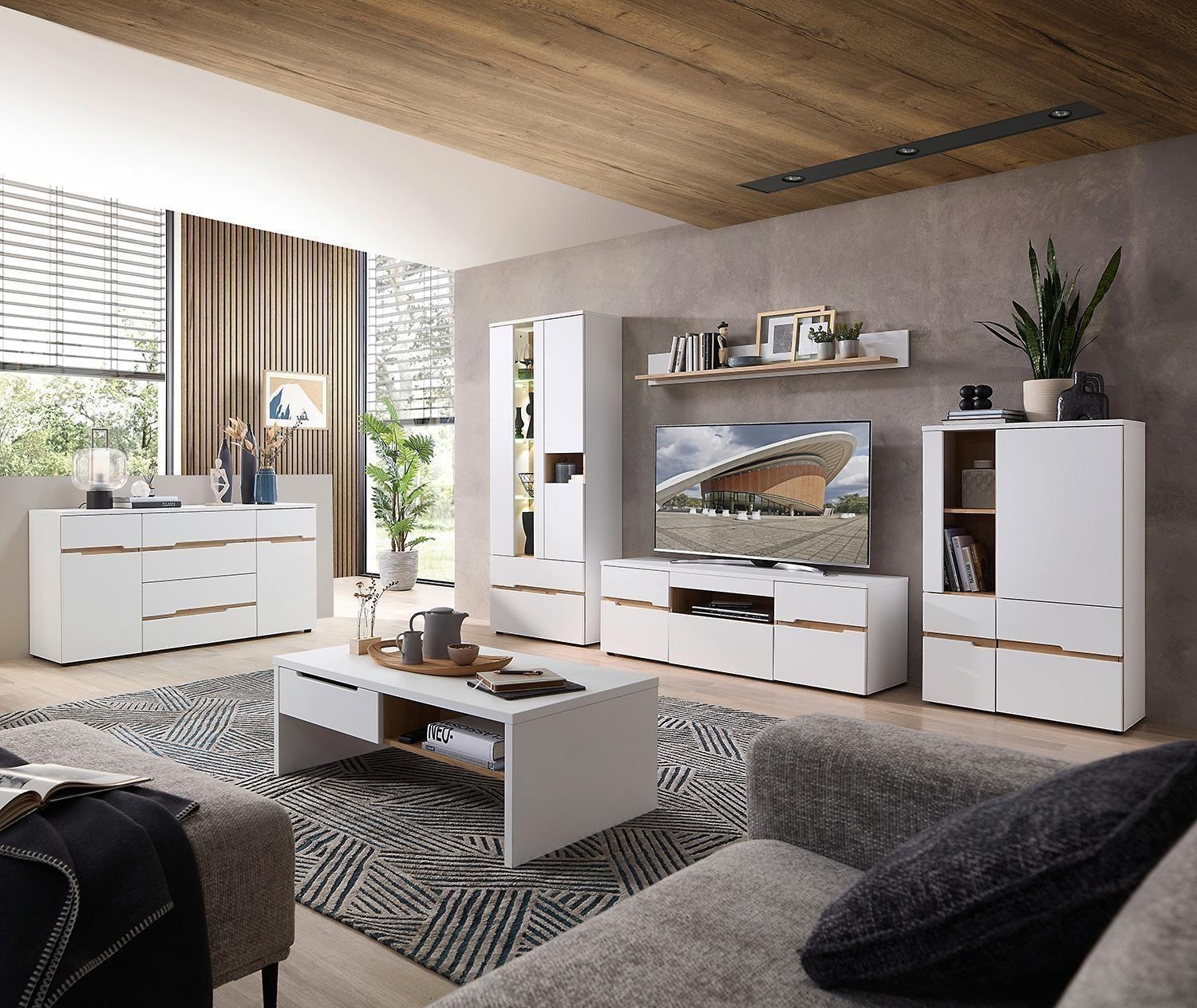 | Lieferumfang: | 4-teilige Wohnwand: 1 TV Lowboard, 1 Vitrine, 1 Highboard und 1 Wandboard. Die LED-Beleuchtung ist enthalten |