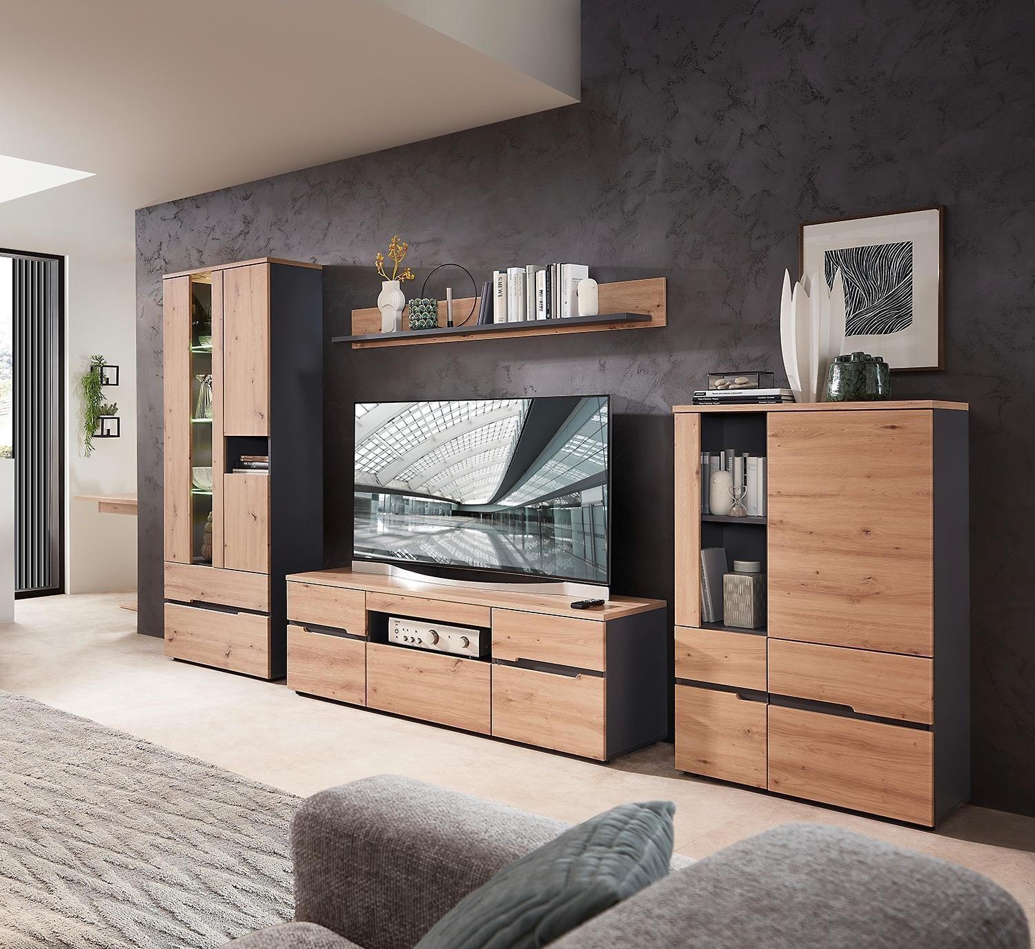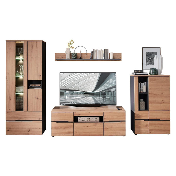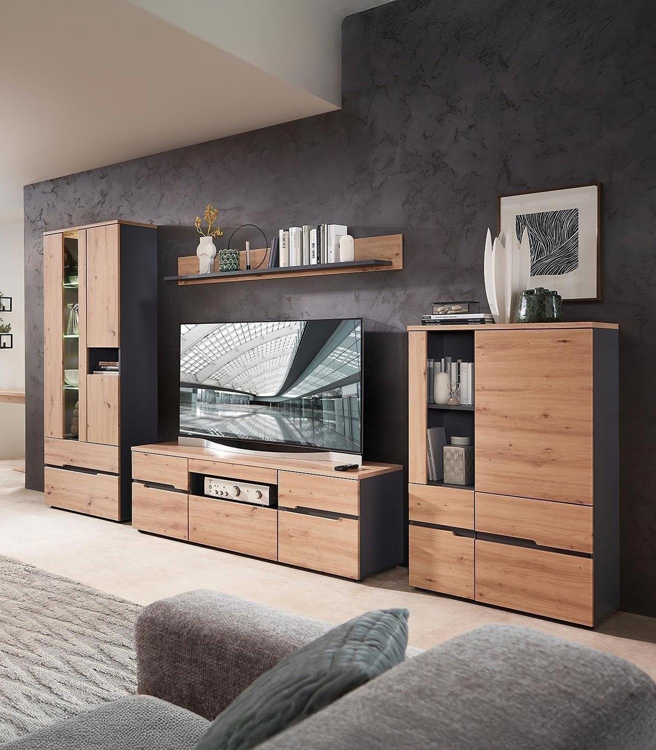 Die 4-teilige Wohnwand MELANIE präsentiert sich in einem Design aus Graphitgrau mit Fronten und Oberplatten in Artisan Eiche Dekor. Das Möbelensemble bietet umfassenden Stauraum durch die Integration von acht Türen, drei Schubladen und fünf offenen Ablageflächen. Im Inneren sind sieben Einlegeböden sowie drei Glasböden vorhanden. Die Wohnwand verfügt zudem über eine integrierte LED-Beleuchtung. Ihre Gesamtmaße betragen 330 cm in der Breite, 197 cm in der Höhe und 47 cm in der Tiefe.