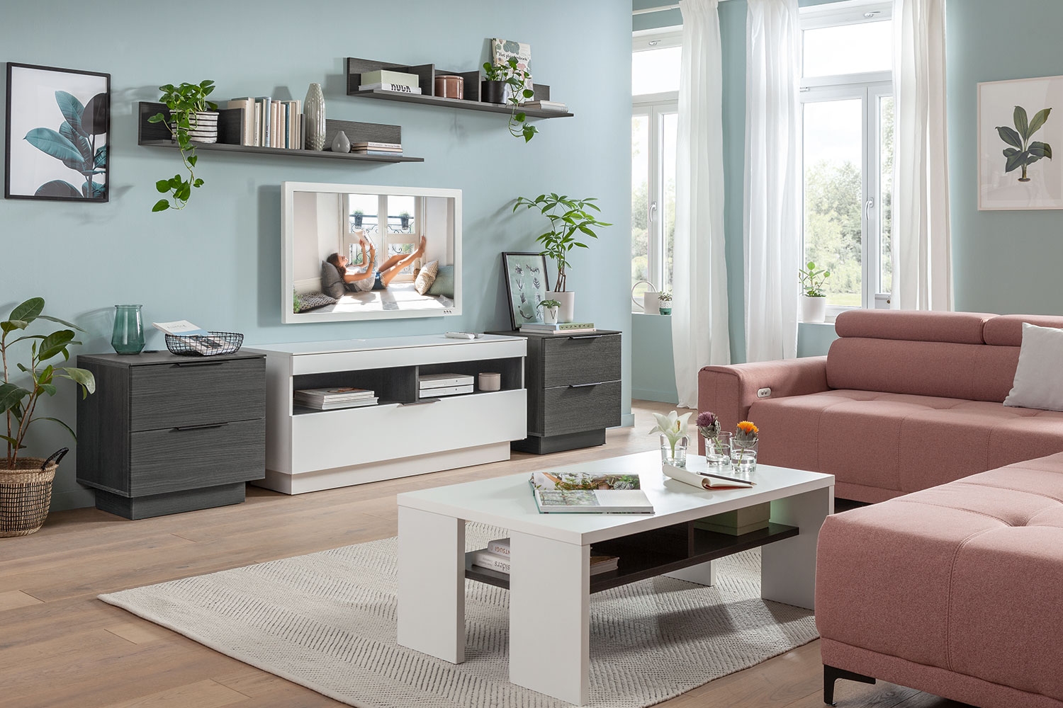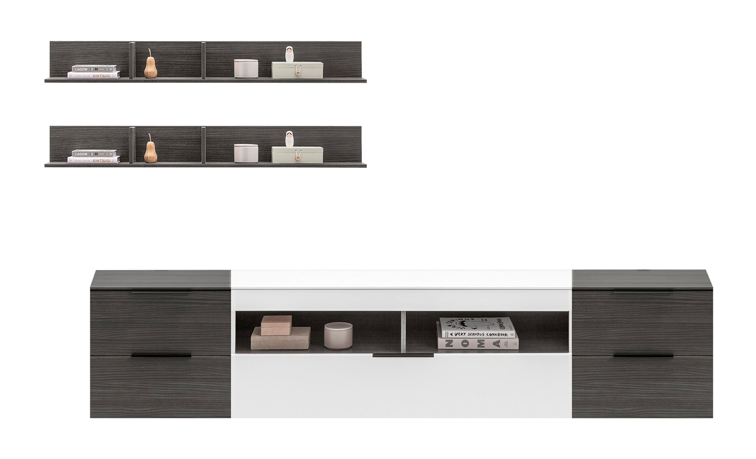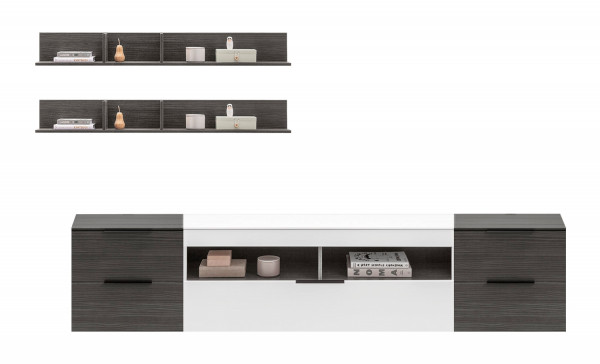 | Lieferumfang: | 5-teilige Wohnwand bestehend aus 1 TV Lowboard, 2 Schubladenschränken und 2 Wandboards. Die auf dem Boden stehenden Möbel können mit oder ohne Sockel verwendet werden |