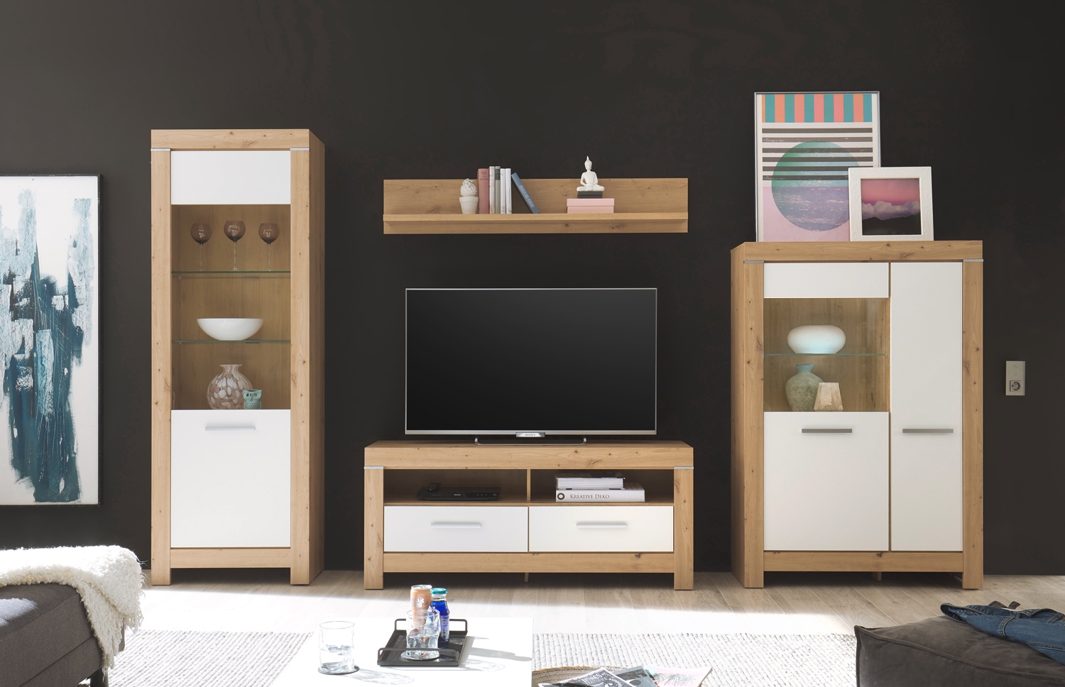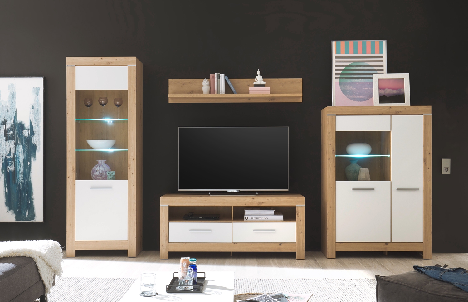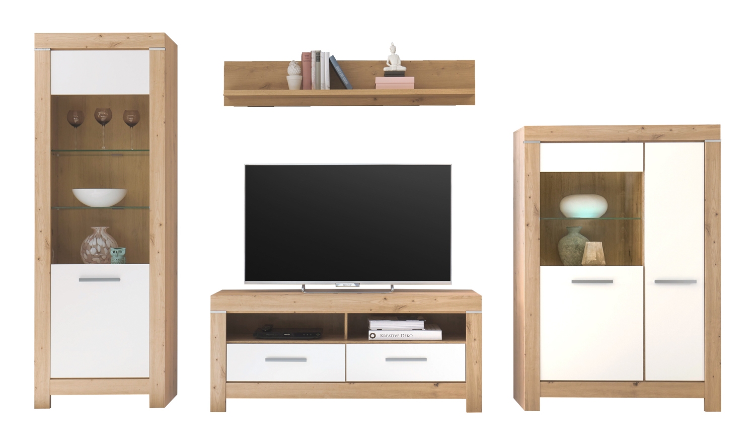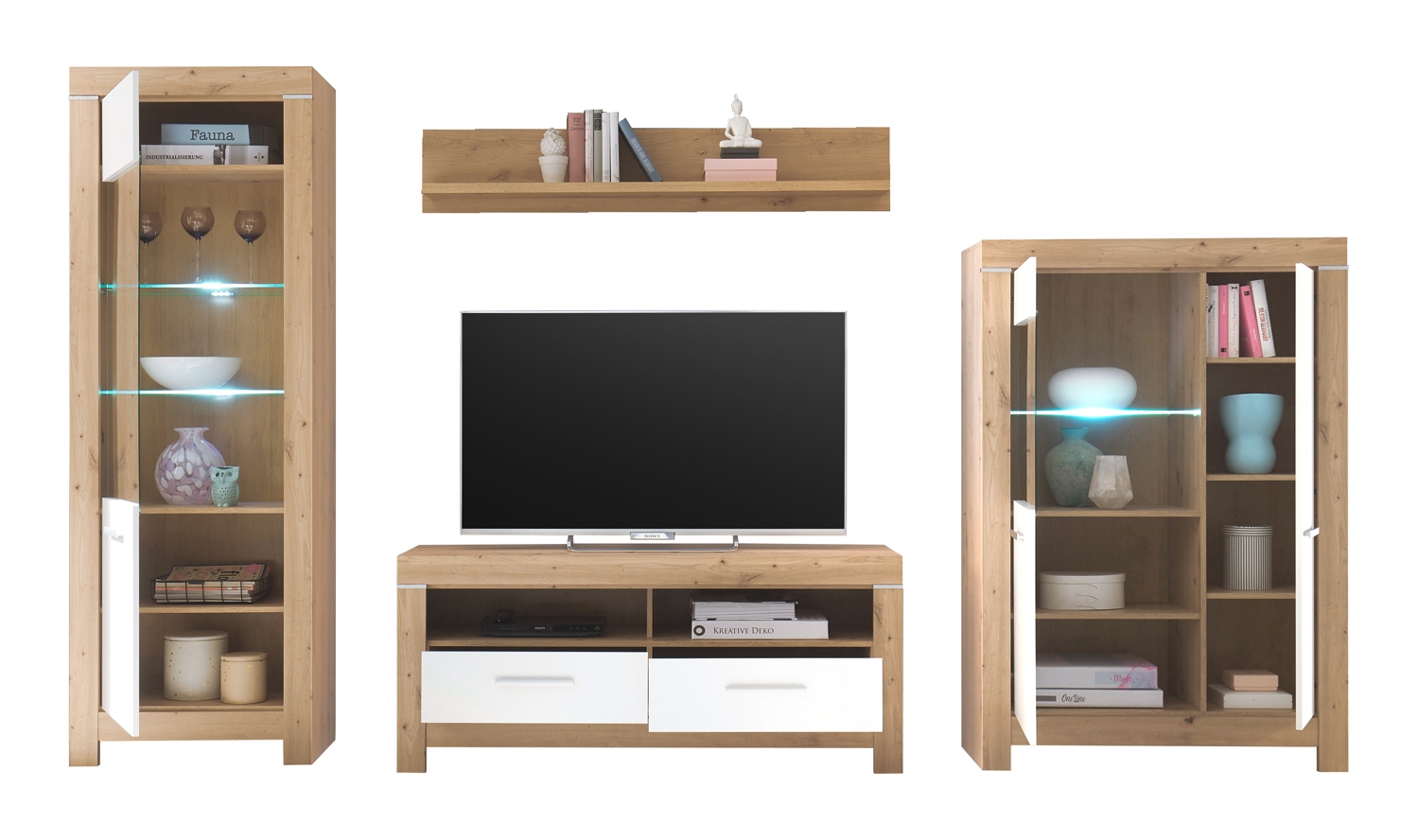 | Lieferumfang: | 4-teilige Wohnwand: 1 TV-Lowboard, 1 Vitrine, 1 Highboard, 1 Wandboard, 8 Einlegeböden und 3 Glasböden. Die LED-Beleuchtung ist enthalten |