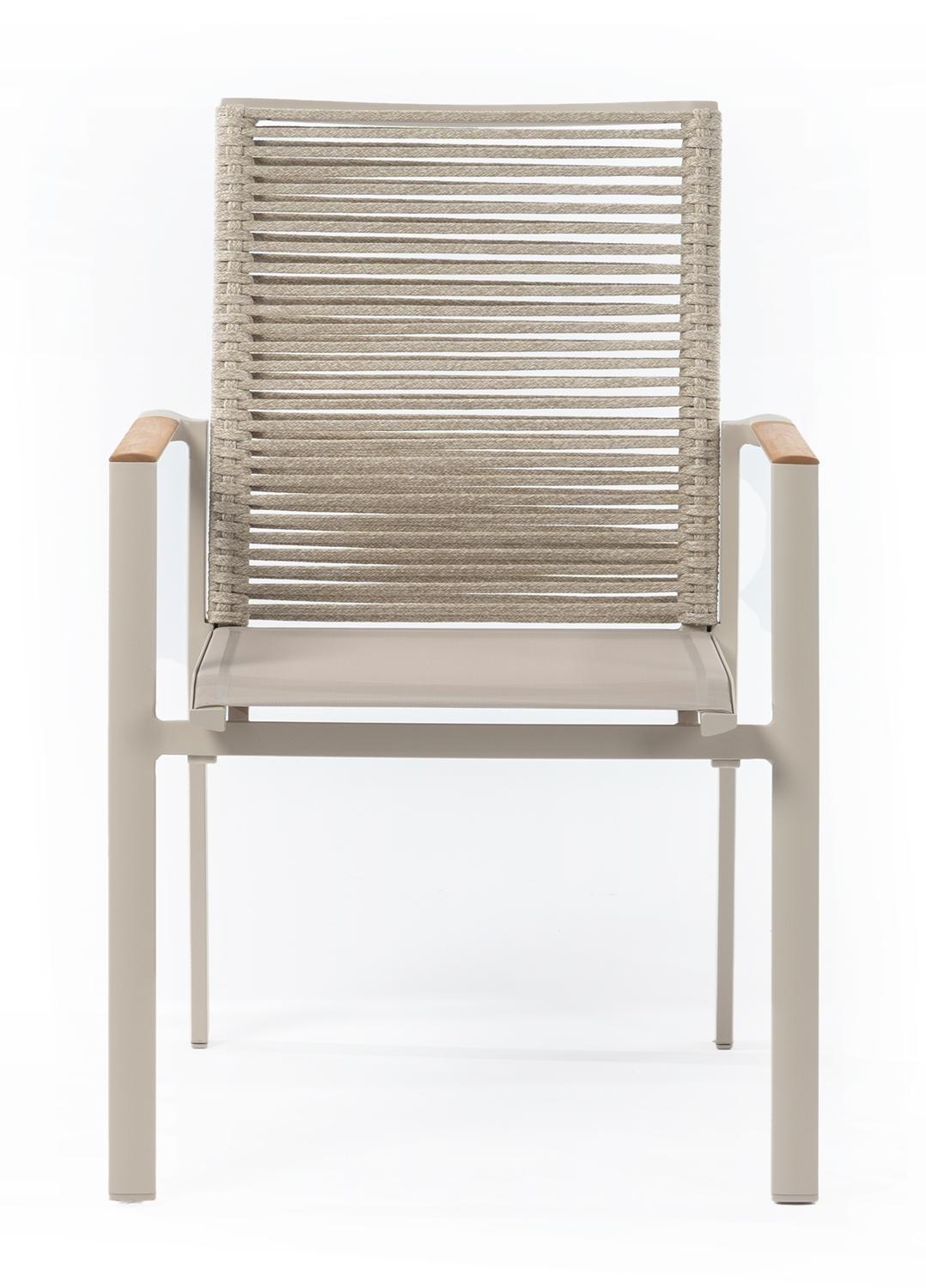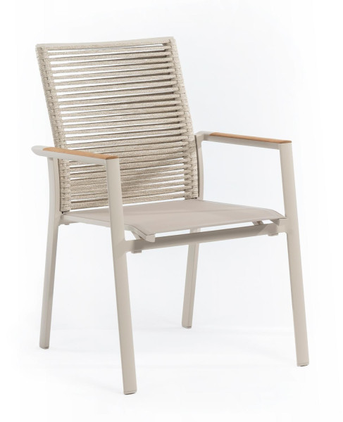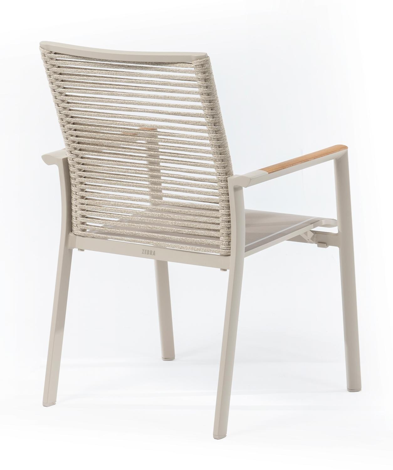 Der Gartenstuhl FLY ROPE der Marke Zebra ist mit einem Aluminiumgestell in hellem Taupe ausgestattet und verfügt über eine Rückenbespannung aus beigen Seilen. Dieser Terrassenstuhl weist eine Breite von 62 cm, eine Höhe von 91 cm sowie eine Tiefe von 65 cm auf. Die Armlehnen sind mit braunem Teakholz eingelassen, während die Sitzfläche aus beigem Textilen besteht. In seiner Konstruktion ist dieser Stapelstuhl so konzipiert, dass er sich platzsparend lagern lässt.