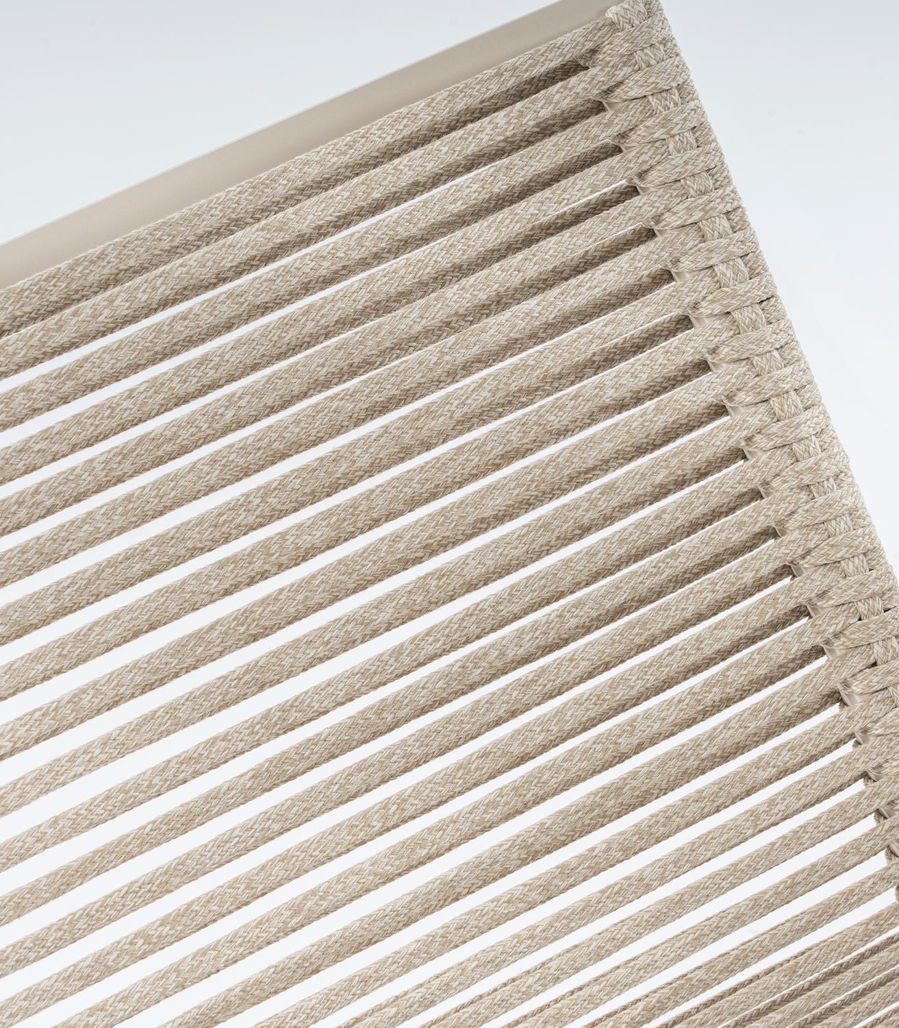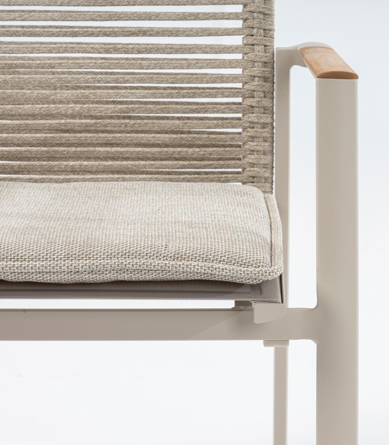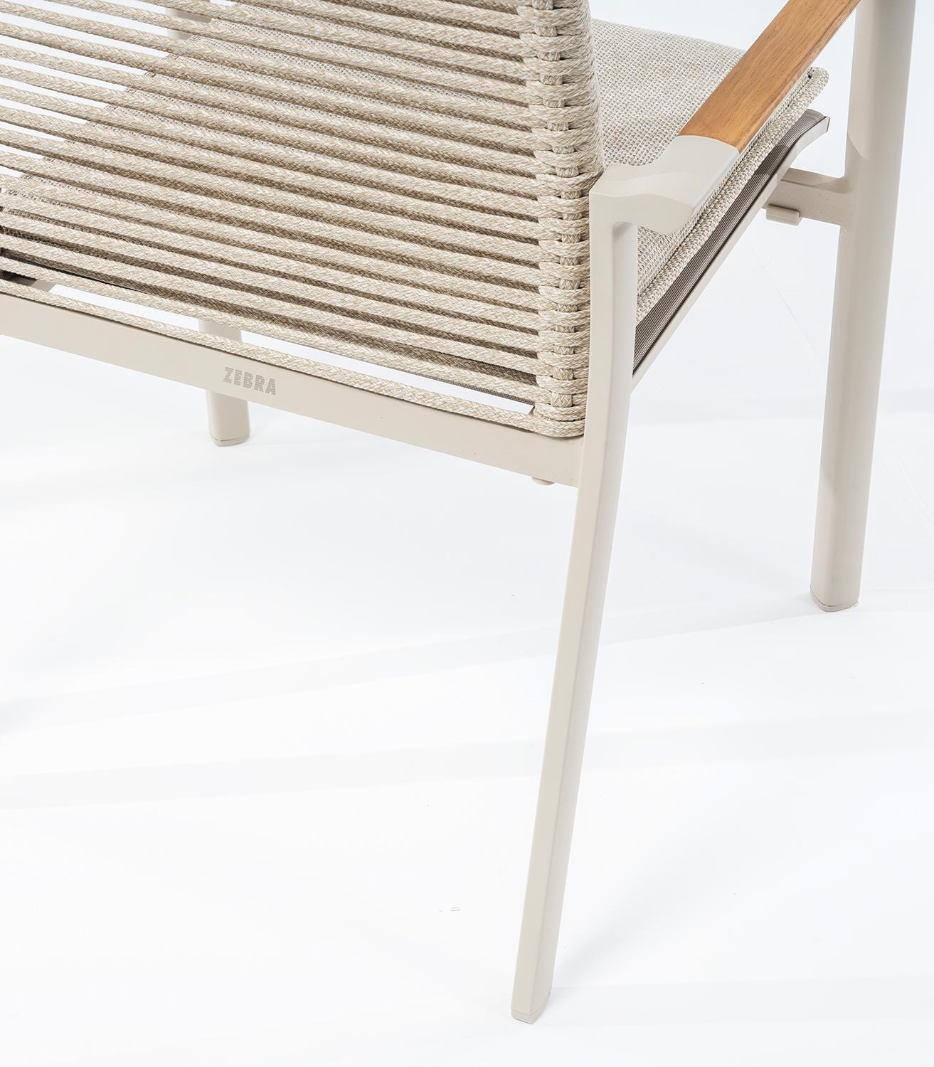 Der Gartenstuhl FLY ROPE der Marke Zebra ist mit einem Aluminiumgestell in hellem Taupe ausgestattet und verfügt über eine Rückenbespannung aus beigen Seilen. Dieser Terrassenstuhl weist eine Breite von 62 cm, eine Höhe von 91 cm sowie eine Tiefe von 65 cm auf. Die Armlehnen sind mit braunem Teakholz eingelassen, während die Sitzfläche aus beigem Textilen besteht. In seiner Konstruktion ist dieser Stapelstuhl so konzipiert, dass er sich platzsparend lagern lässt.