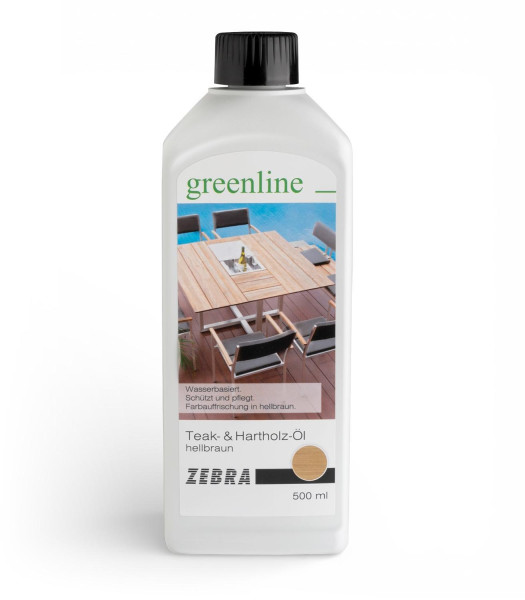 Das Pflegeöl GREENLINE der Marke Zebra dient der Pflege und Instandhaltung von Teak- und Hartholzflächen im Außenbereich. Dieses auf Wasser basierende Holzpflegemittel wird in einer Flasche mit einem Fassungsvermögen von 500 ml geliefert. Durch die Anwendung erfährt vergrautes Massivholz eine Auffrischung in den Farbton Hellbraun. Das Schutzmittel eignet sich für den Einsatz auf Gartenmöbeln, Gartenhäusern und Massivholzbeeten sowie auf Terrassen und Balkonen mit Holzelementen.