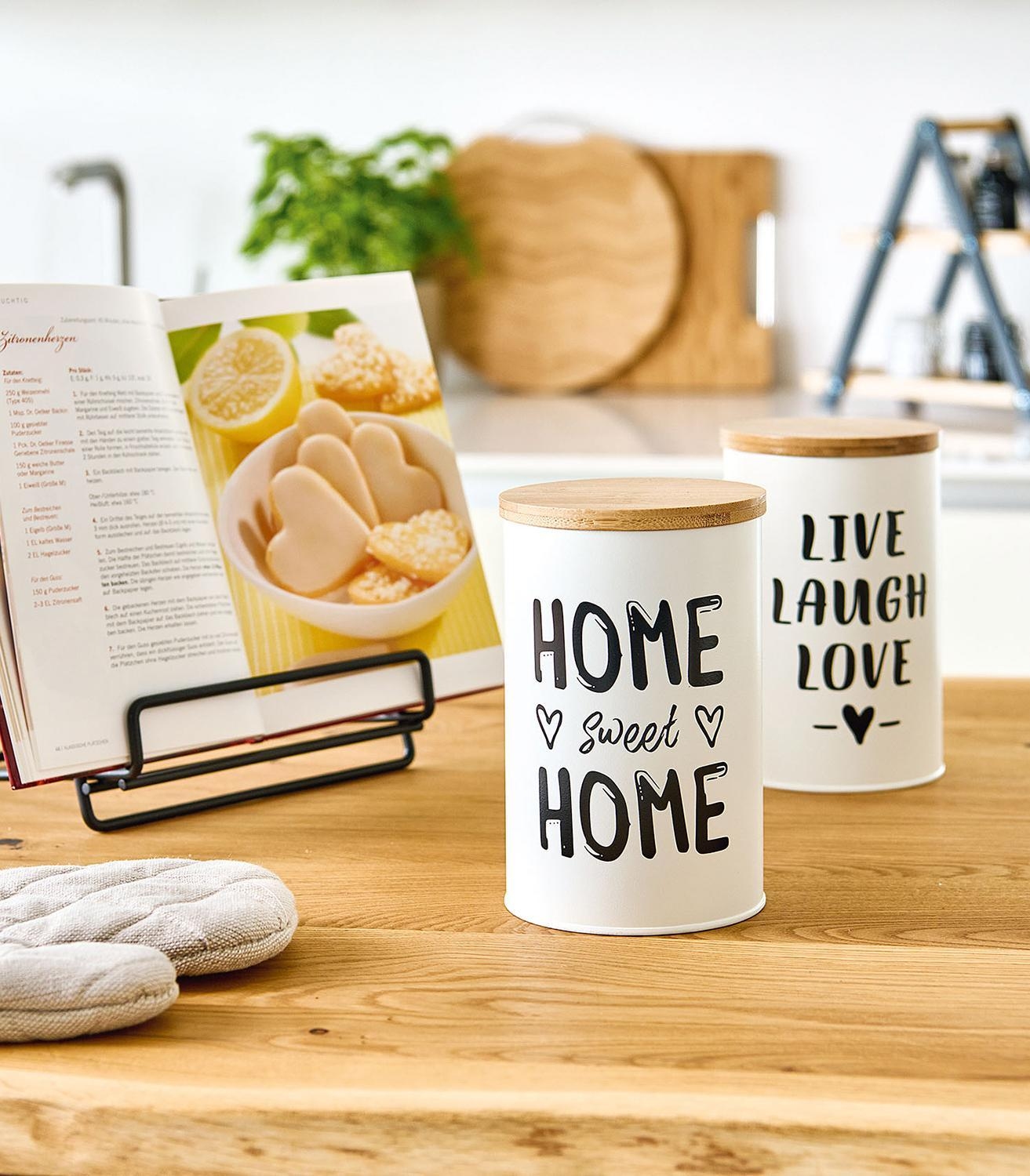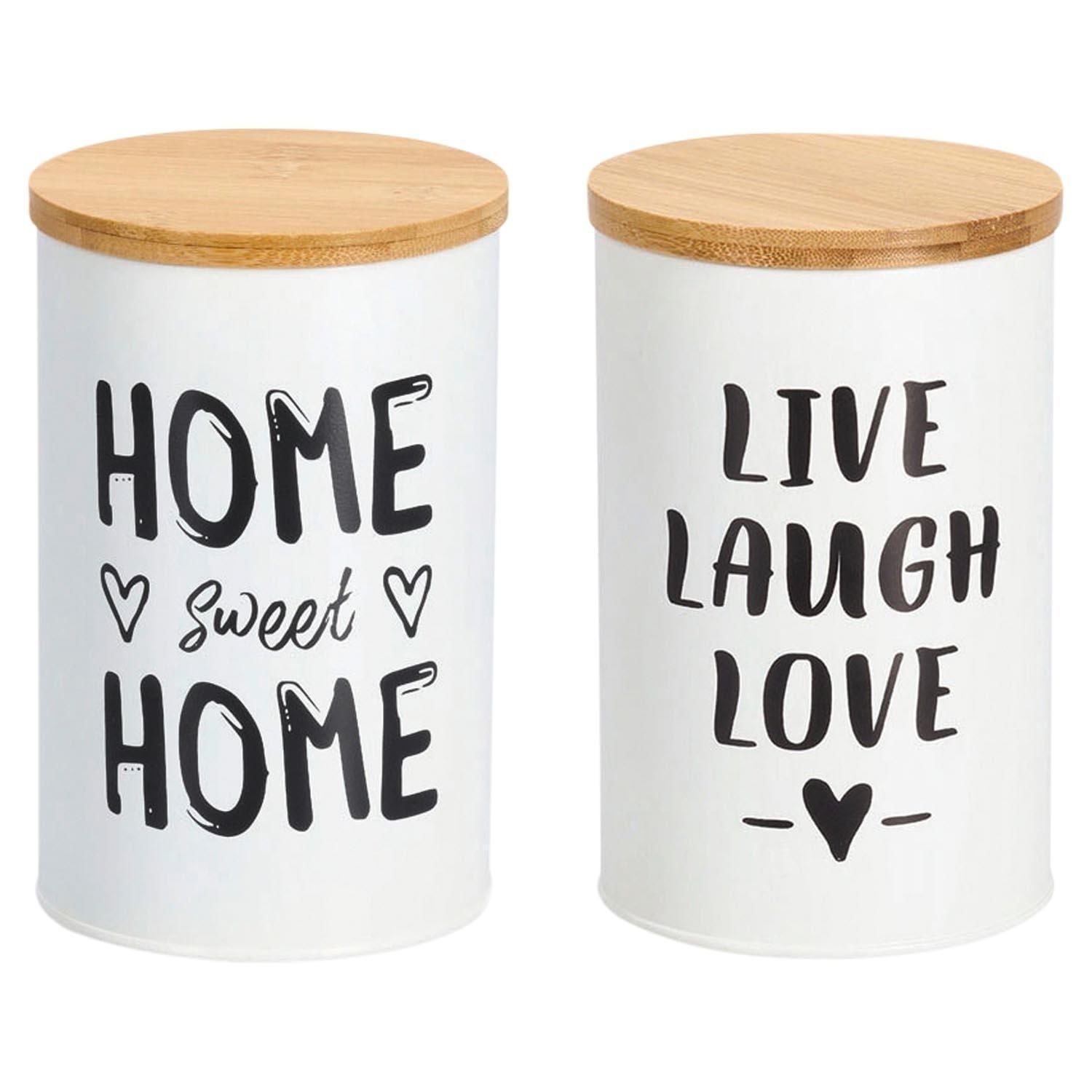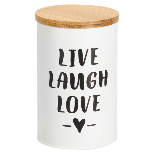 Die Vorratsdose ANAELA von Zeller ist eine stilvolle Aufbewahrungslösung für Ihre Küche. Gefertigt aus weißem Metall, bietet sie mit einem braunen Deckel aus Bambusholz eine natürliche Optik. Der schwarze Schriftzug "Live Laugh Love" verleiht der Dose eine charmante Note. Mit einem Fassungsvermögen von 1000 ml eignet sie sich ideal für die Aufbewahrung von Reis, Quinoa, Linsen, Haferflocken und mehr. Die Dose hat einen Durchmesser von 10,5 cm und eine Höhe von 16,5 cm.